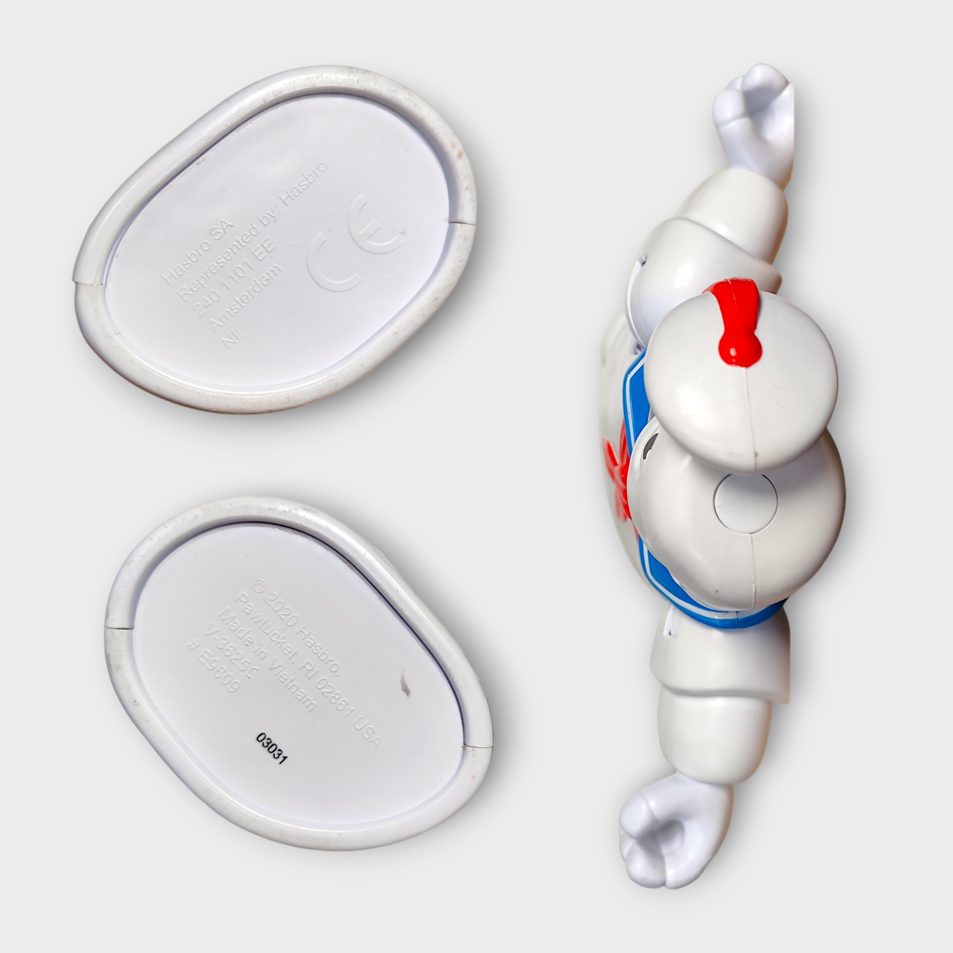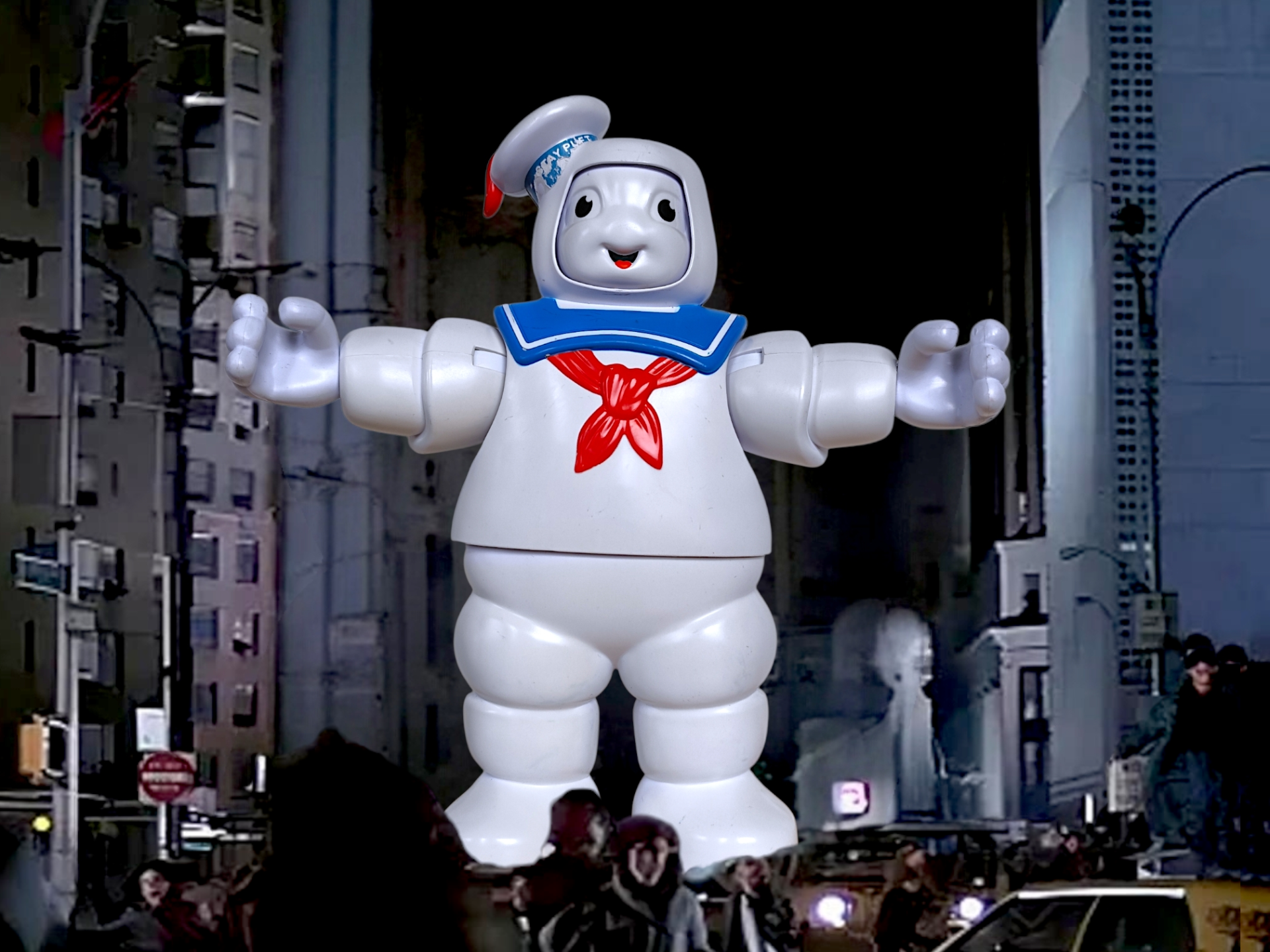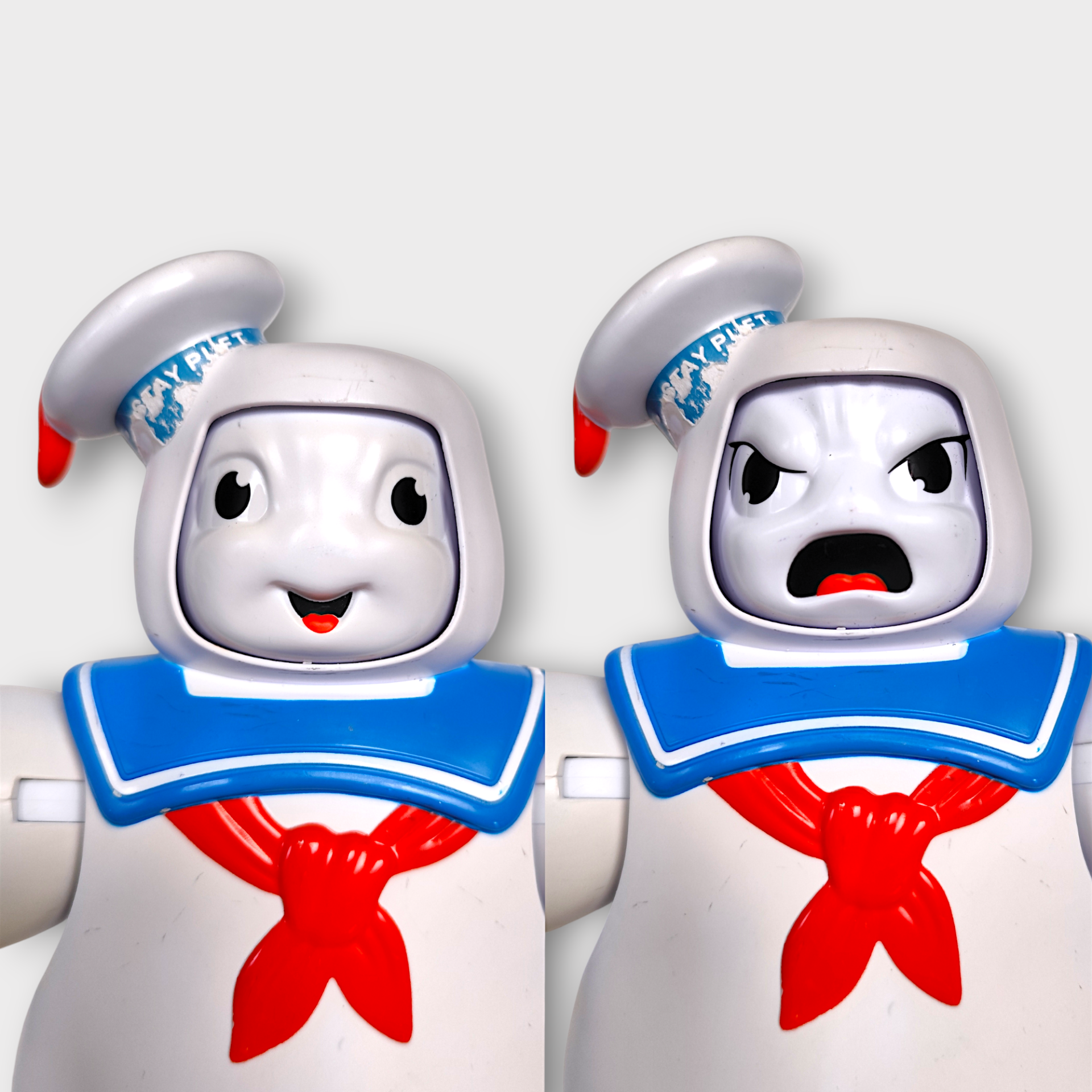 A large nostalgic Stay Puft Marshmallow Man figure from Ghostbusters. The figure is manufactured by Hasbro in 2020. When you press the button on the hat, the figure changes facial expressions. Perfect for collectors of nostalgic toys.