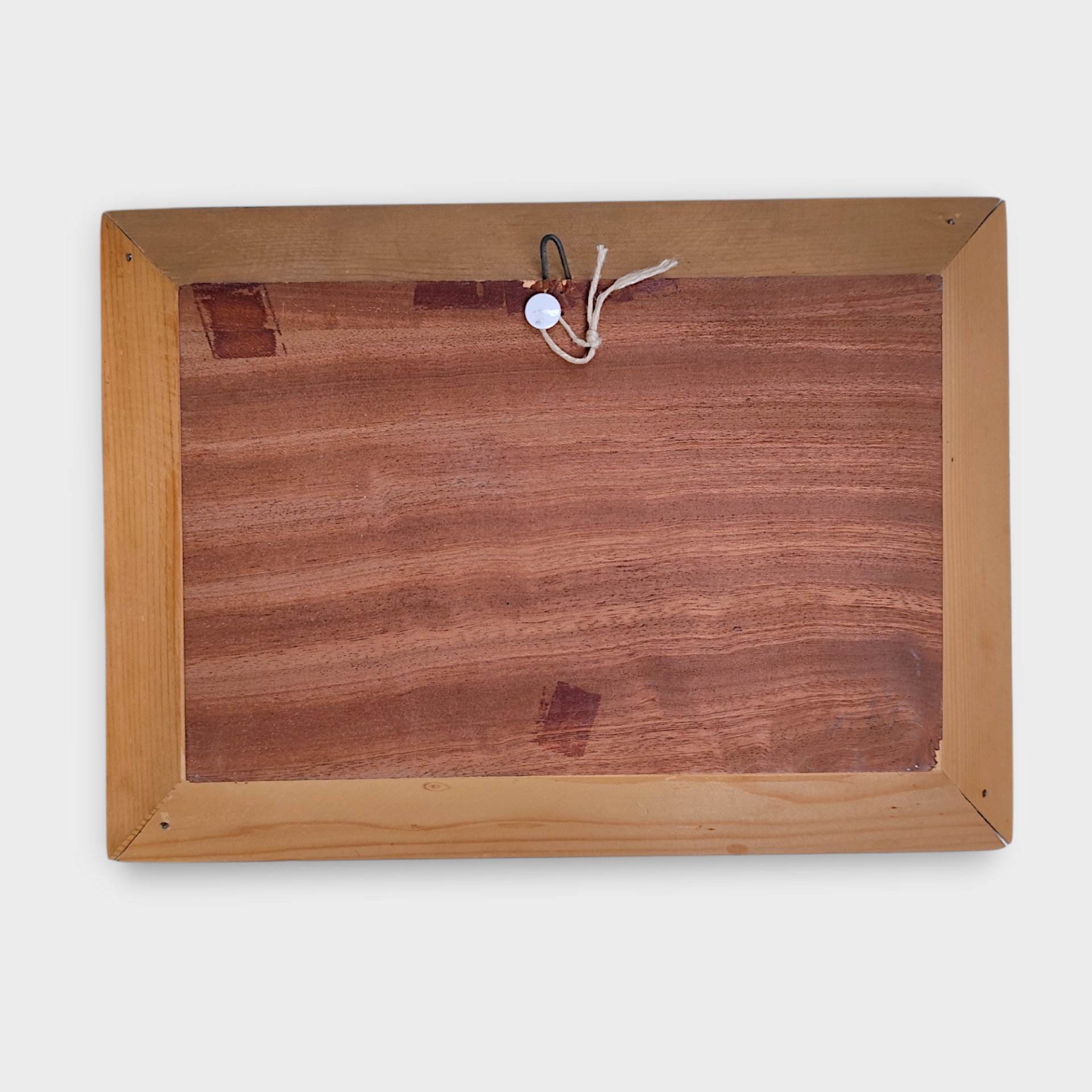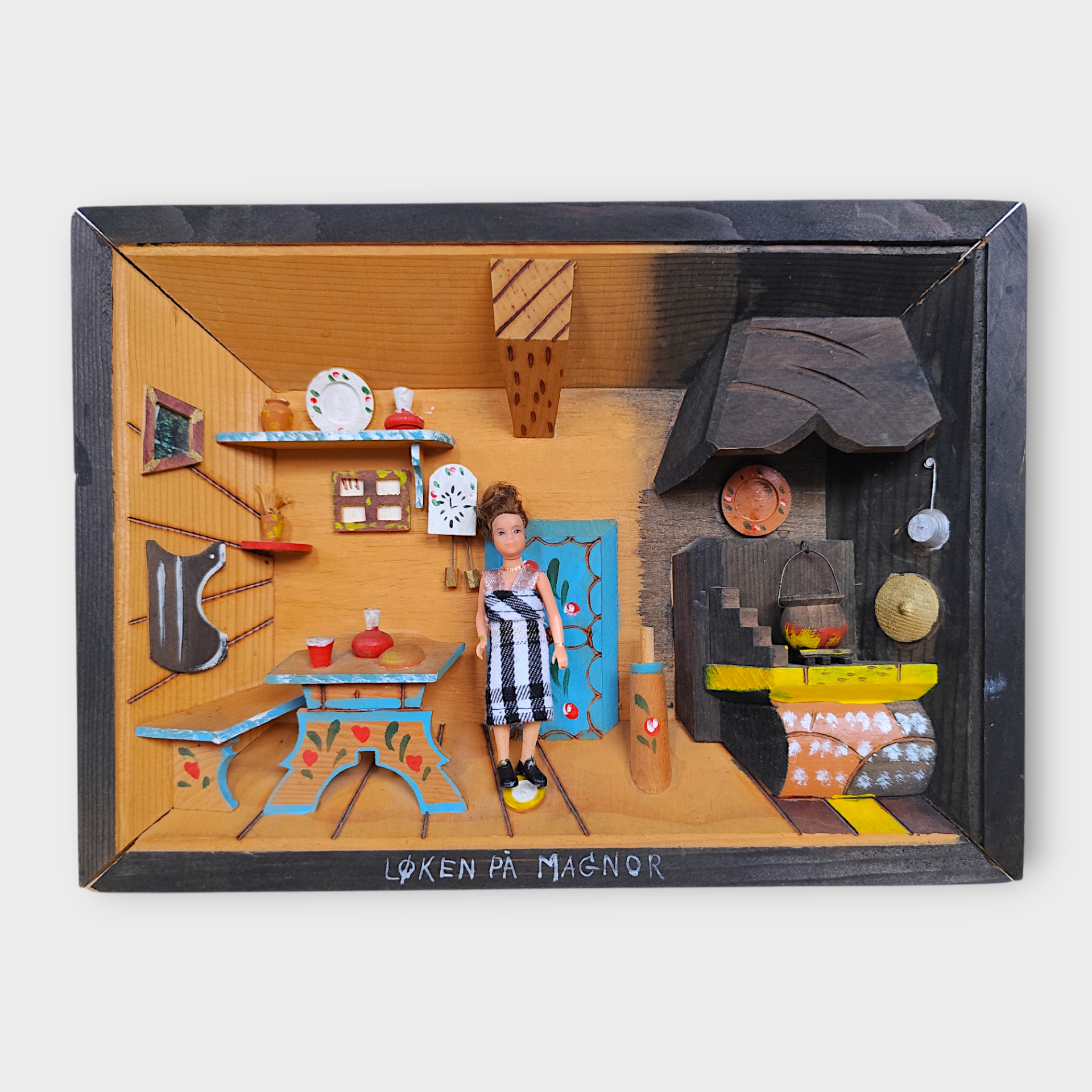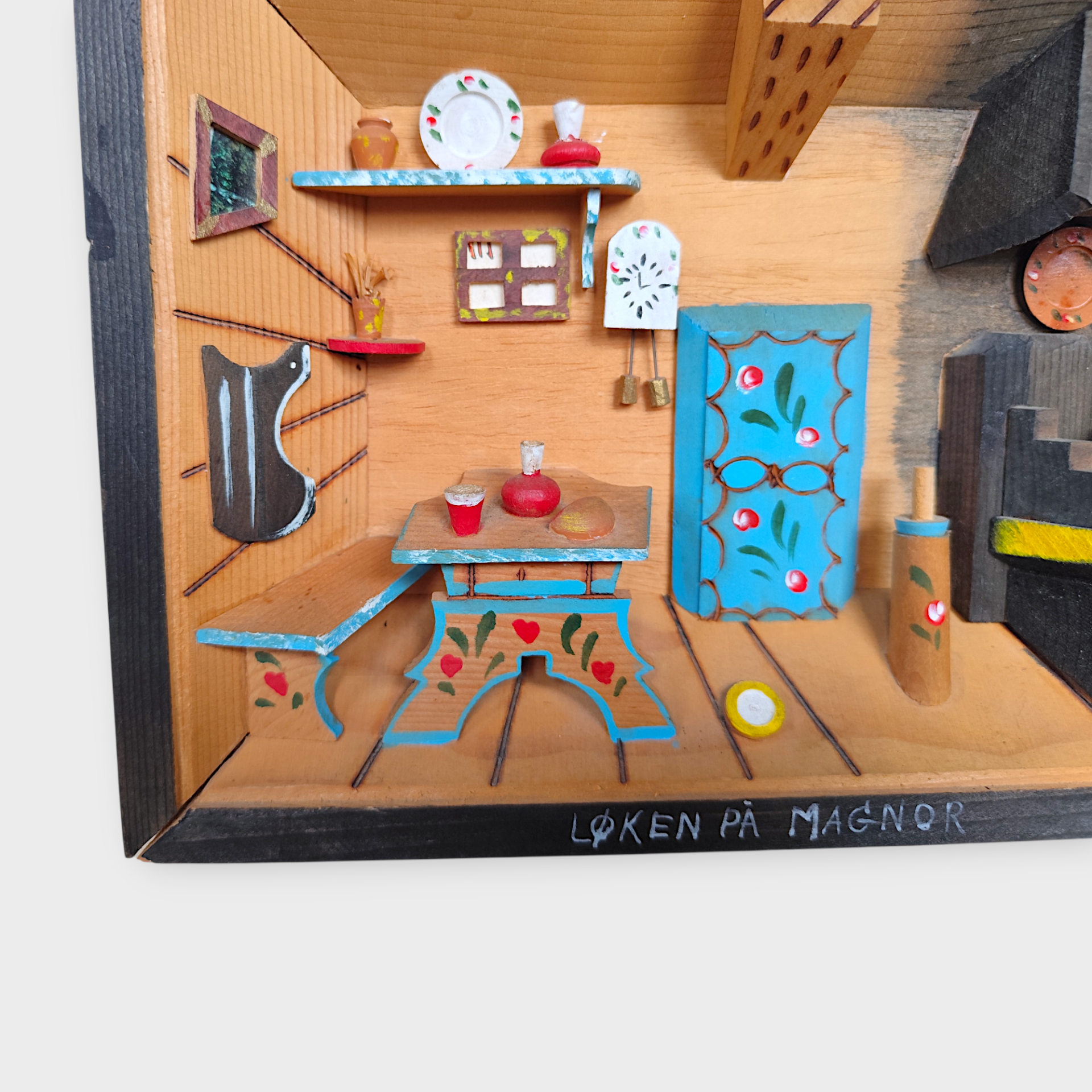 A handmade wooden painting depicting an interior from Løken på Magnor. Probably created by a Norwegian man named Per Løken. A unique interior detail that can be used as a painting or as a background in a dollhouse.