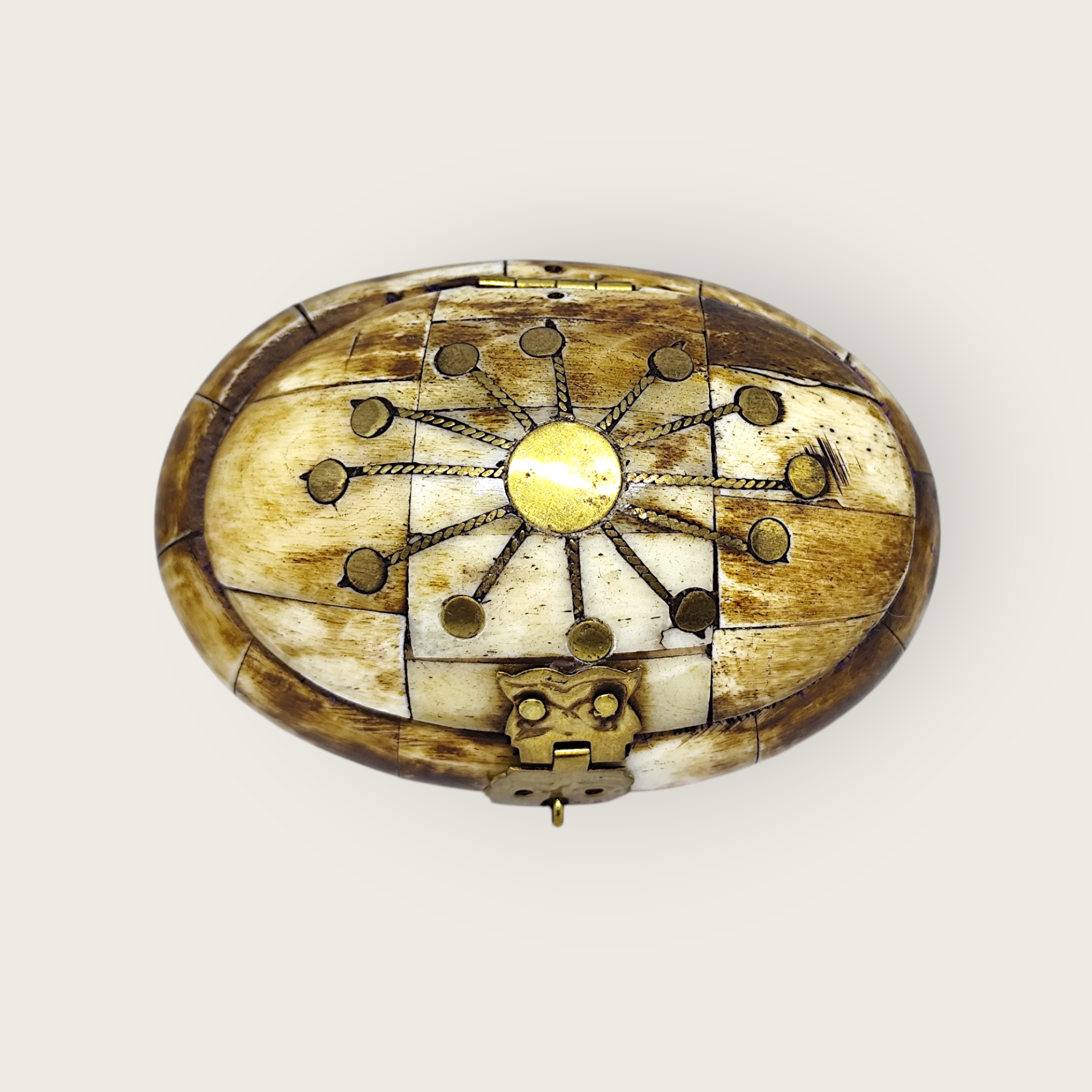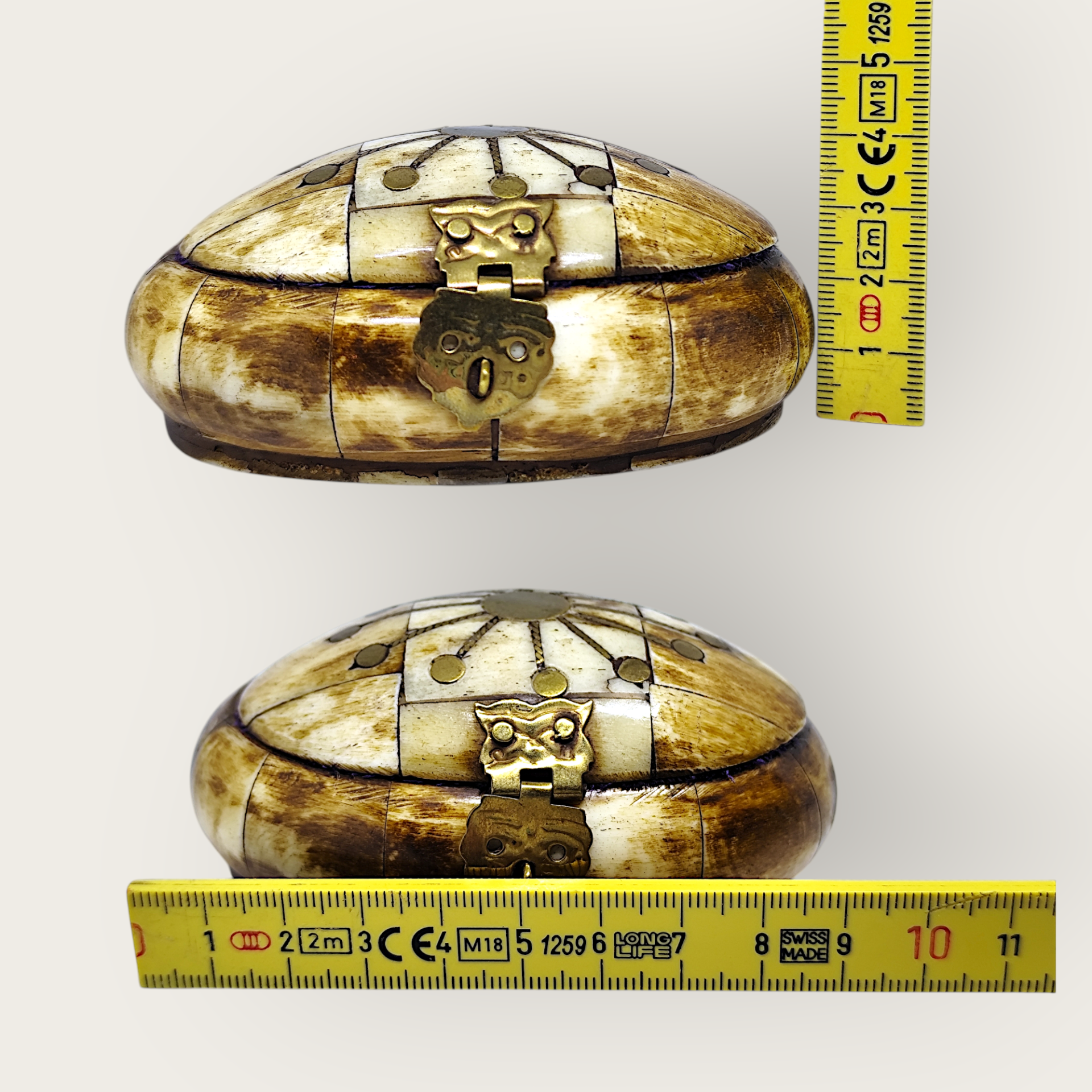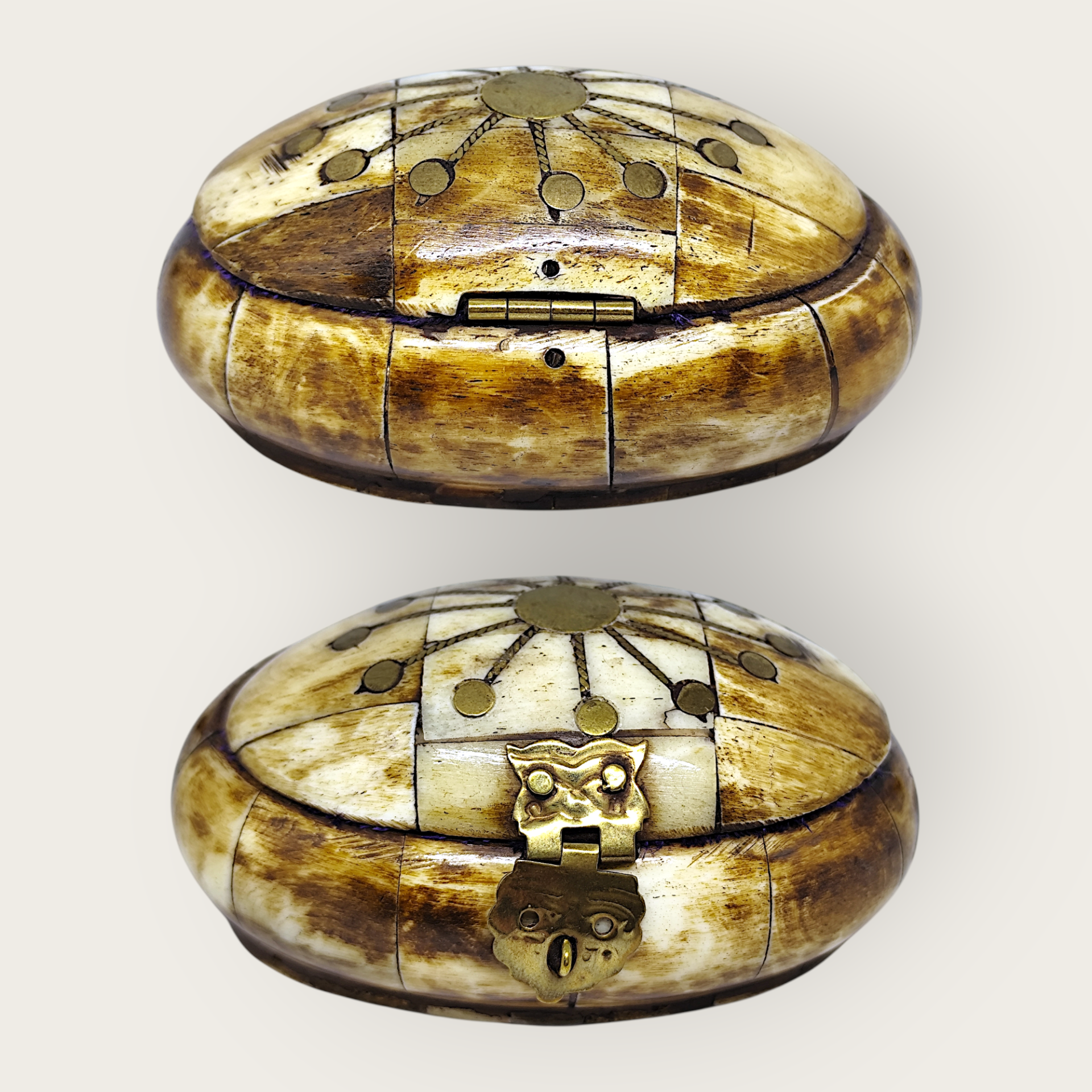 A handmade lure box made of bone-like material with bronze inlays. From the first half of the 20th century.