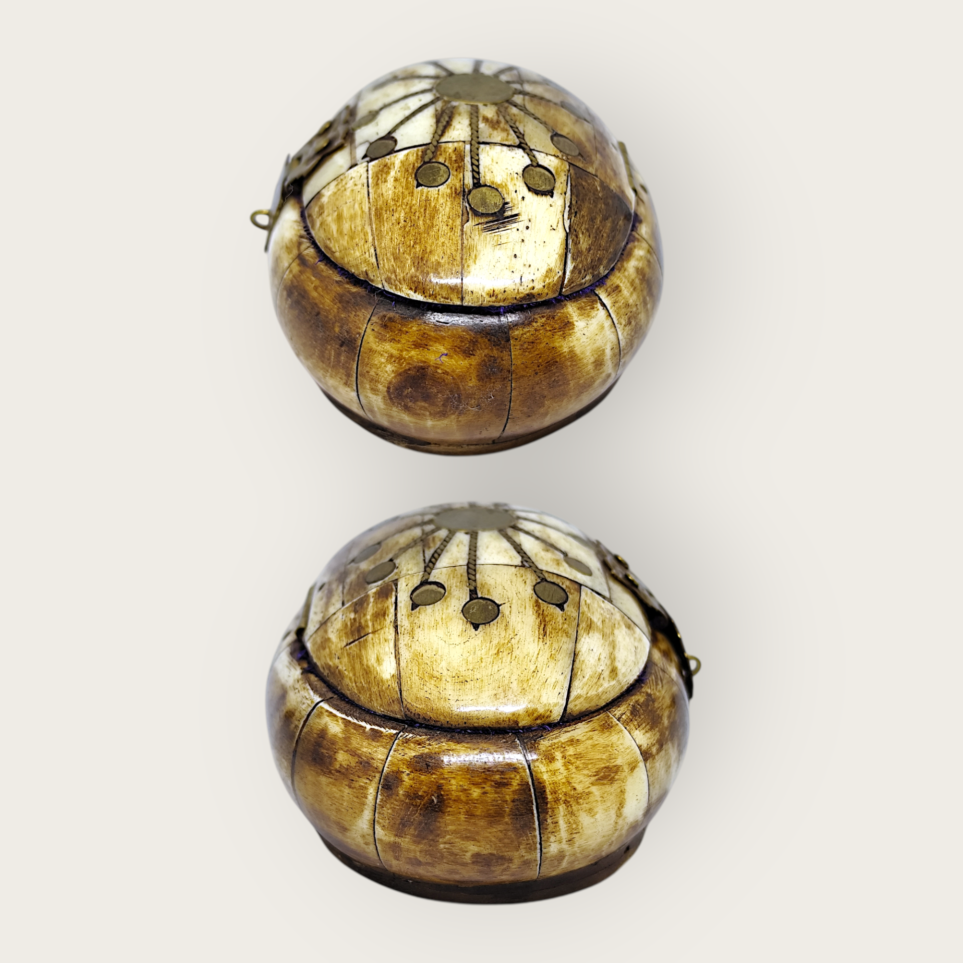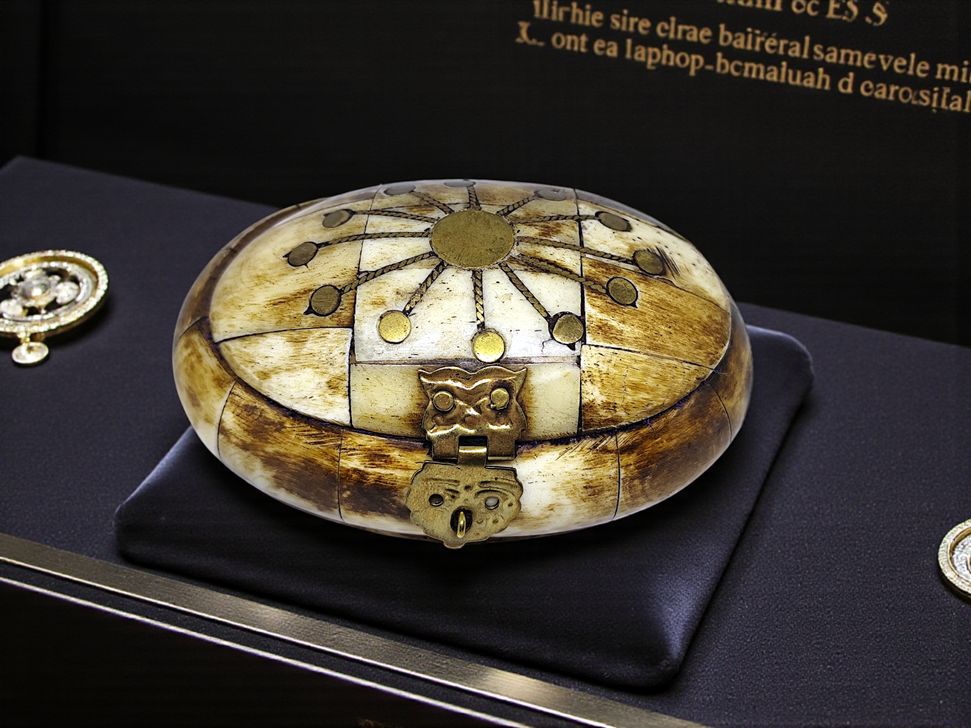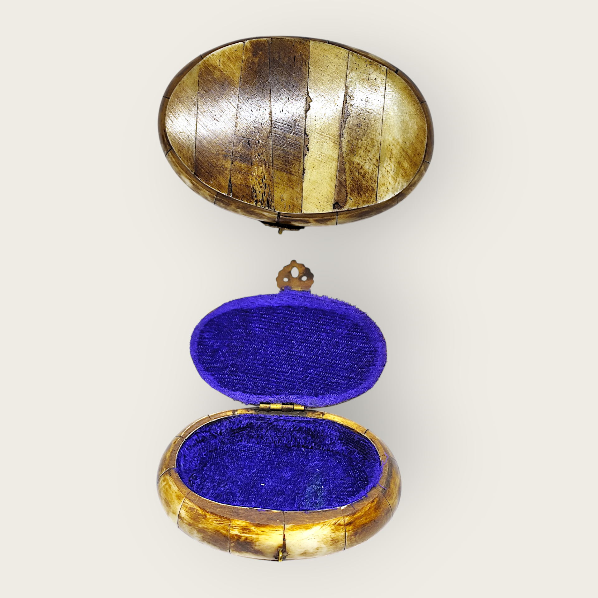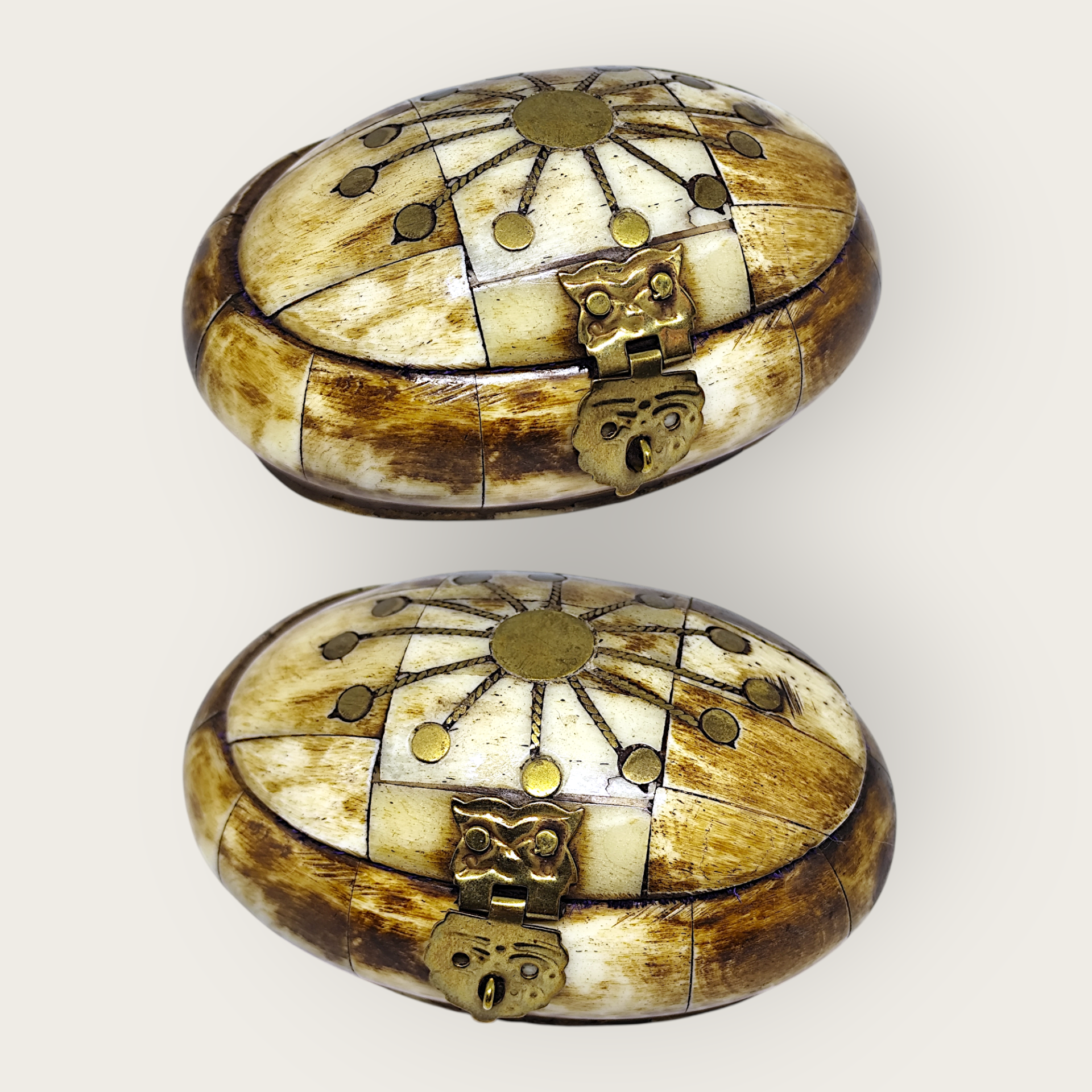 A handmade lure box made of bone-like material with bronze inlays. From the first half of the 20th century.