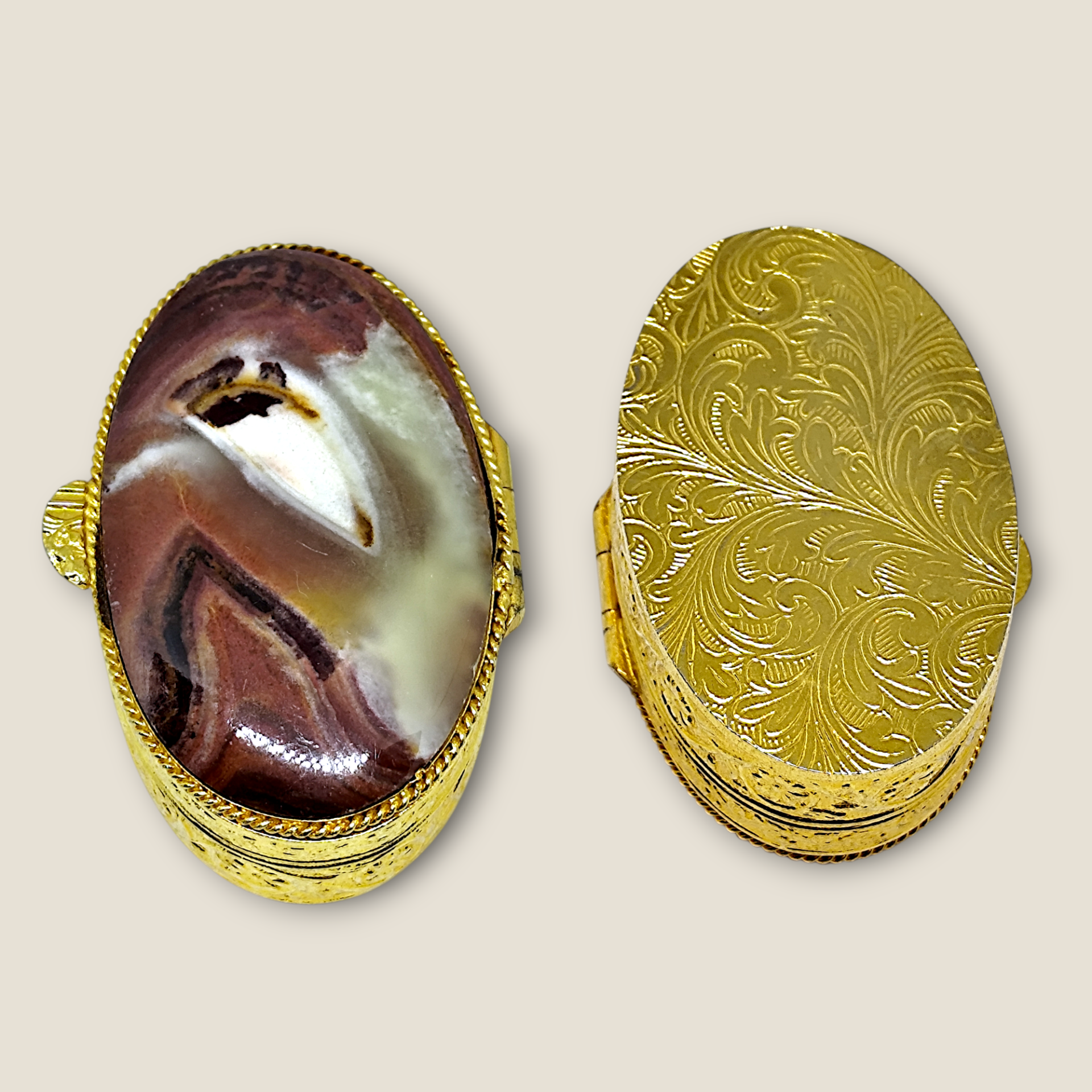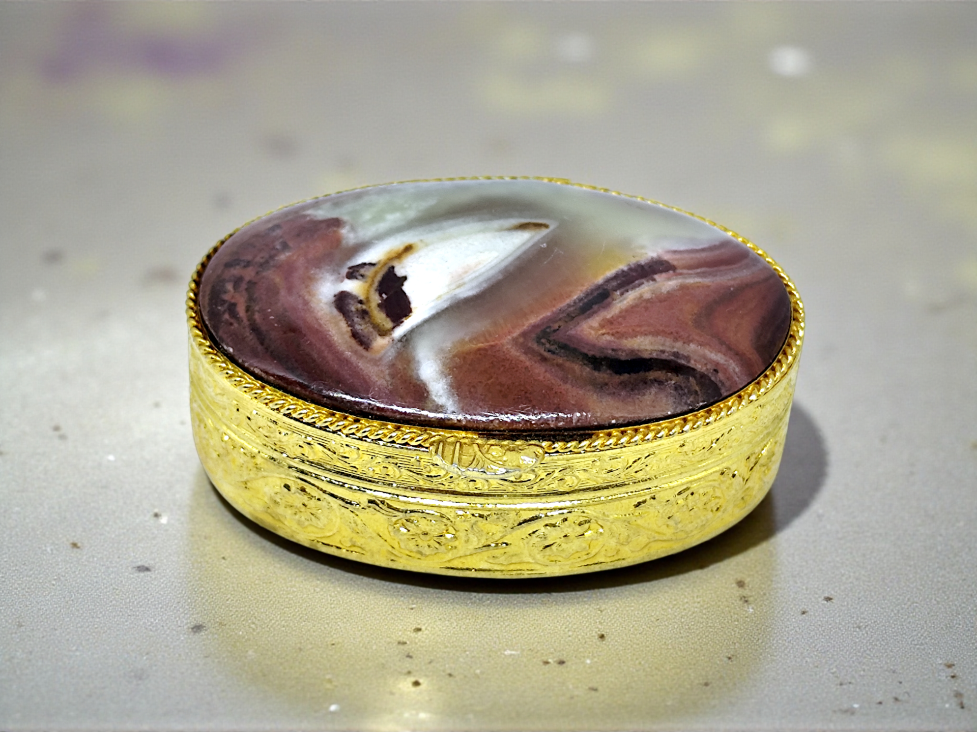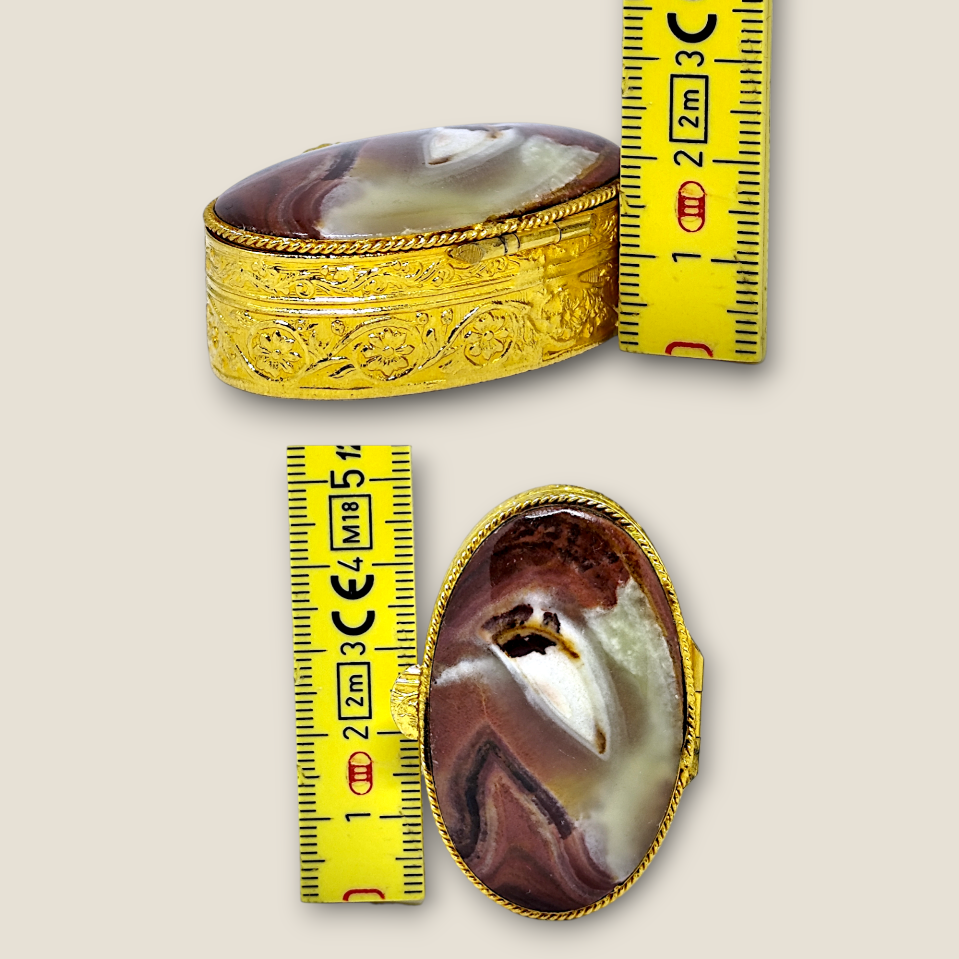 A small older box made of Agate and yellow metal. Elegant and decorative. Perfect for small items or to keep medicine in.