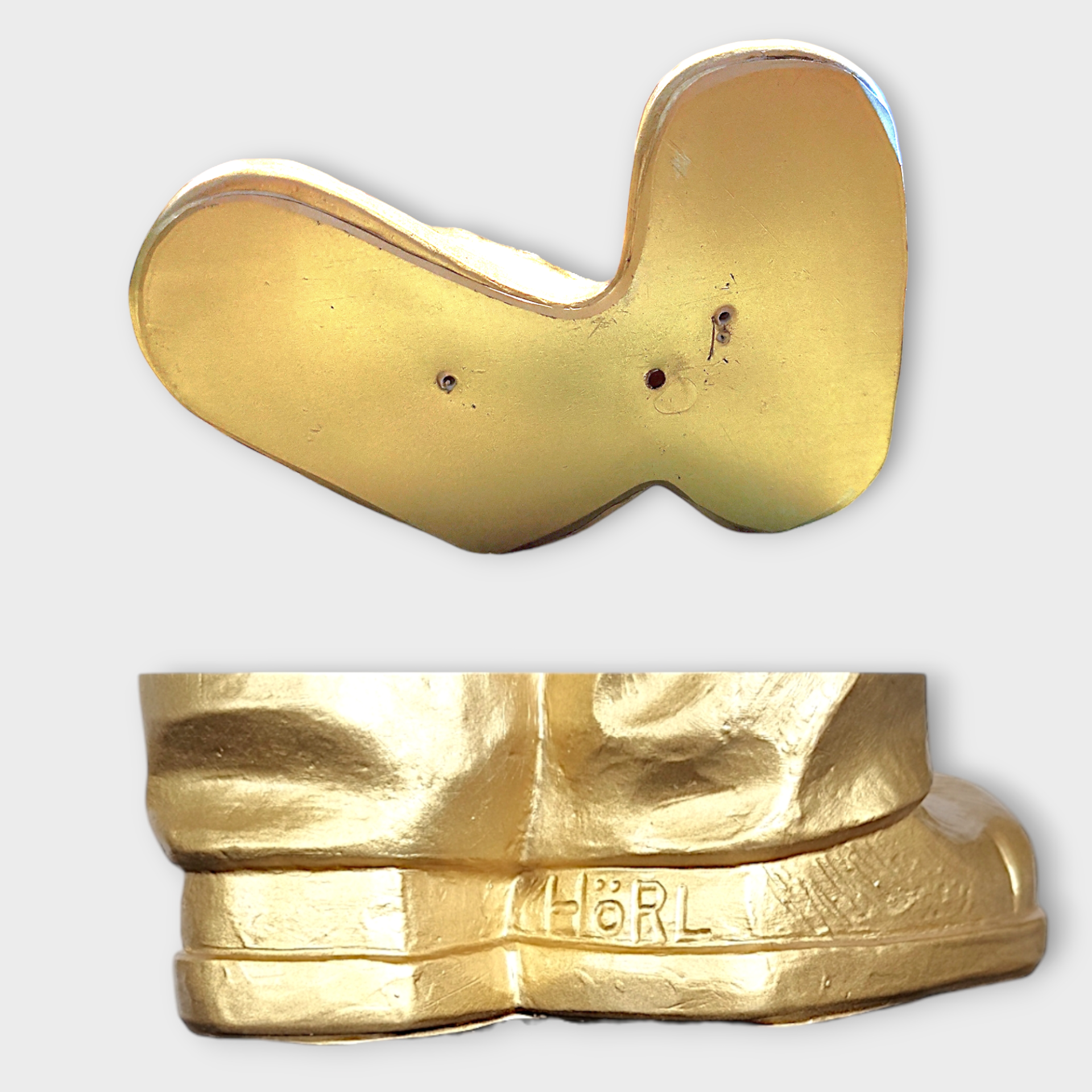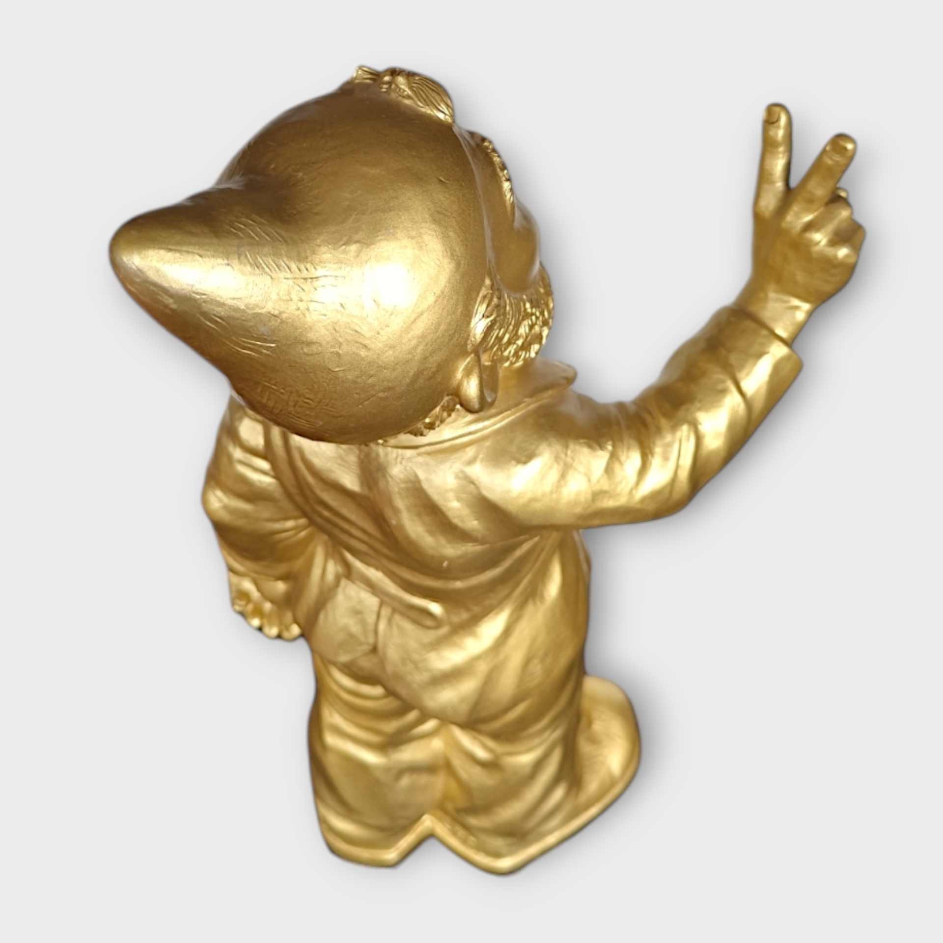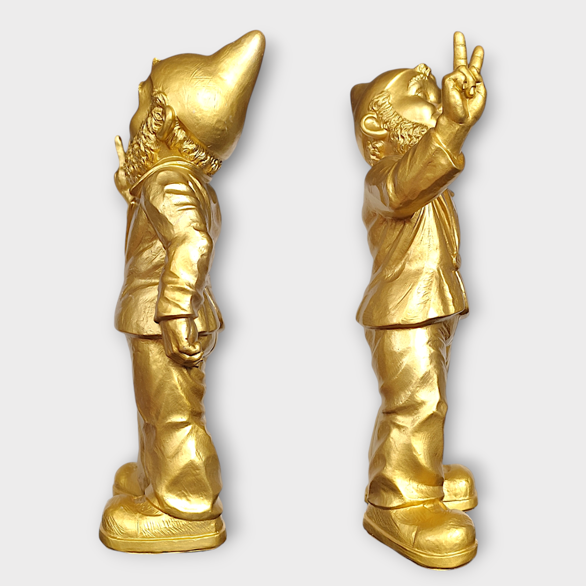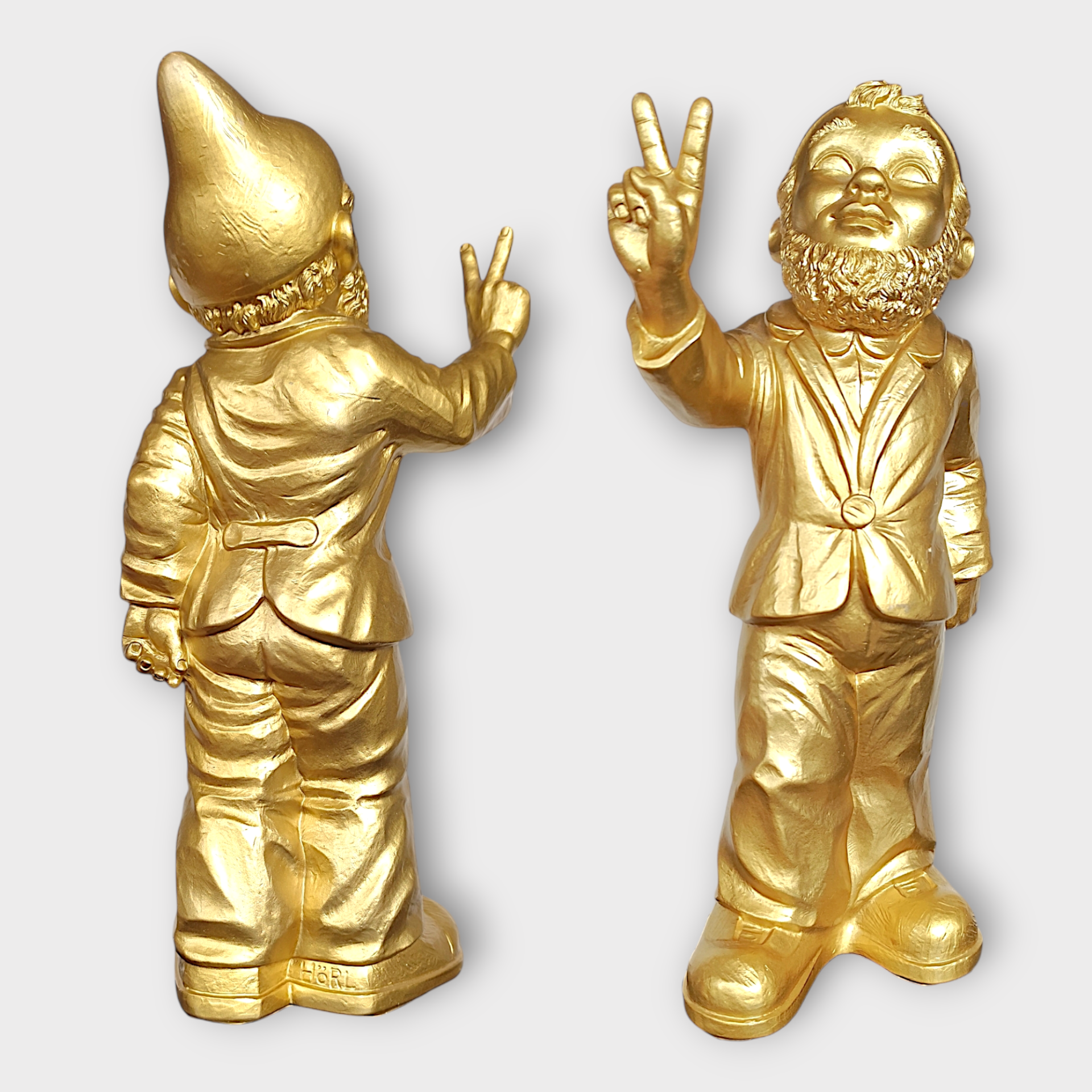 A 40 cm vintage bearded golden gnome making the victory sign. German artist Ottmar Hörl created the golden gnome sculpture