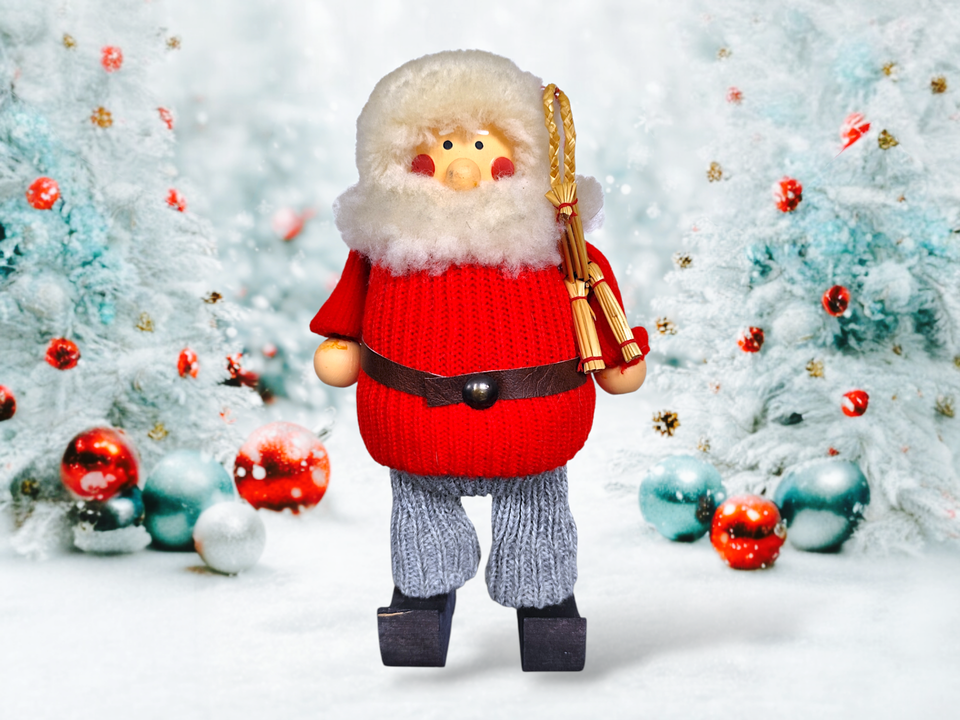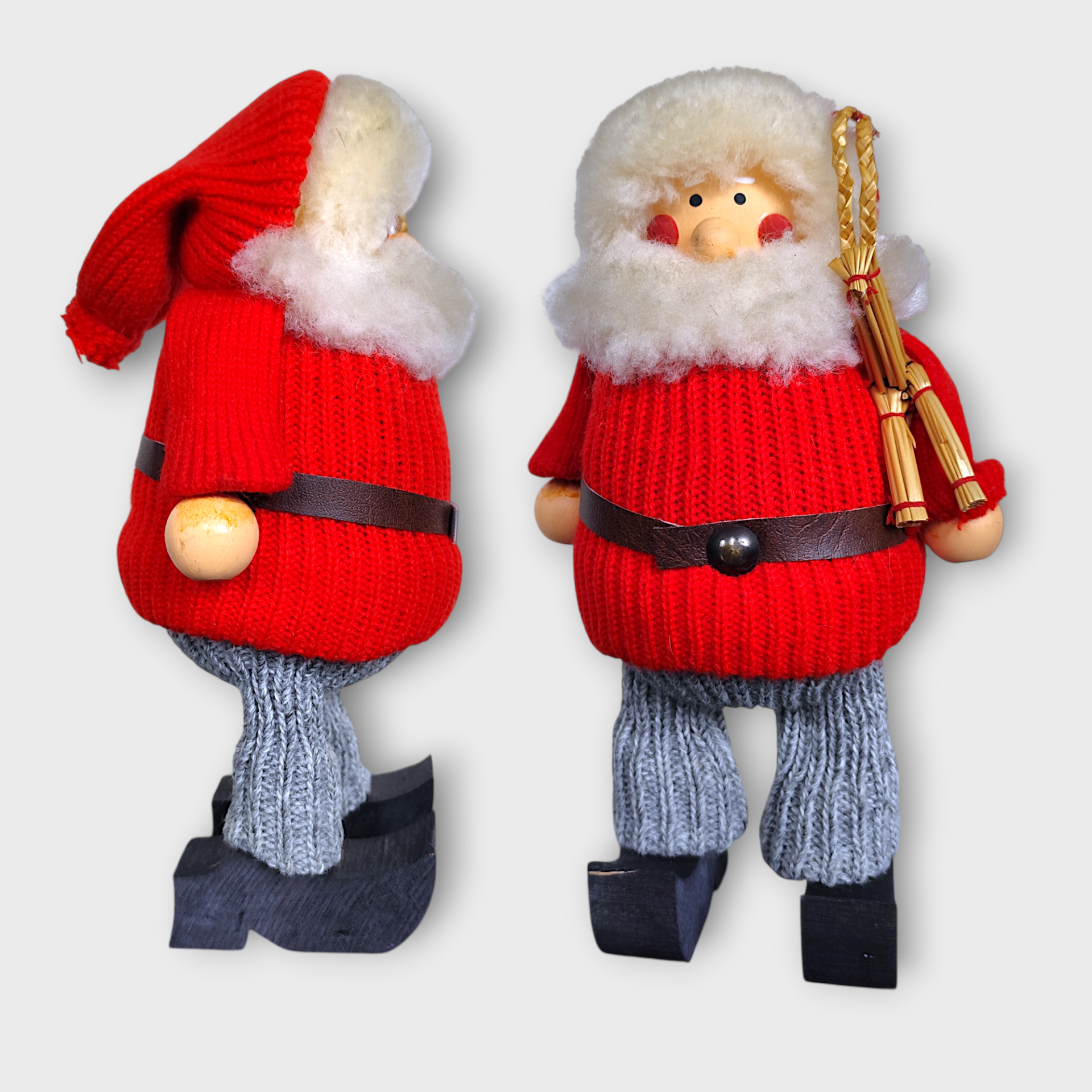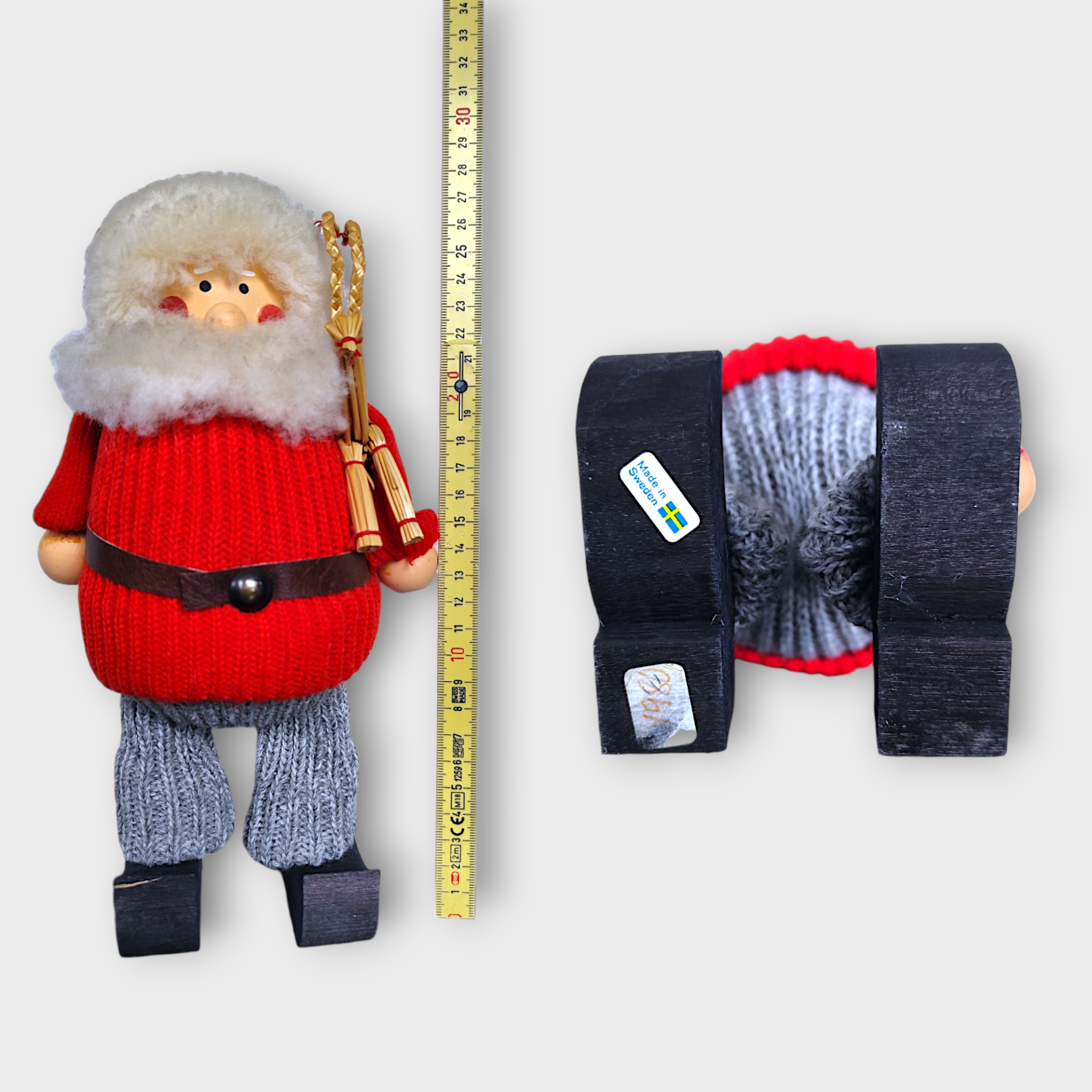 A vintage wooden Santa with a Christmas goat under his arm. A unique and authentic collector's item from LJUNGSTRÖMS. The Santa is Handmade in Sweden.