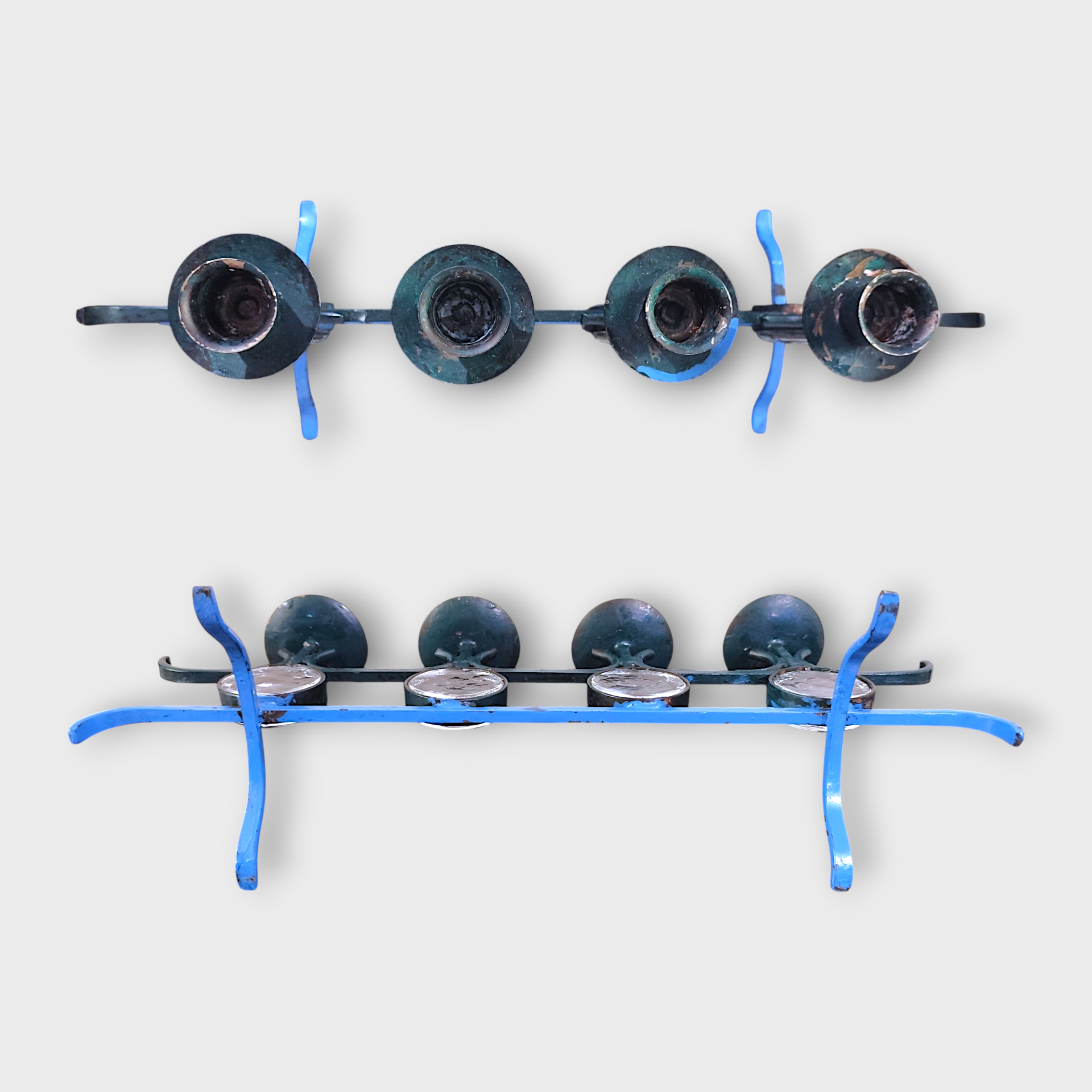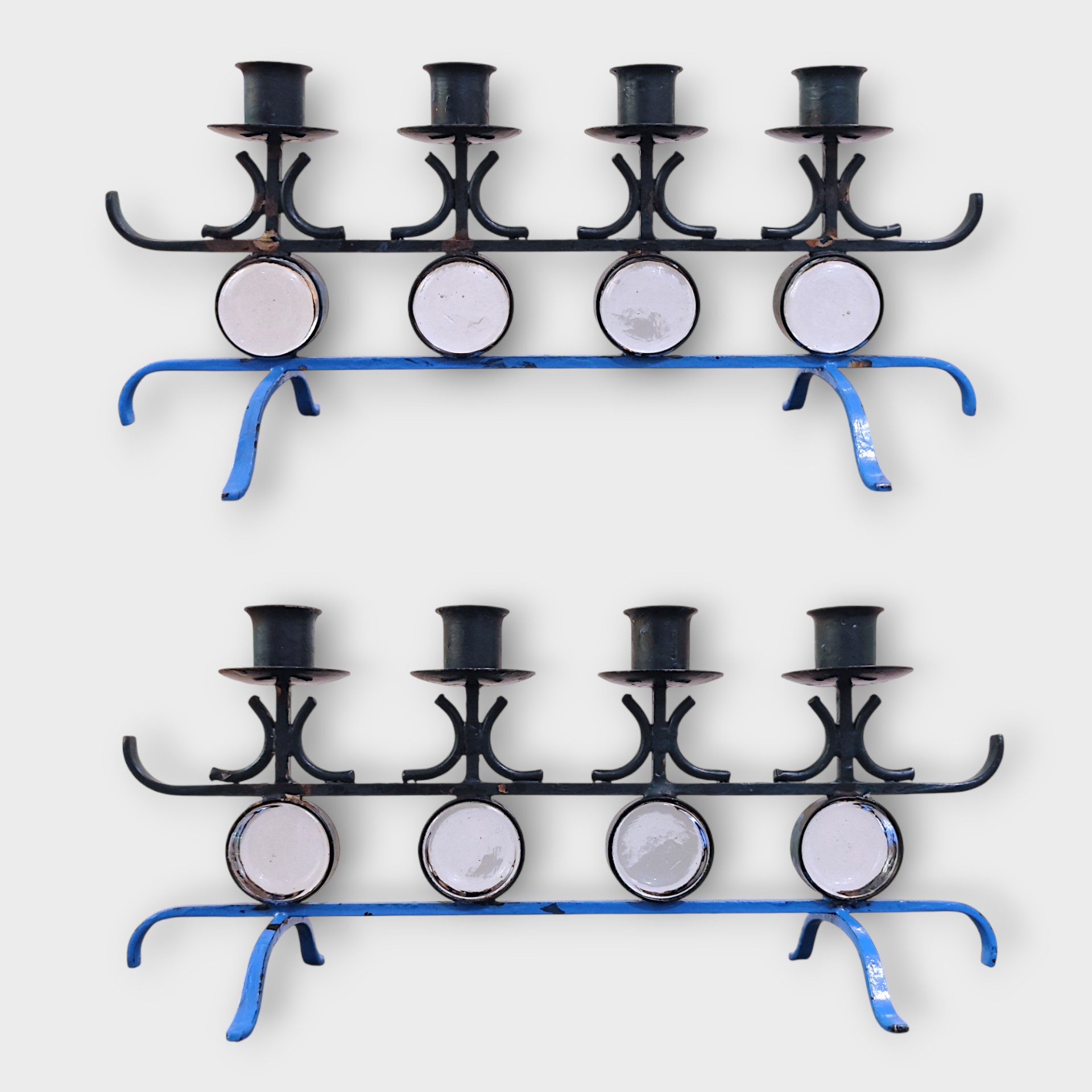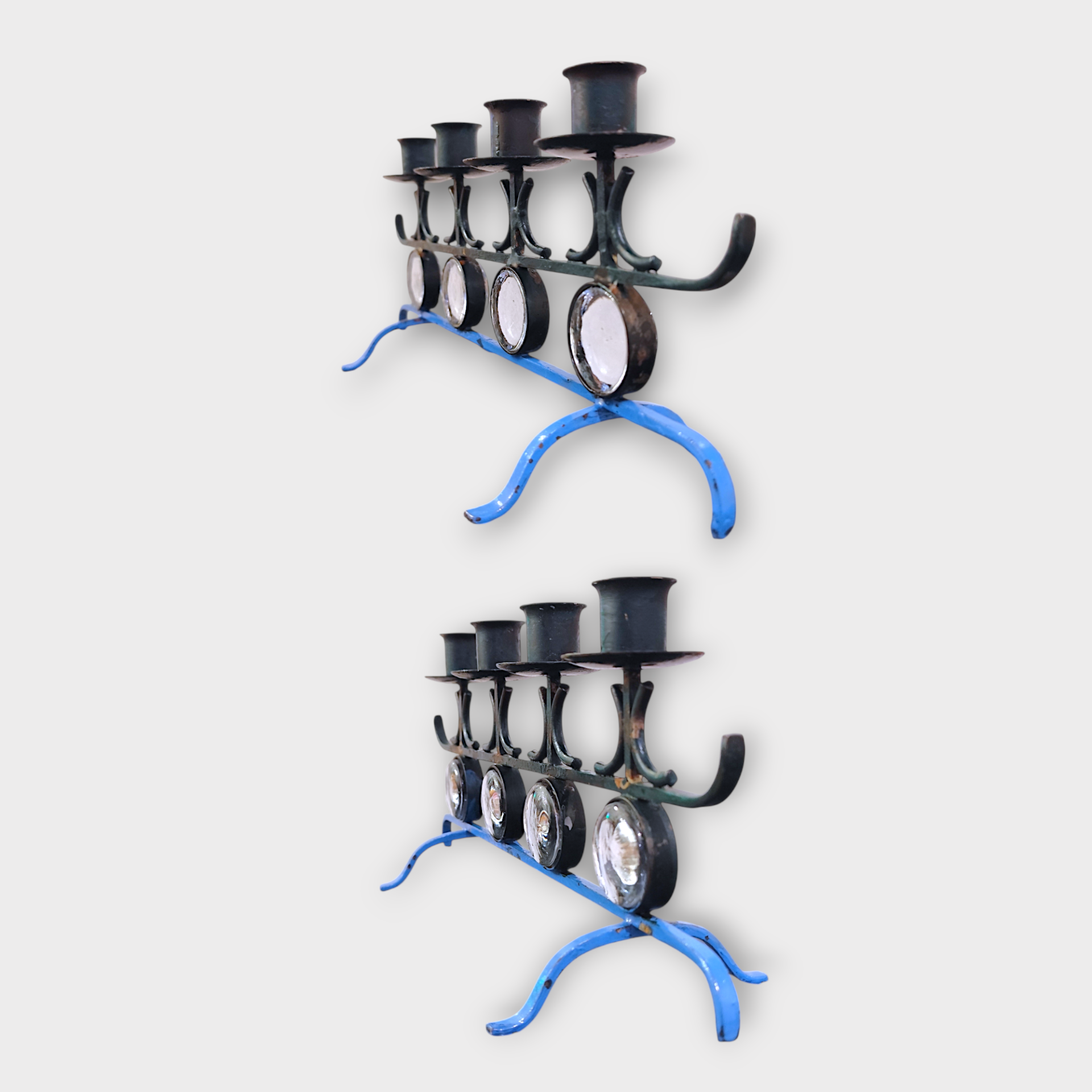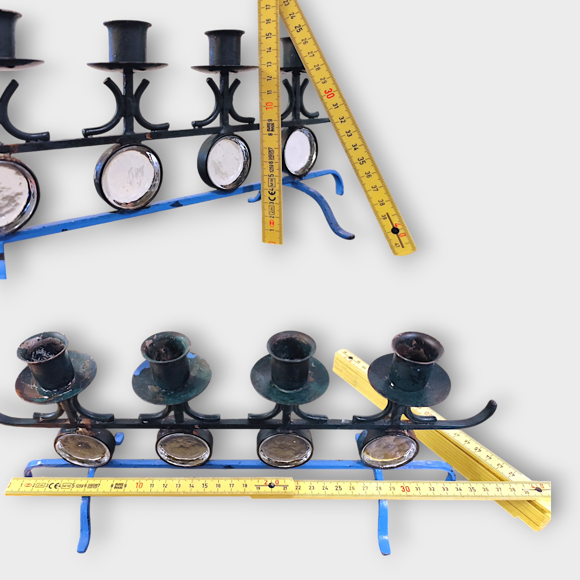 An Advent candlestick in wrought iron with glass parts. Designed by Gunnar Ander for Ystad Metall in the 1960s. Made in Sweden.
