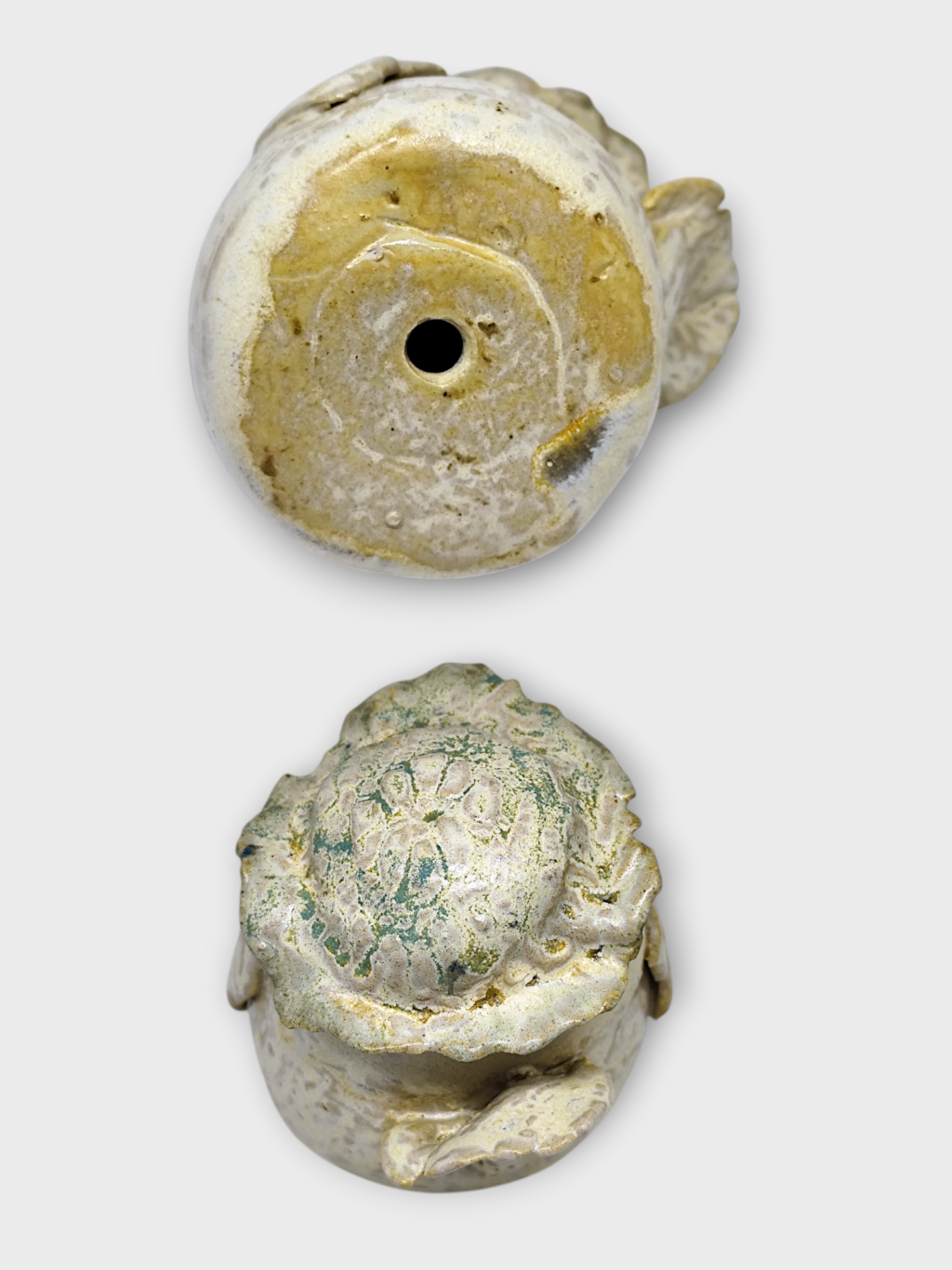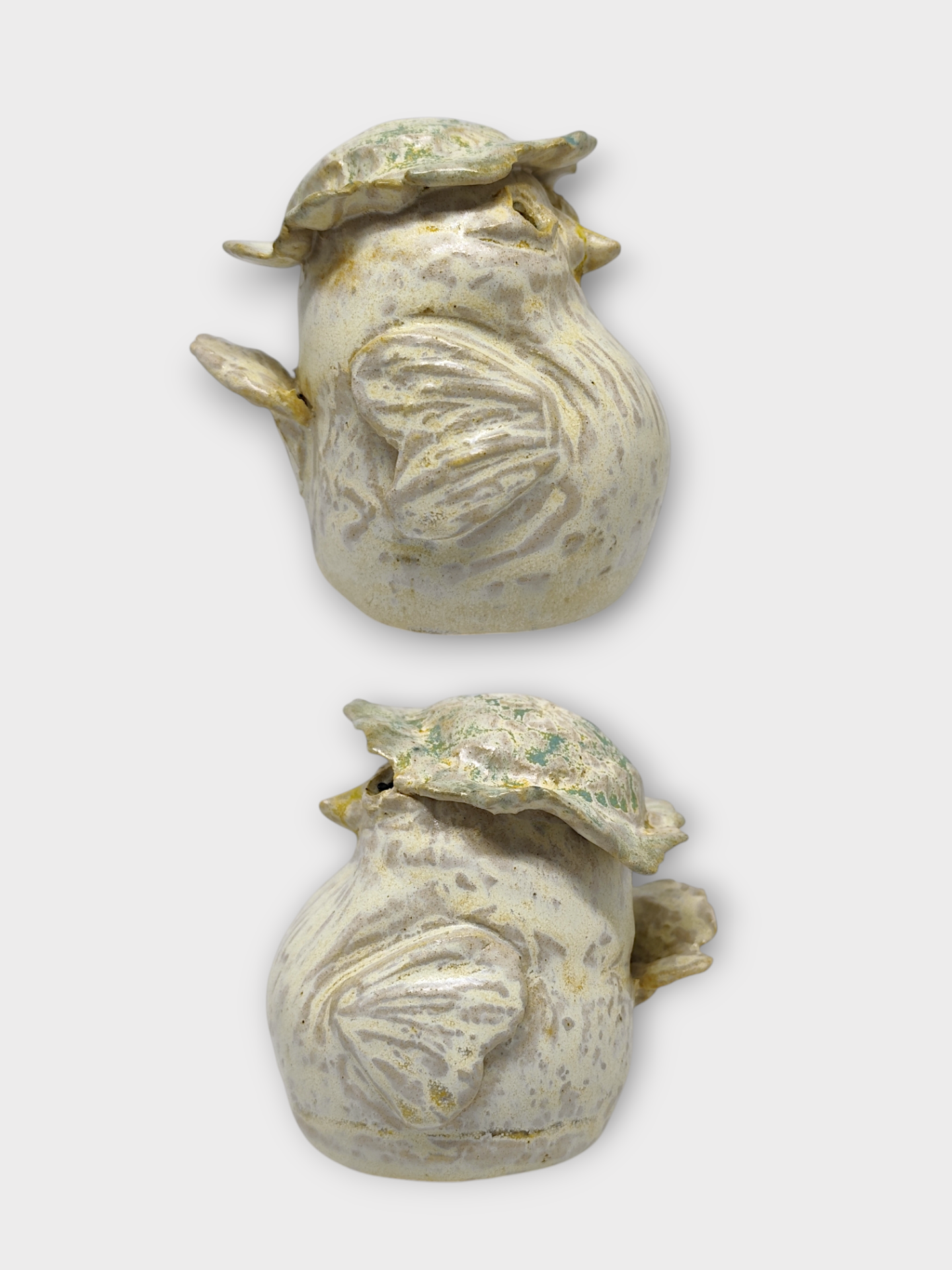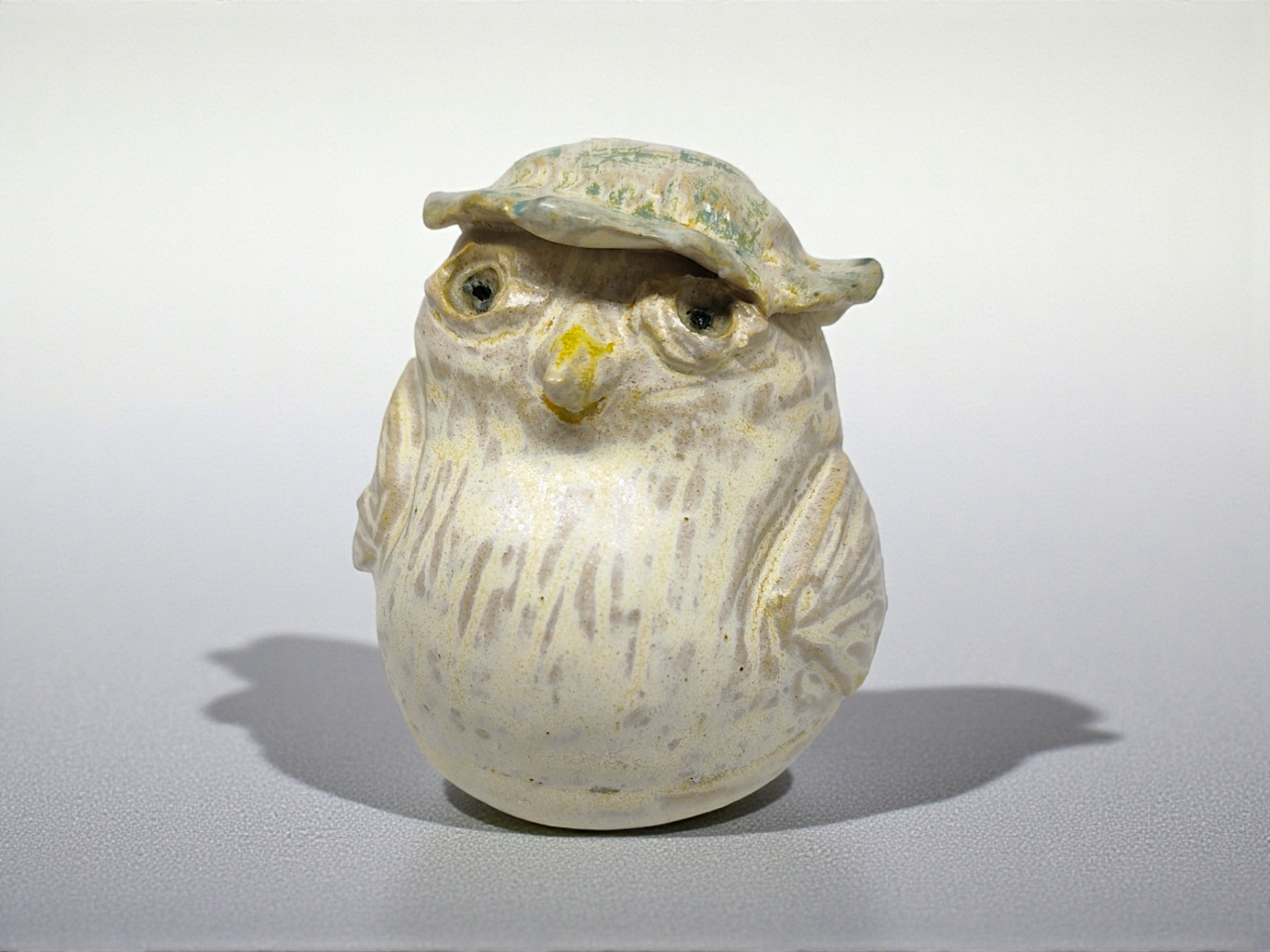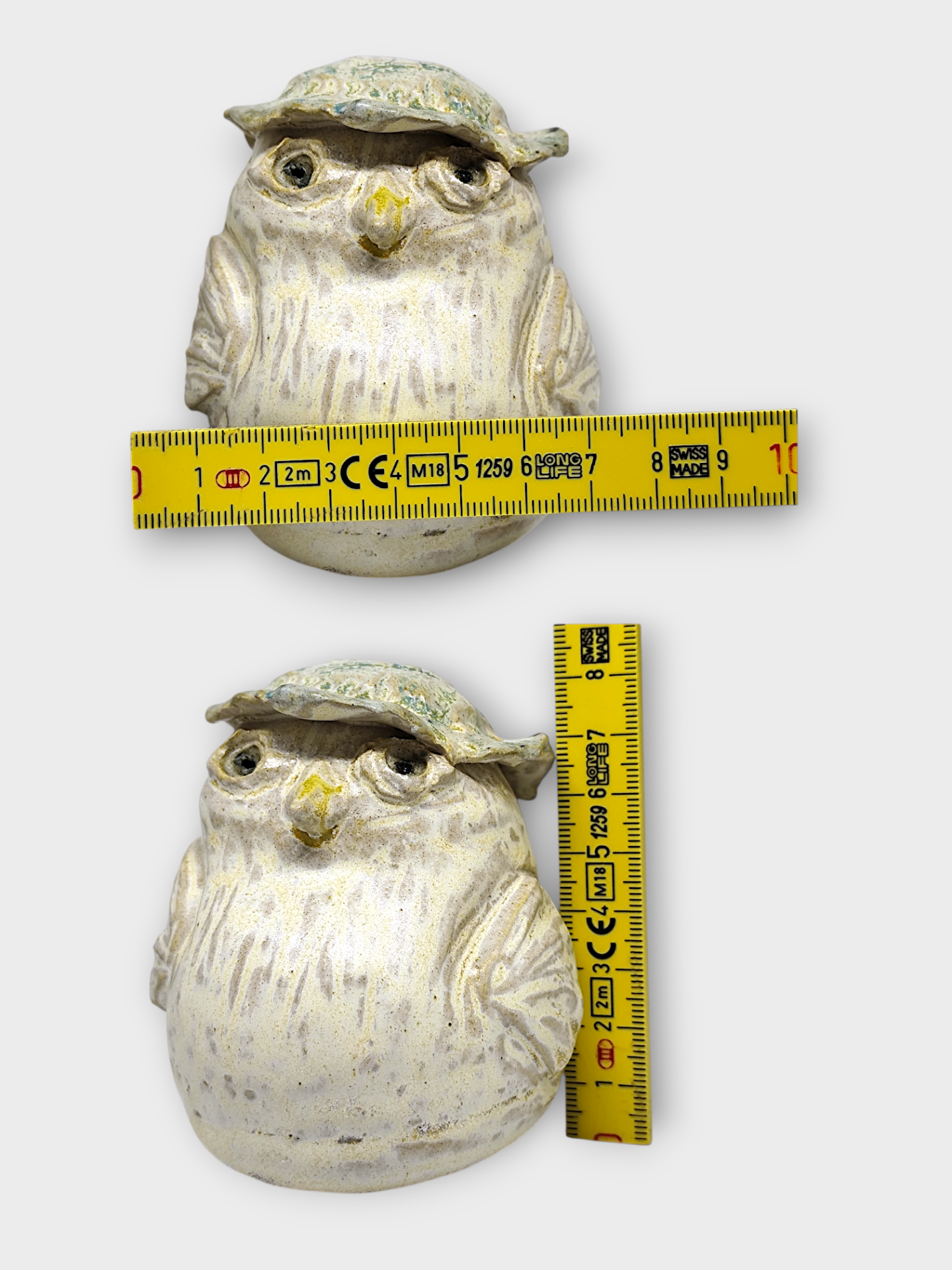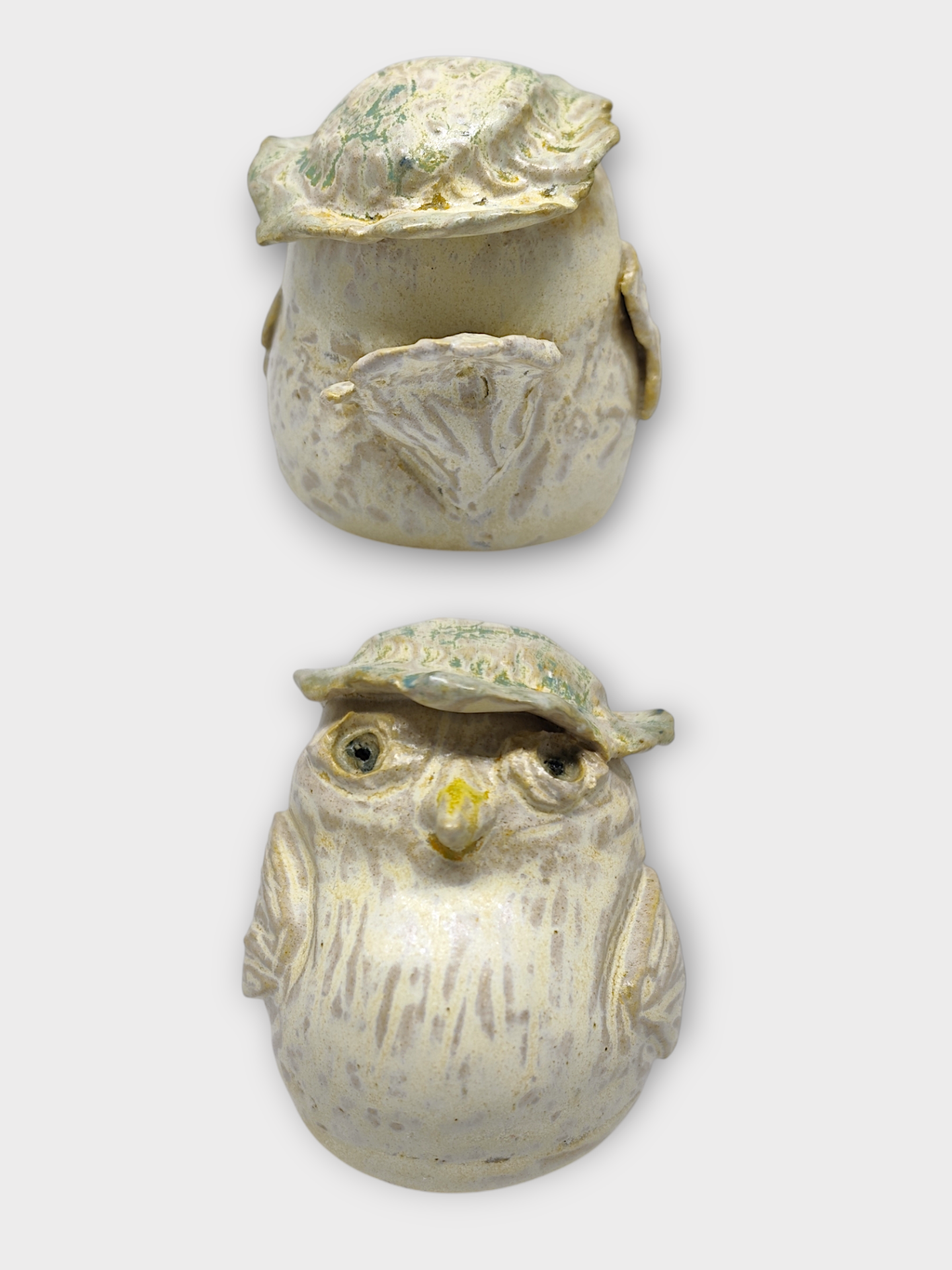 A ceramic figurine depicting an owl with a hat. The owl is handmade, which is common for this type of art pottery. The specific design with the round body, the expressive eyes and the small, slightly worn green hat give it a unique and charming character. Unknown artist and year.