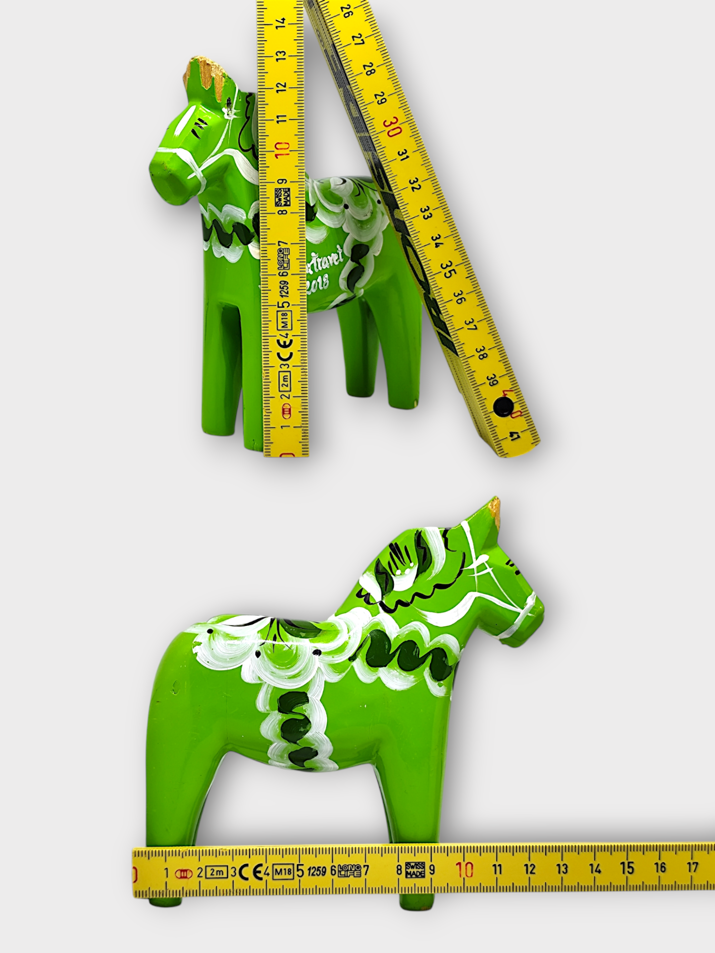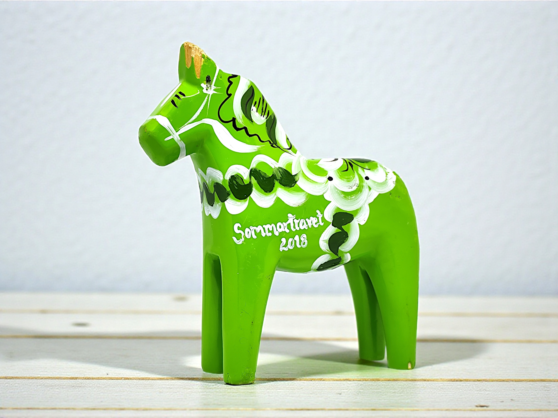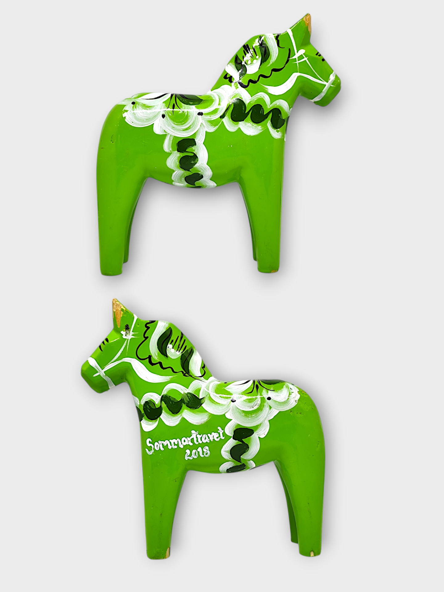 A green Dala horse from Nils Olsson Hemslöjd. This Dala horse has the text "Sommertravet 2018" painted on the side. This classic Dala horse is handmade and skillfully created by craftsmen with traditional painted patterns. Perfect as a decoration or collector's item.