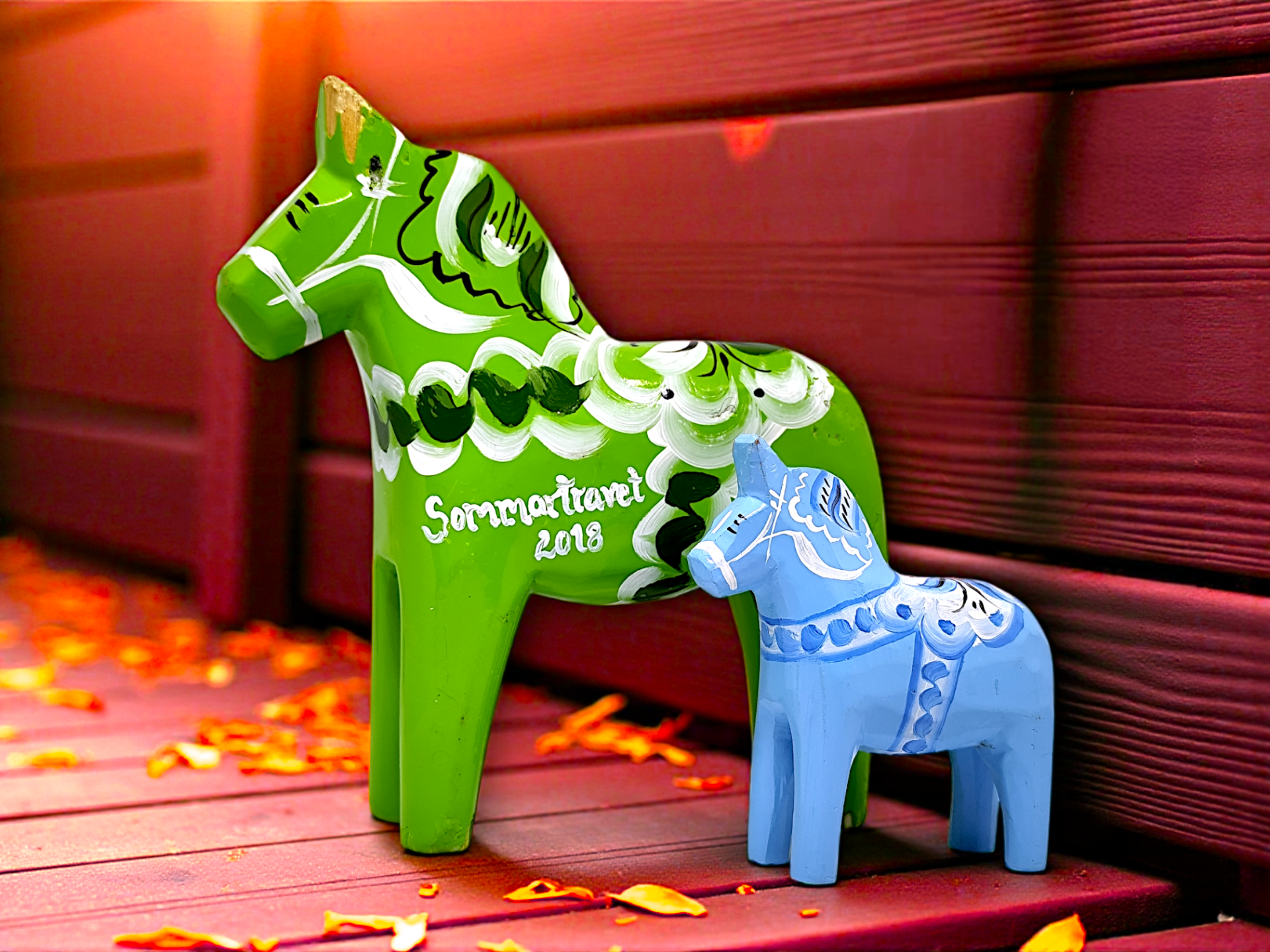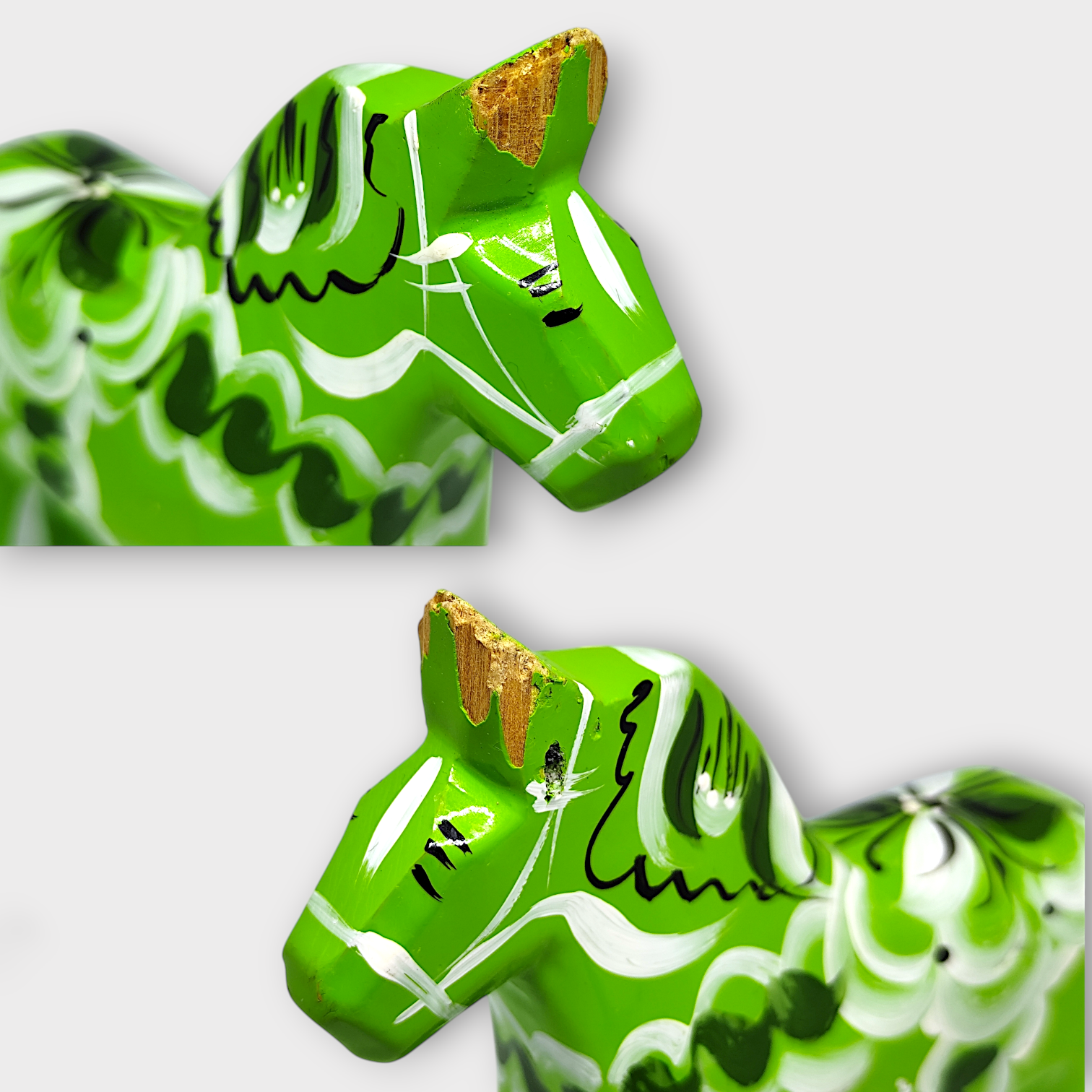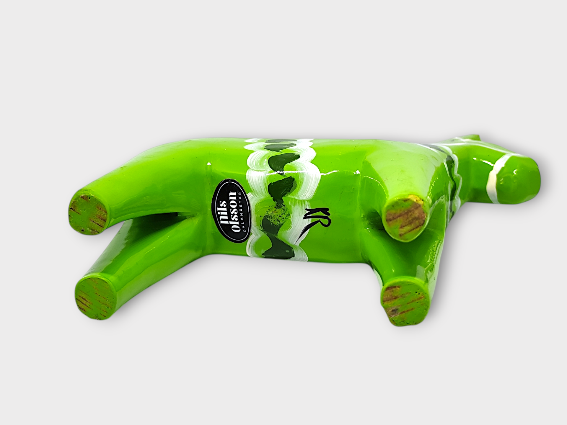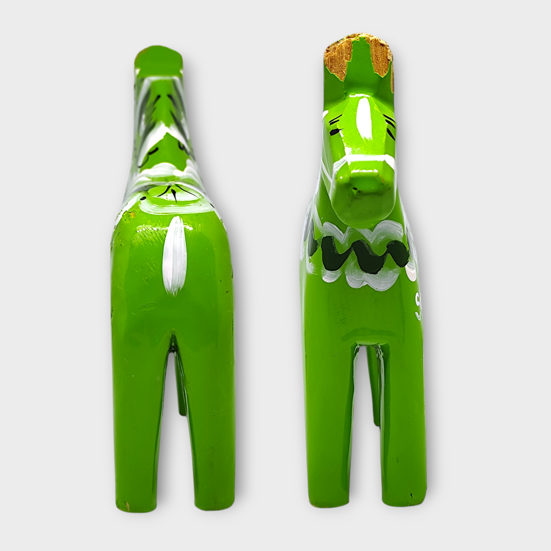 A green Dala horse from Nils Olsson Hemslöjd. This Dala horse has the text "Sommertravet 2018" painted on the side. This classic Dala horse is handmade and skillfully created by craftsmen with traditional painted patterns. Perfect as a decoration or collector's item.
