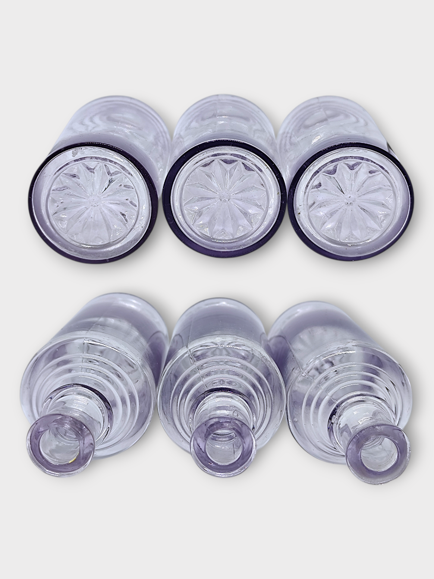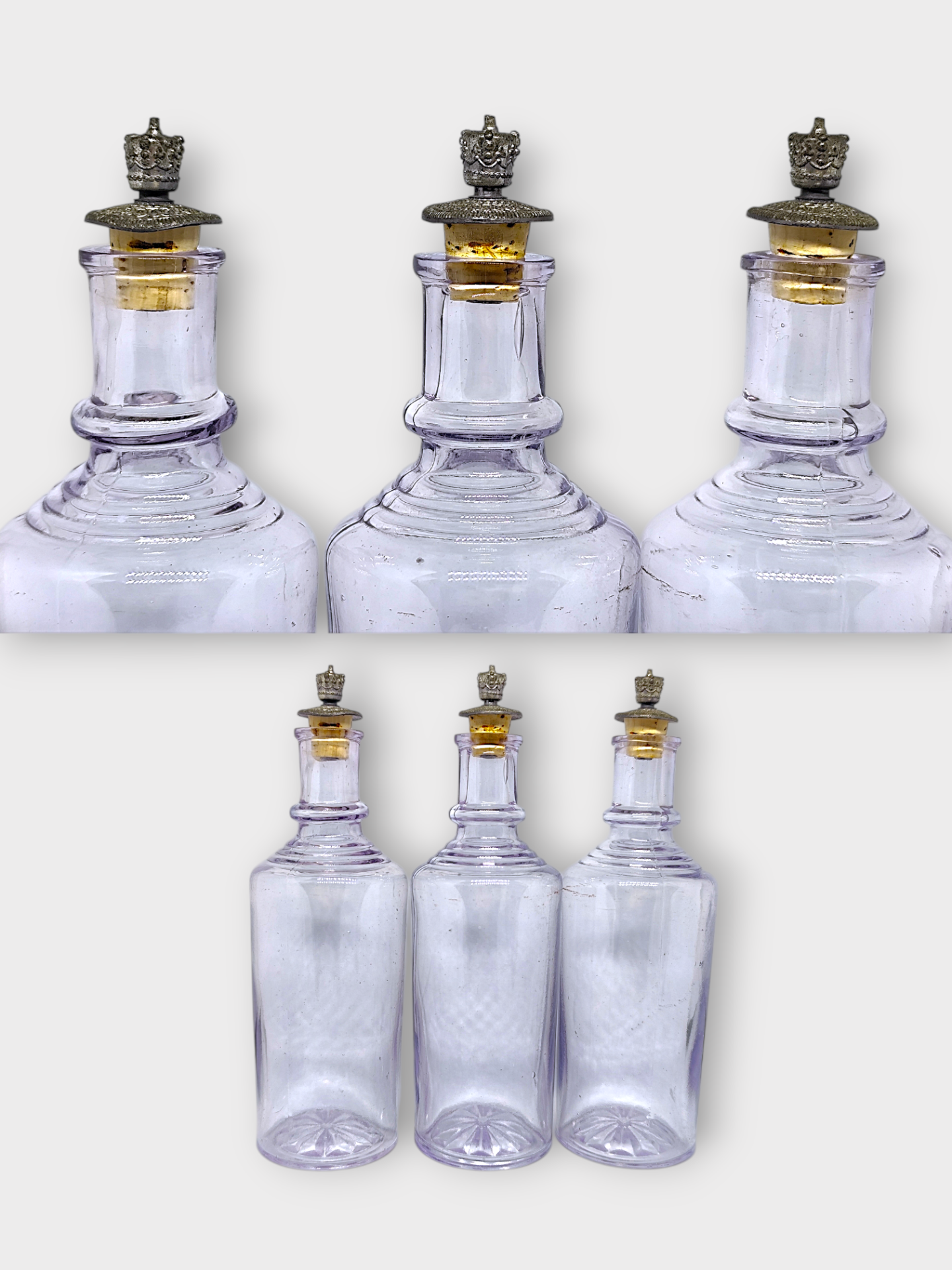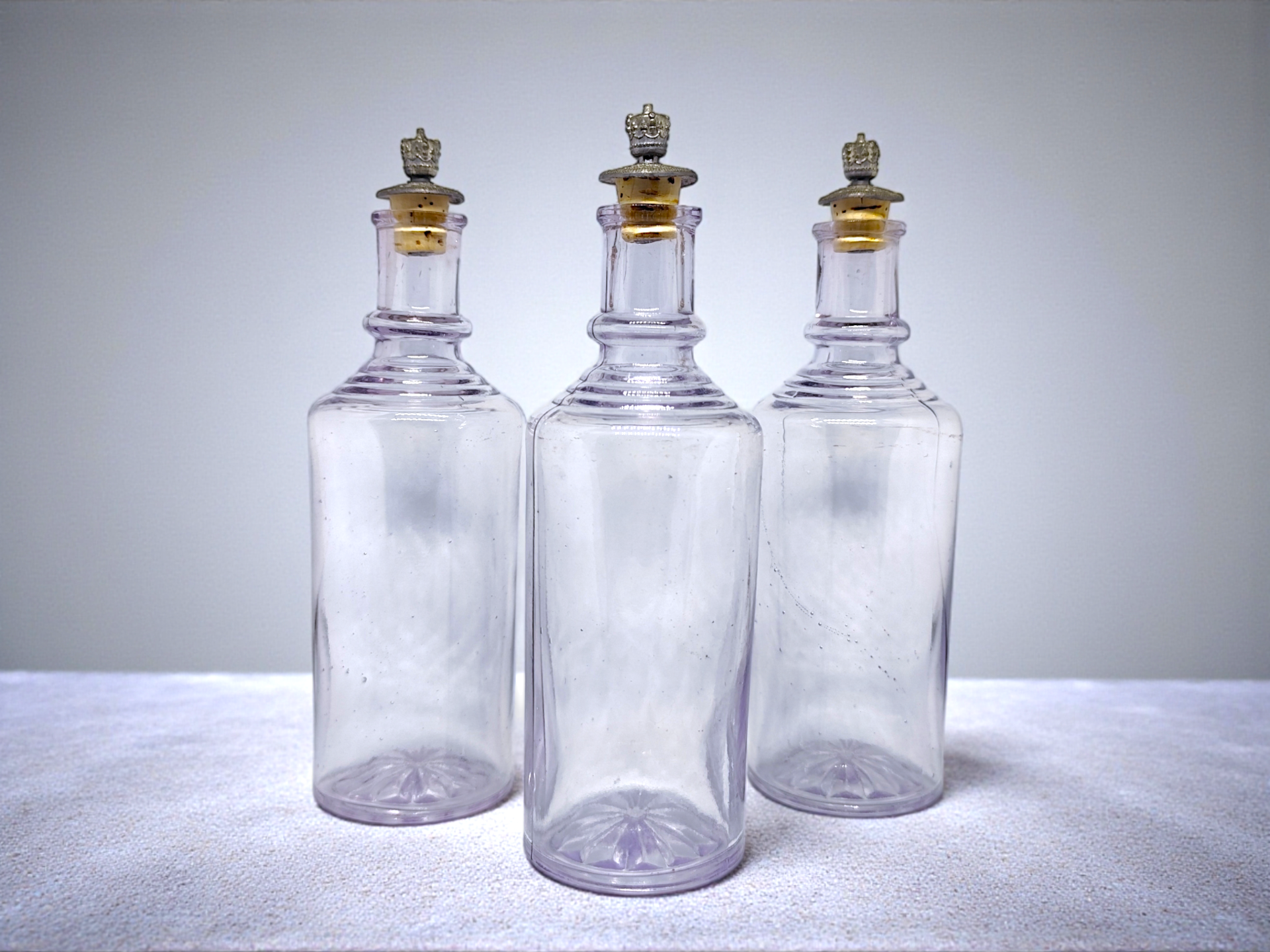 Three glass bottles in purple glass. The bottles have crown-shaped corks. Unknown year and origin. Resembles antique bottles used to store perfumes.