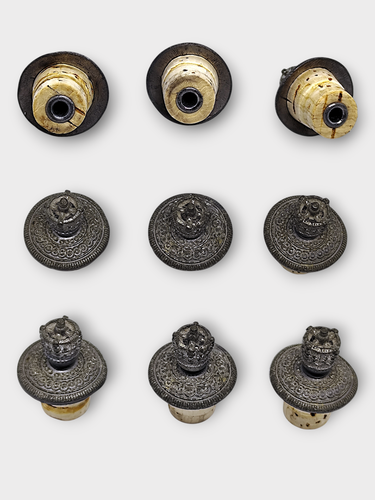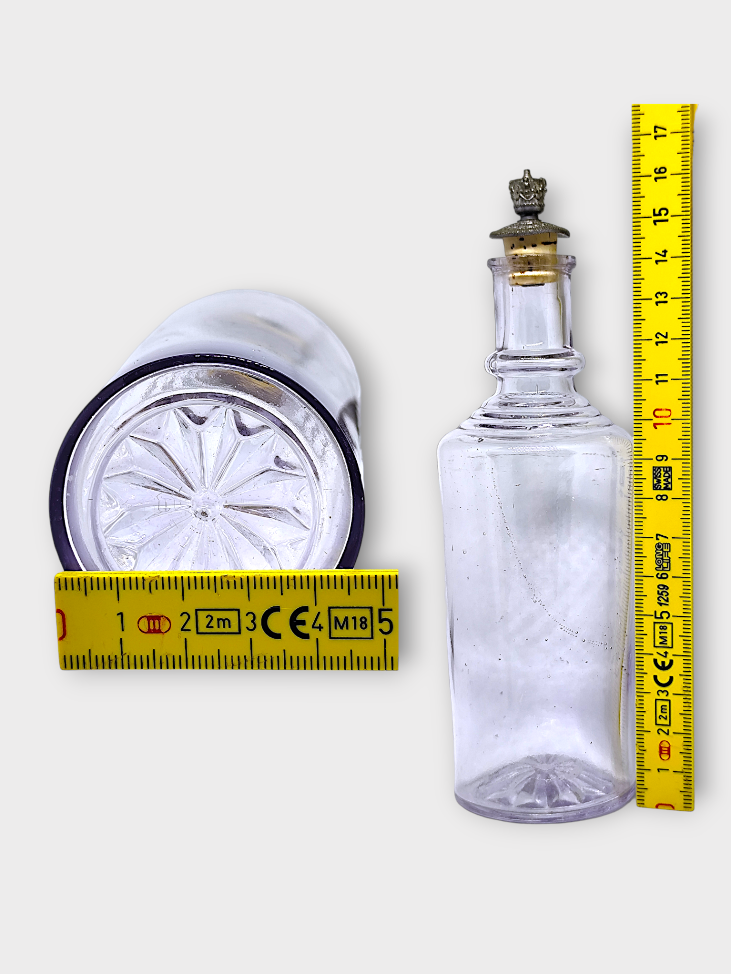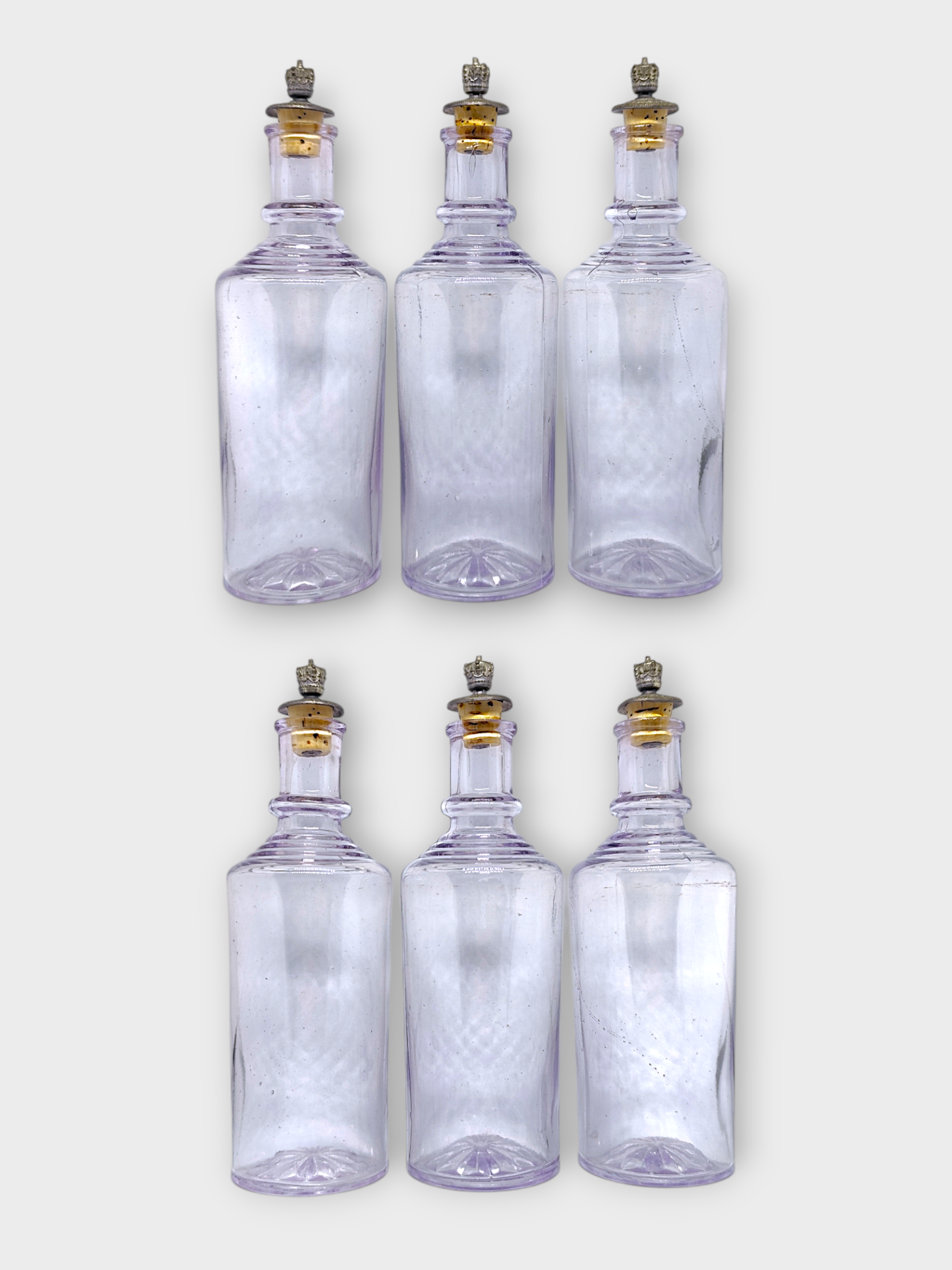 Three glass bottles in purple glass. The bottles have crown-shaped corks. Unknown year and origin. Resembles antique bottles used to store perfumes.