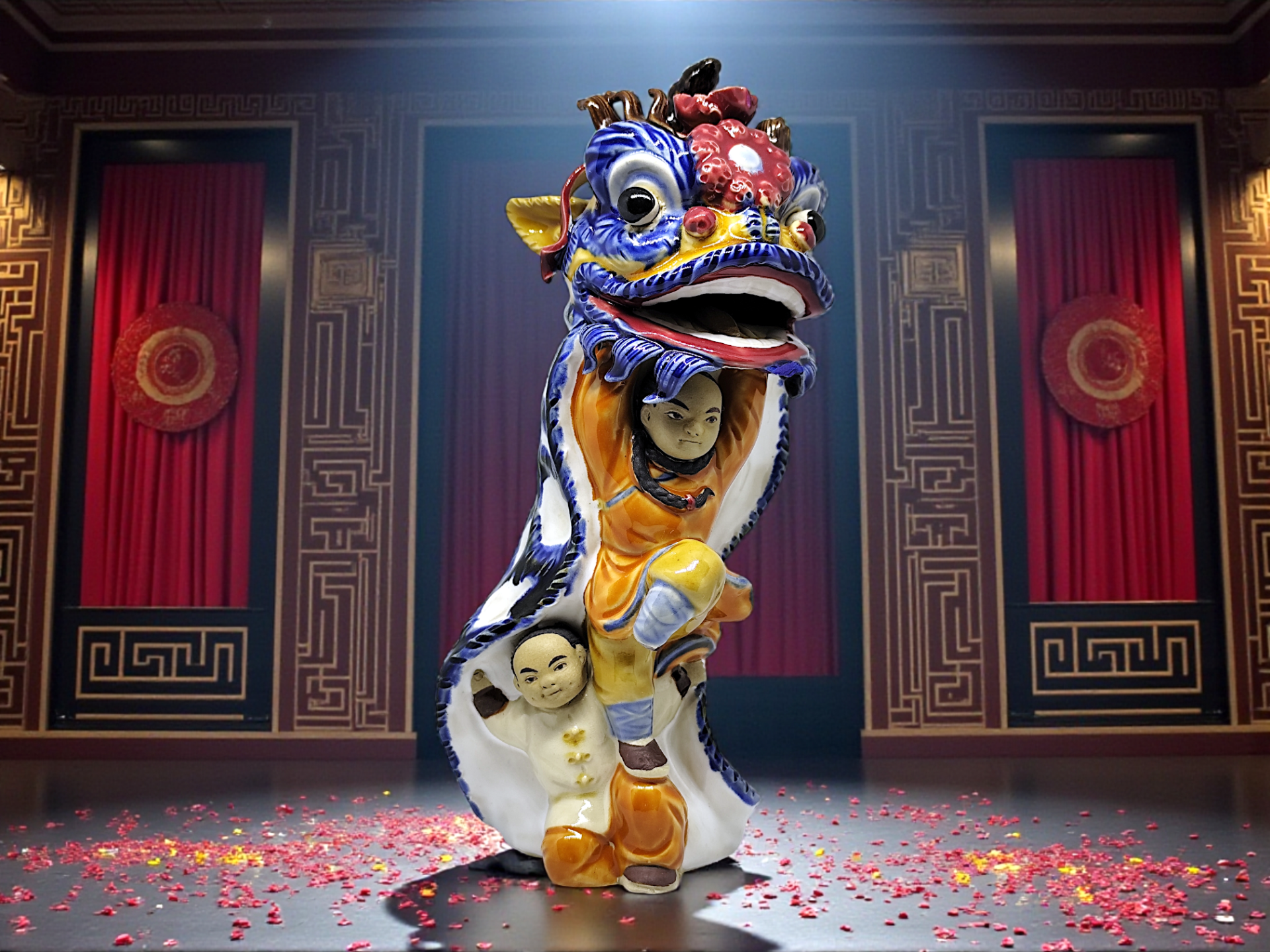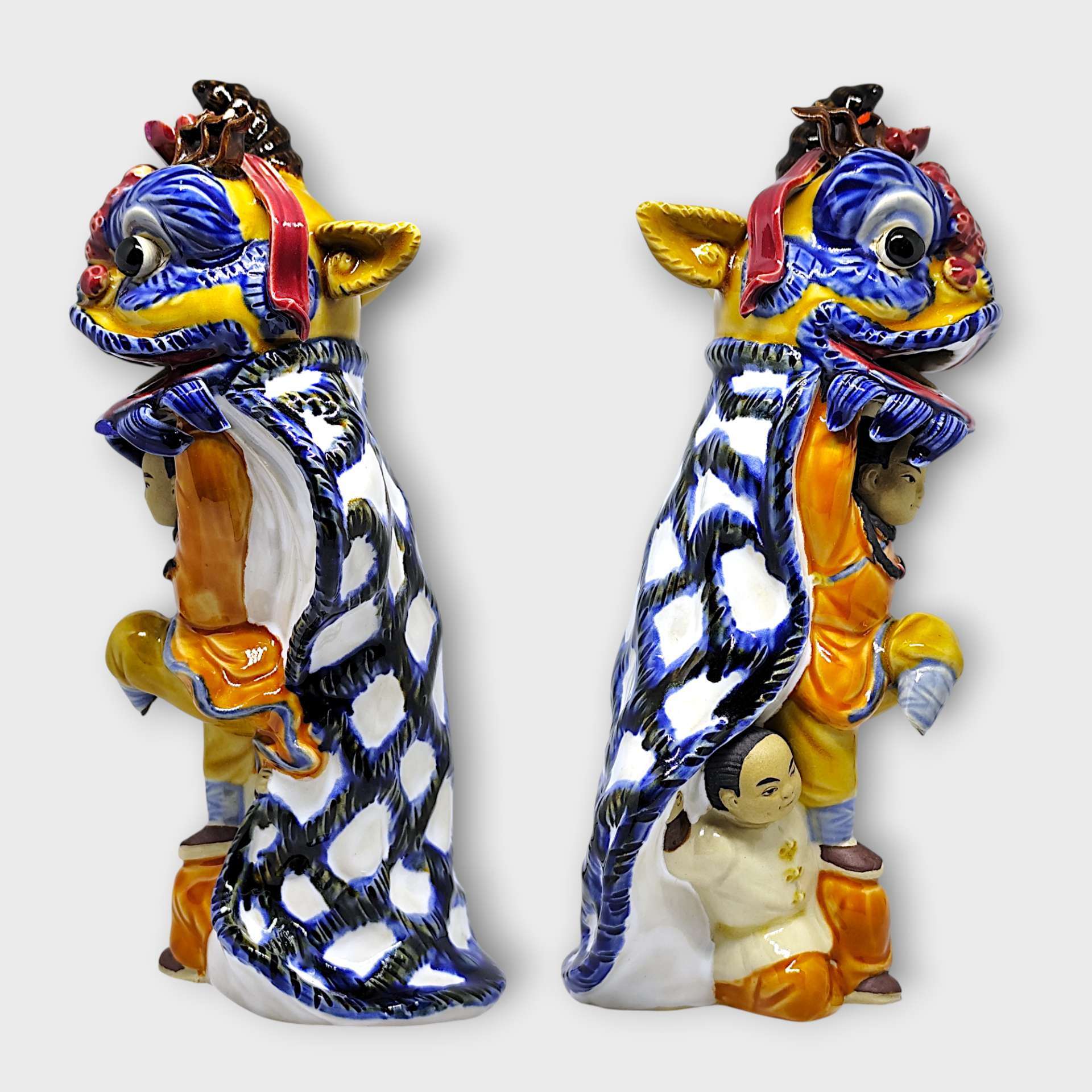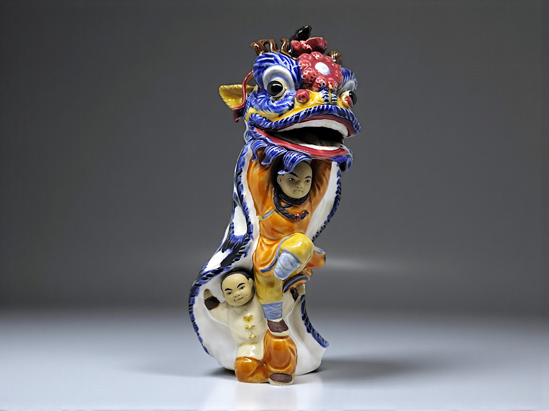A detailed Chinese glazed porcelain figurine depicting two children performing a lion dance, a traditional Chinese ritual. The lion dance is believed to bring good luck and drive away evil spirits on auspicious occasions. The figurine has smooth lines and is finely and beautifully crafted. The figurine has a stamp on the bottom. Chinese Wucai Porcelain Pottery Huang Feihong.