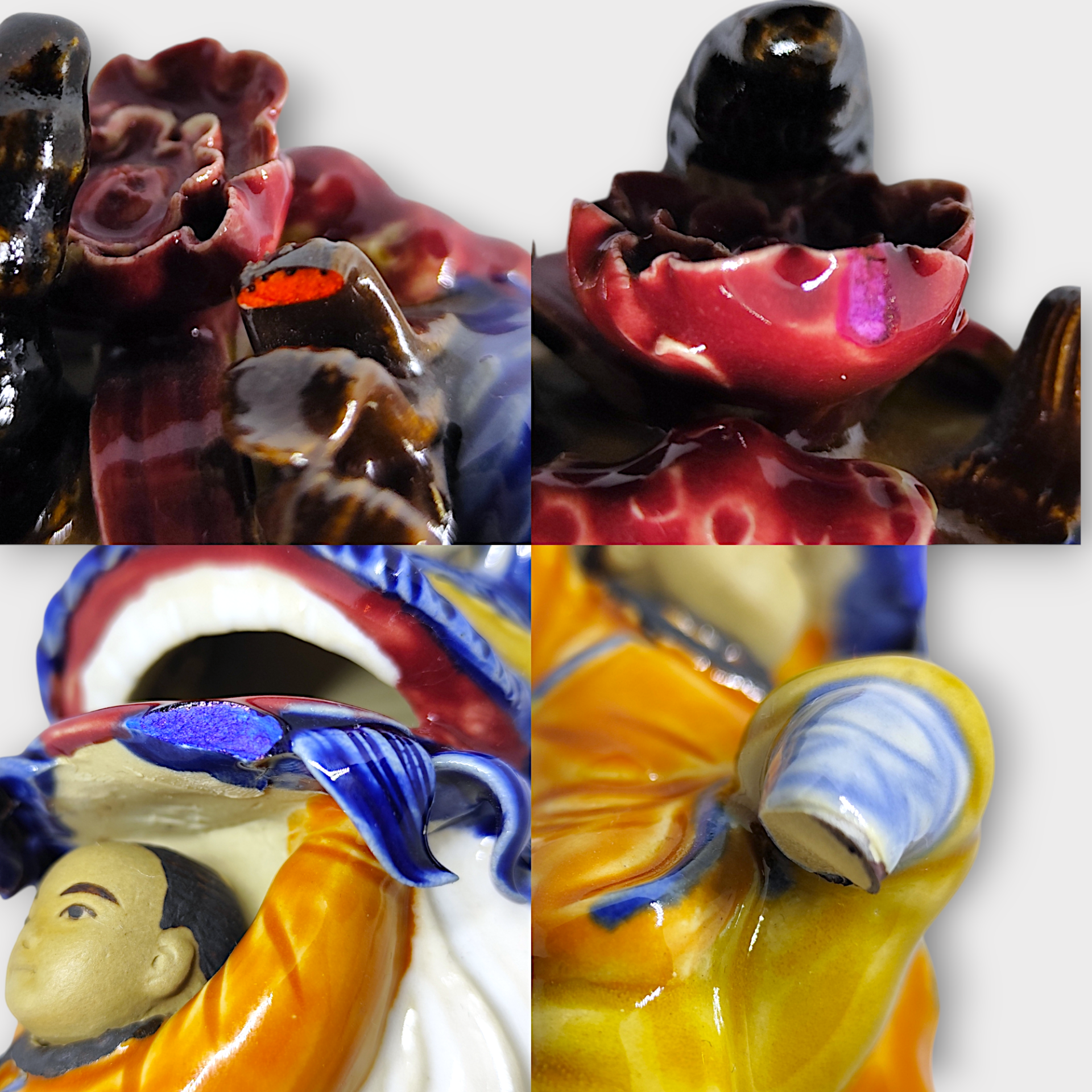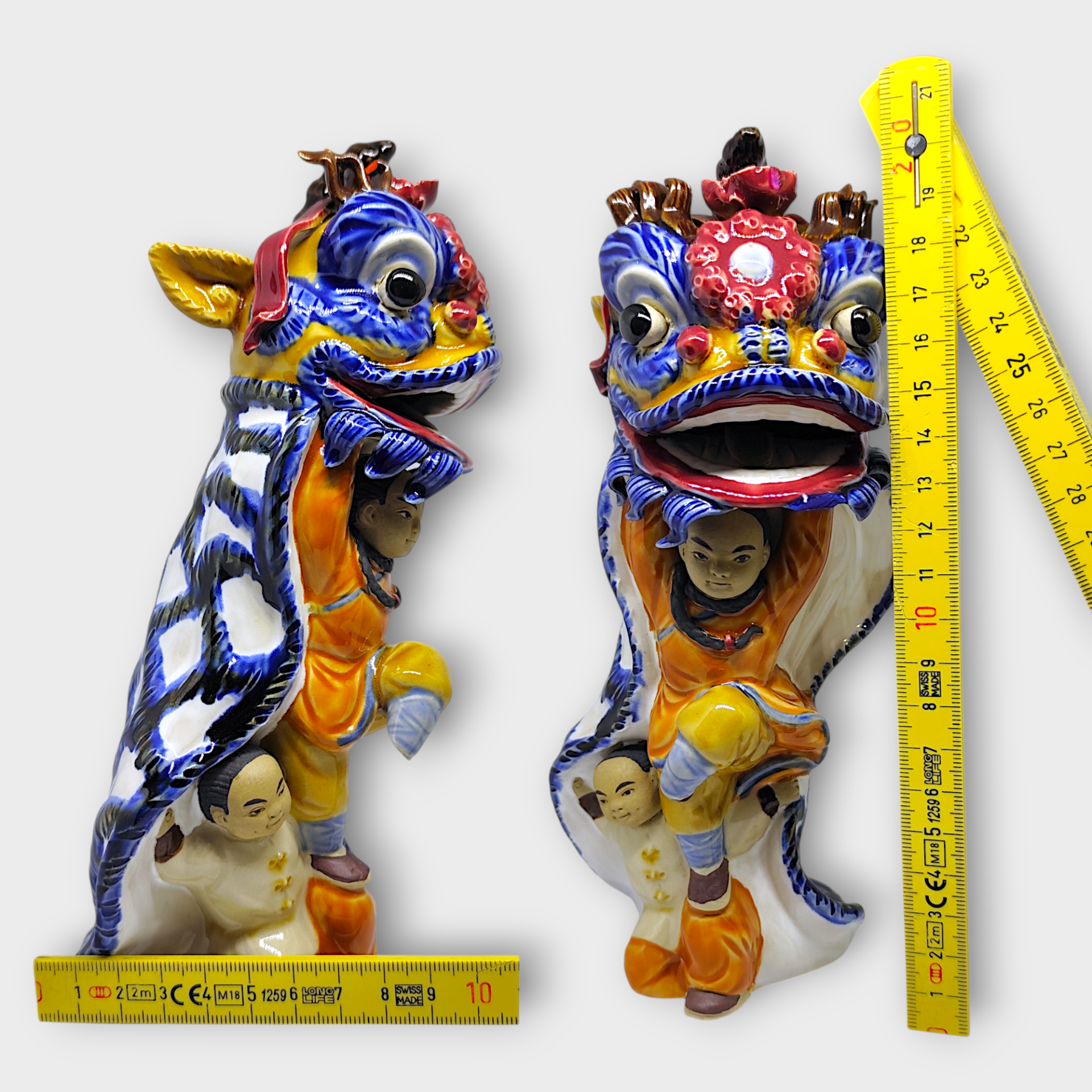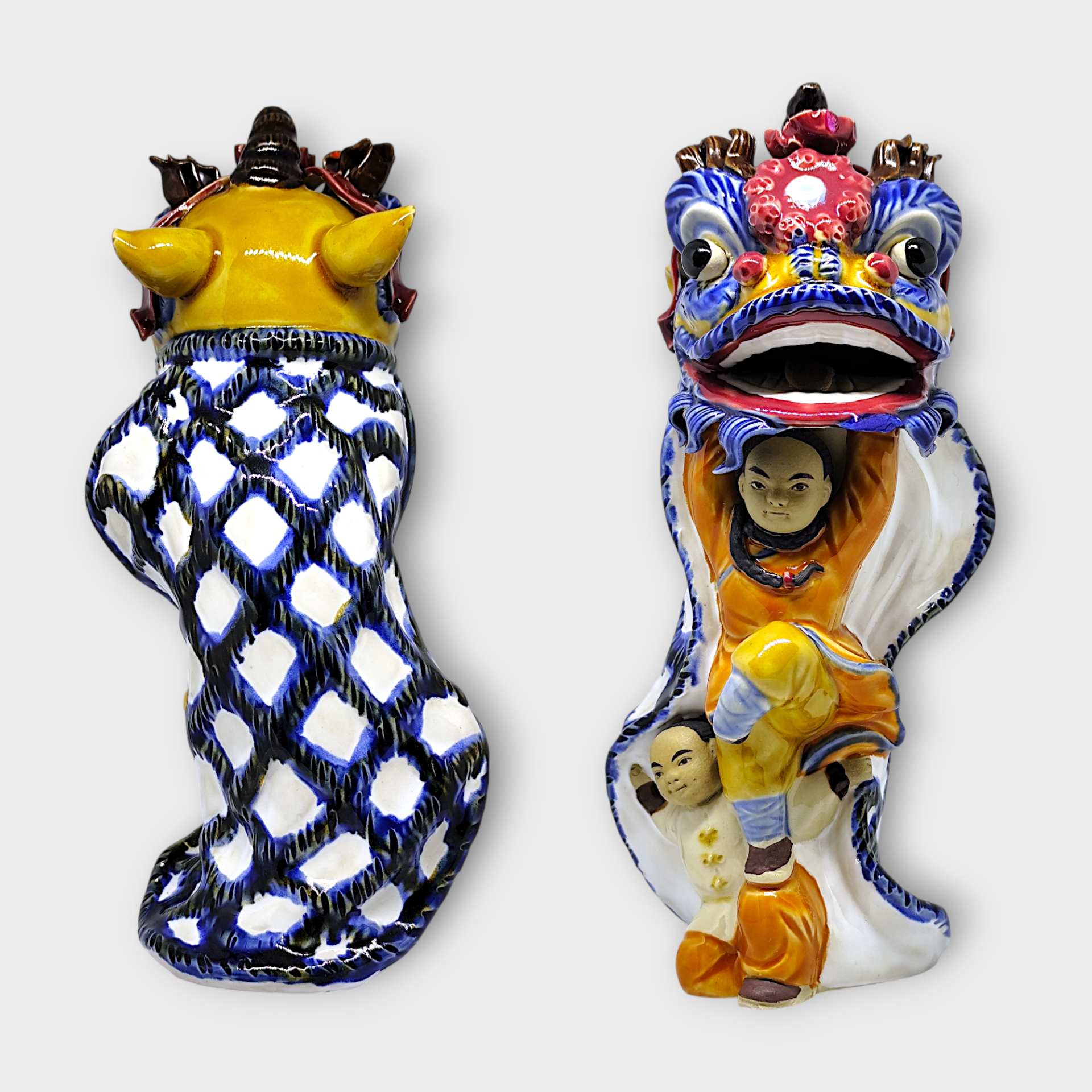 A detailed Chinese glazed porcelain figurine depicting two children performing a lion dance, a traditional Chinese ritual. The lion dance is believed to bring good luck and drive away evil spirits on auspicious occasions. The figurine has smooth lines and is finely and beautifully crafted. The figurine has a stamp on the bottom. Chinese Wucai Porcelain Pottery Huang Feihong.