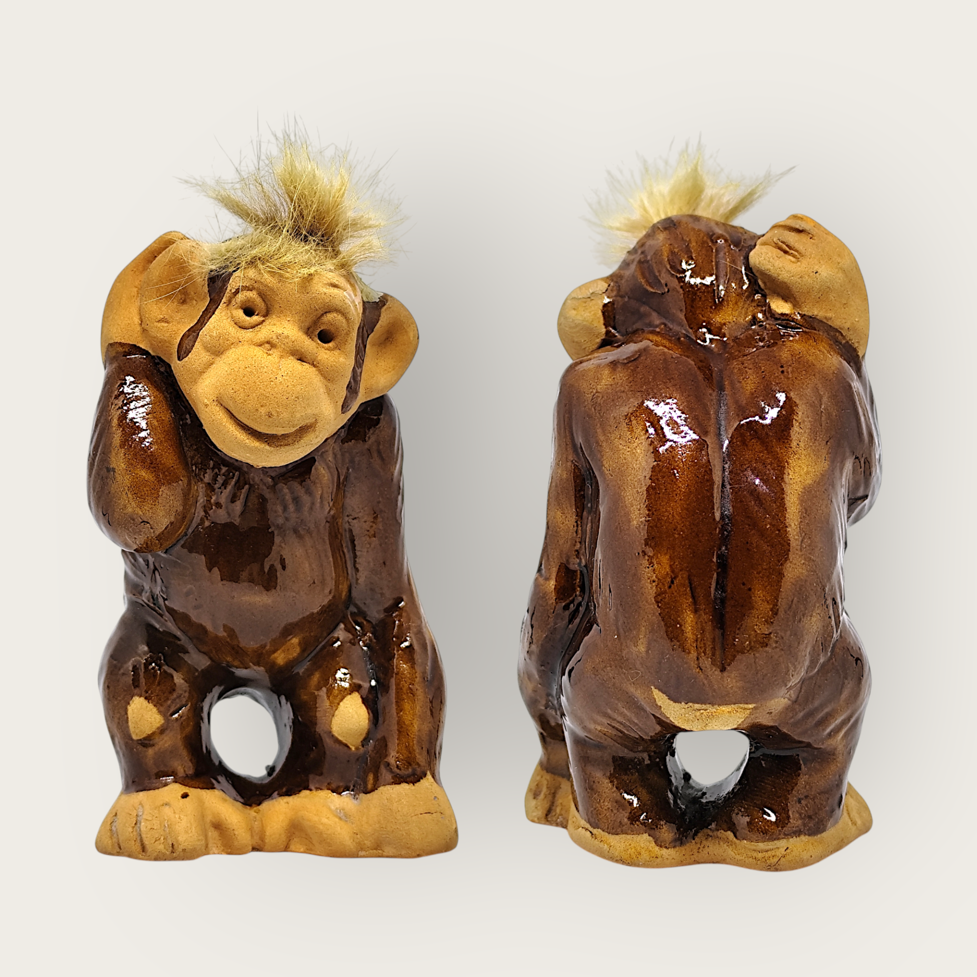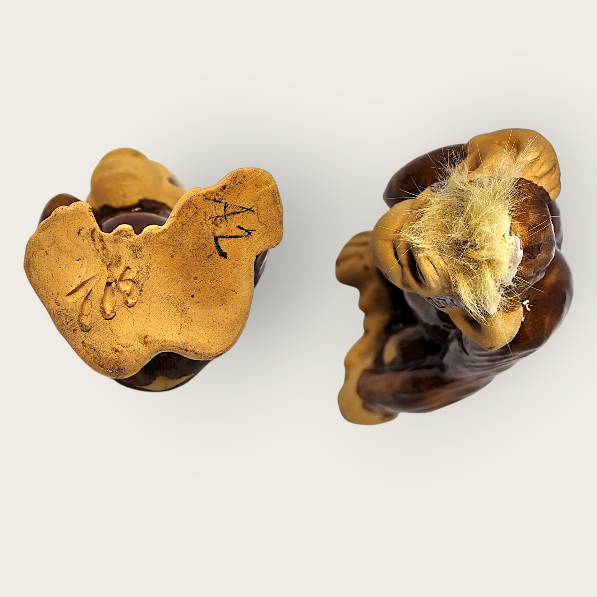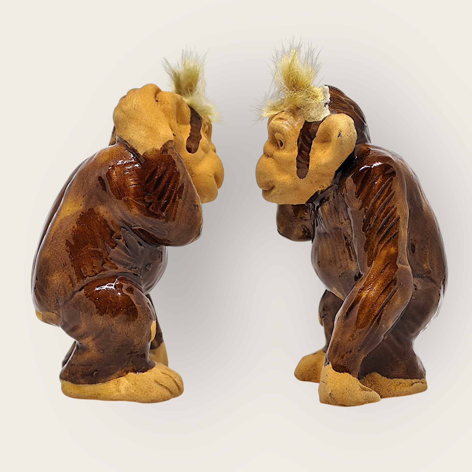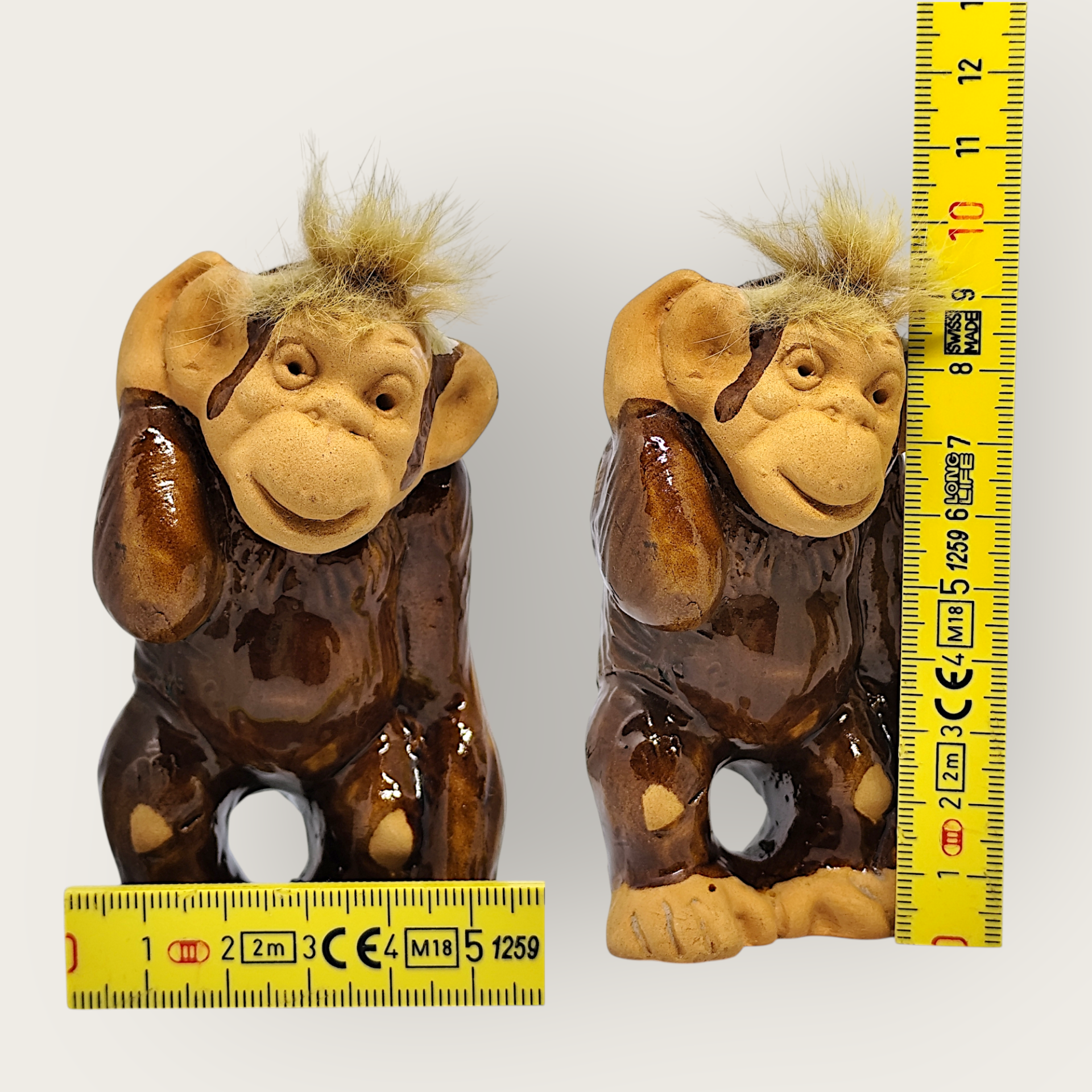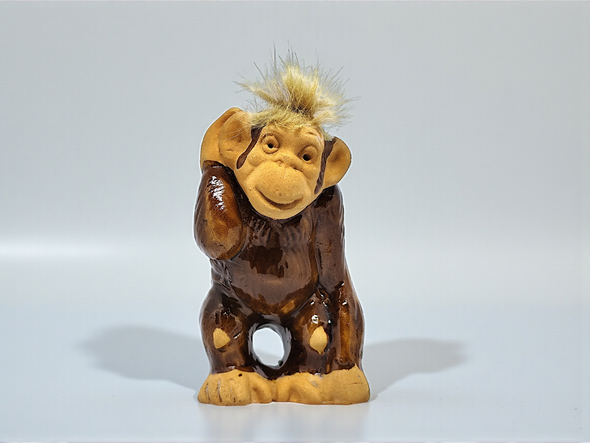 A glazed ceramic figurine. The figurine depicts a monkey made by Tebe Keramik, founded by Tore Borg. The figurine is signed at the bottom.