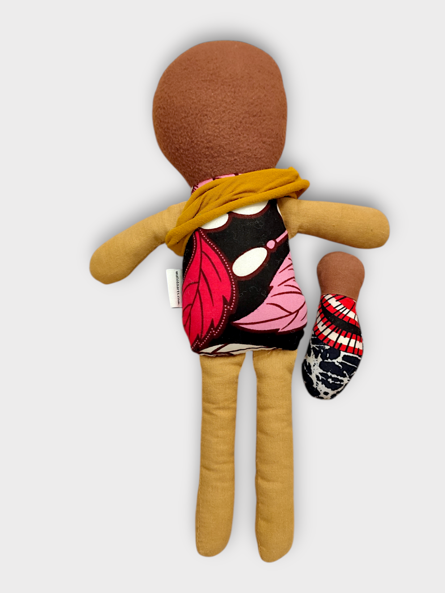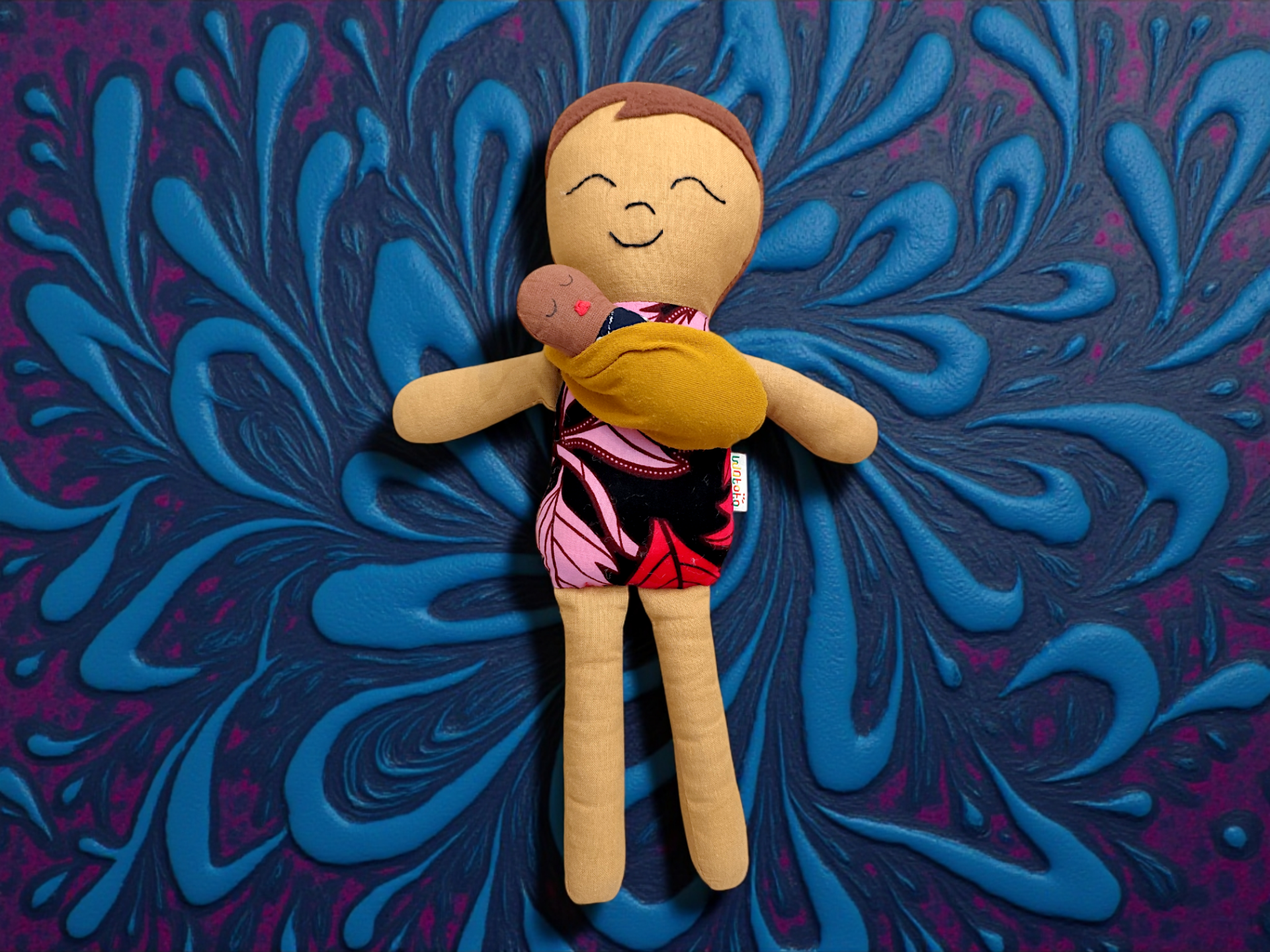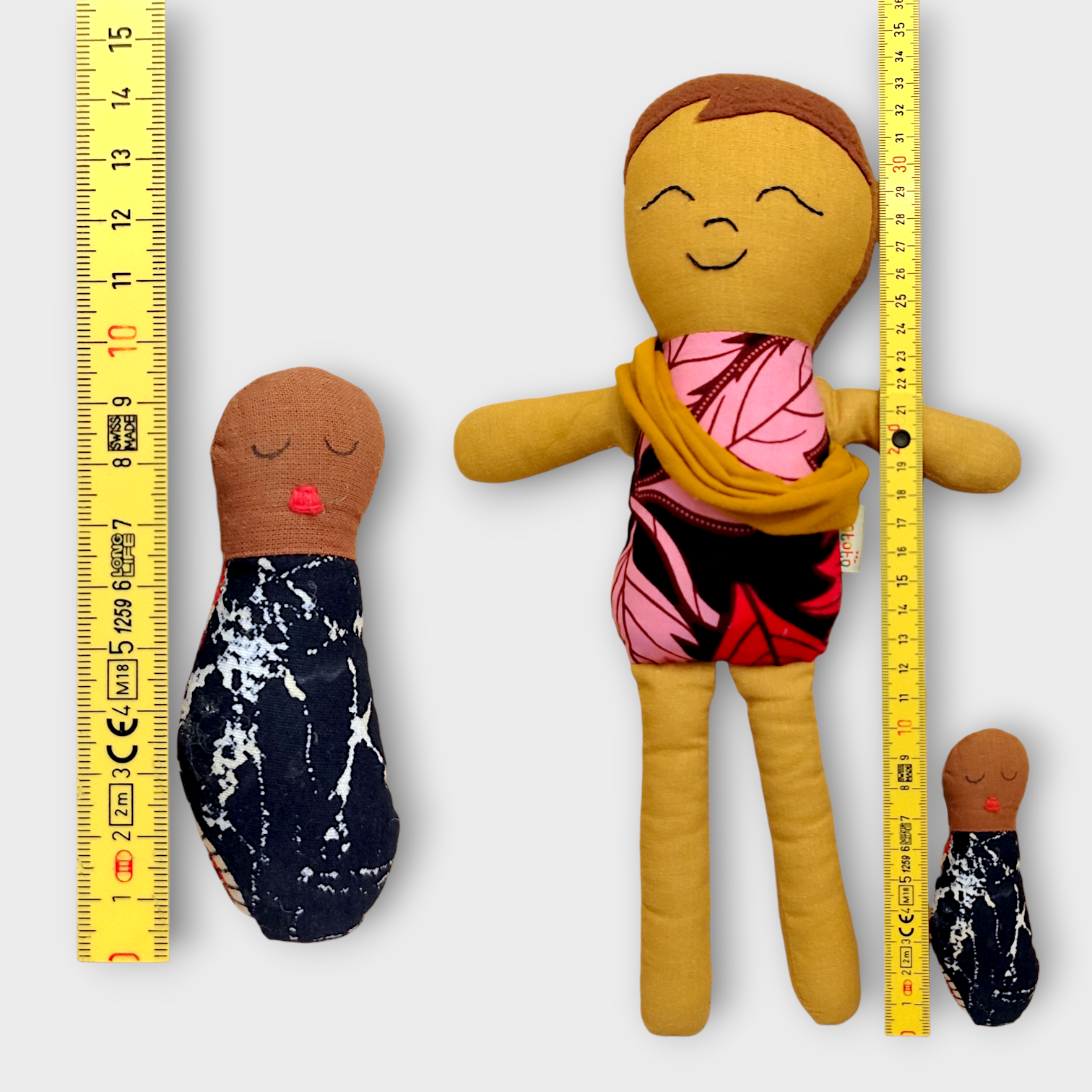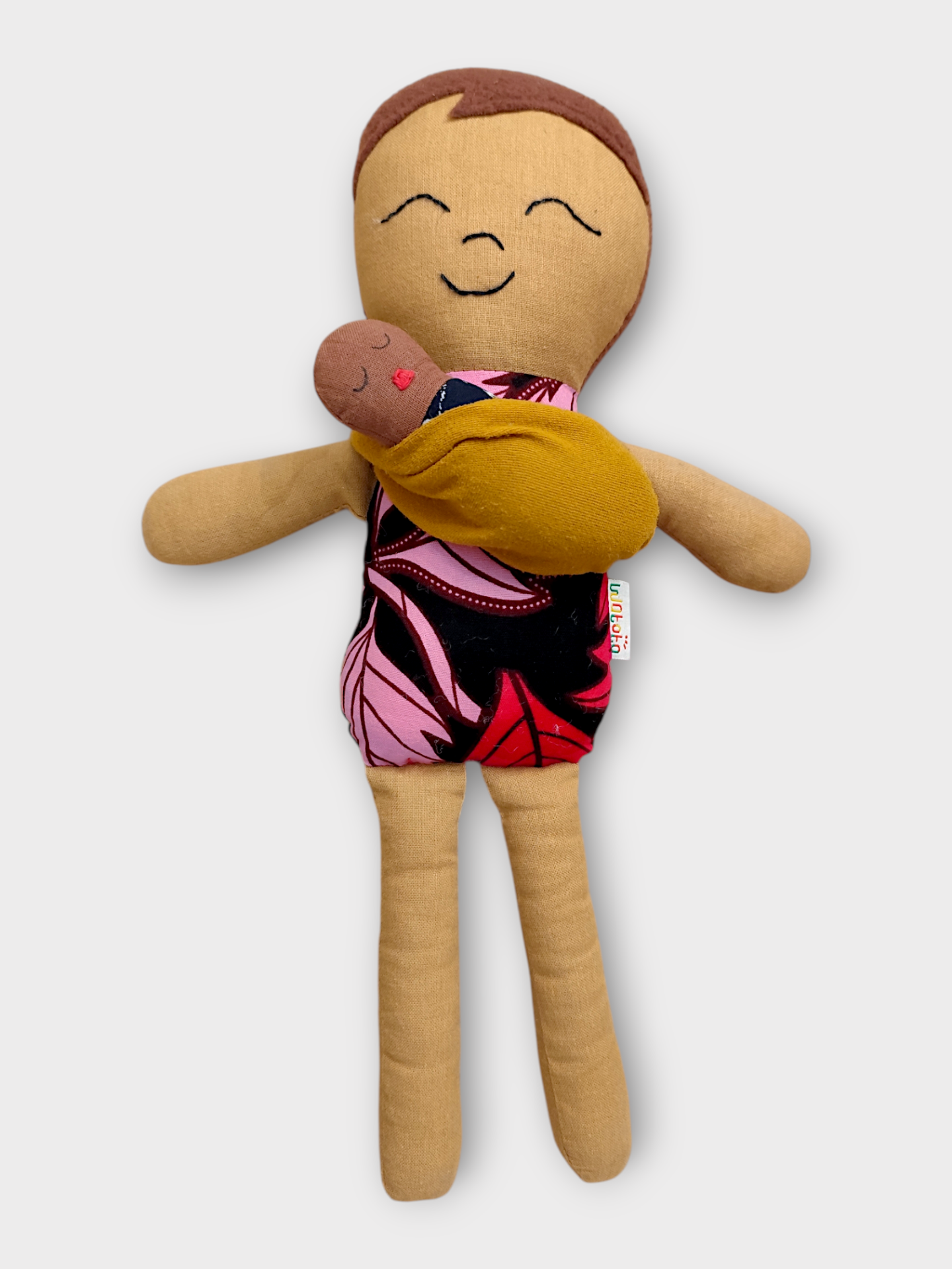 A handmade soft doll with baby from Watoto Arts. This wonderful doll and baby are stuffed with the softest wool and have a lovely body of cotton.
