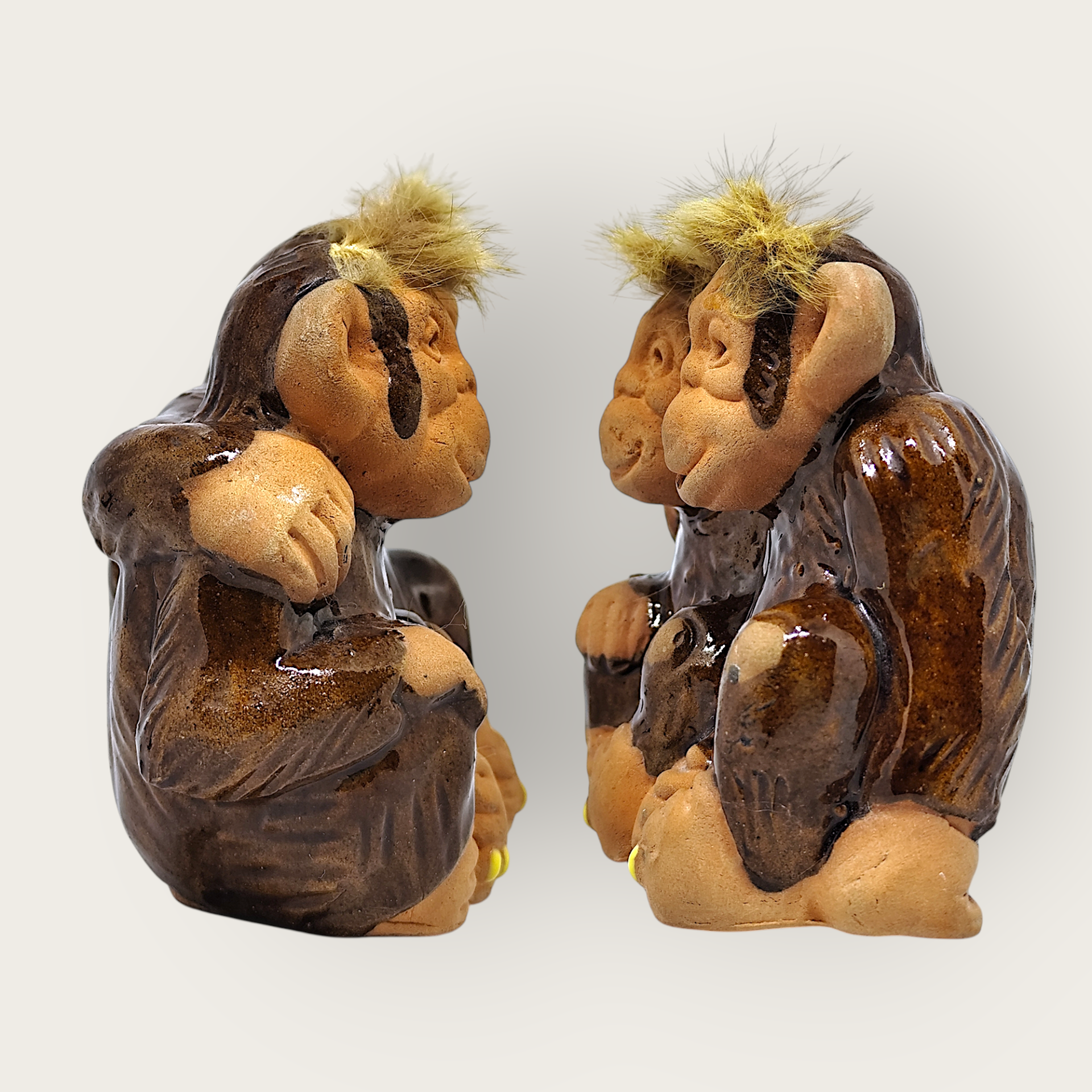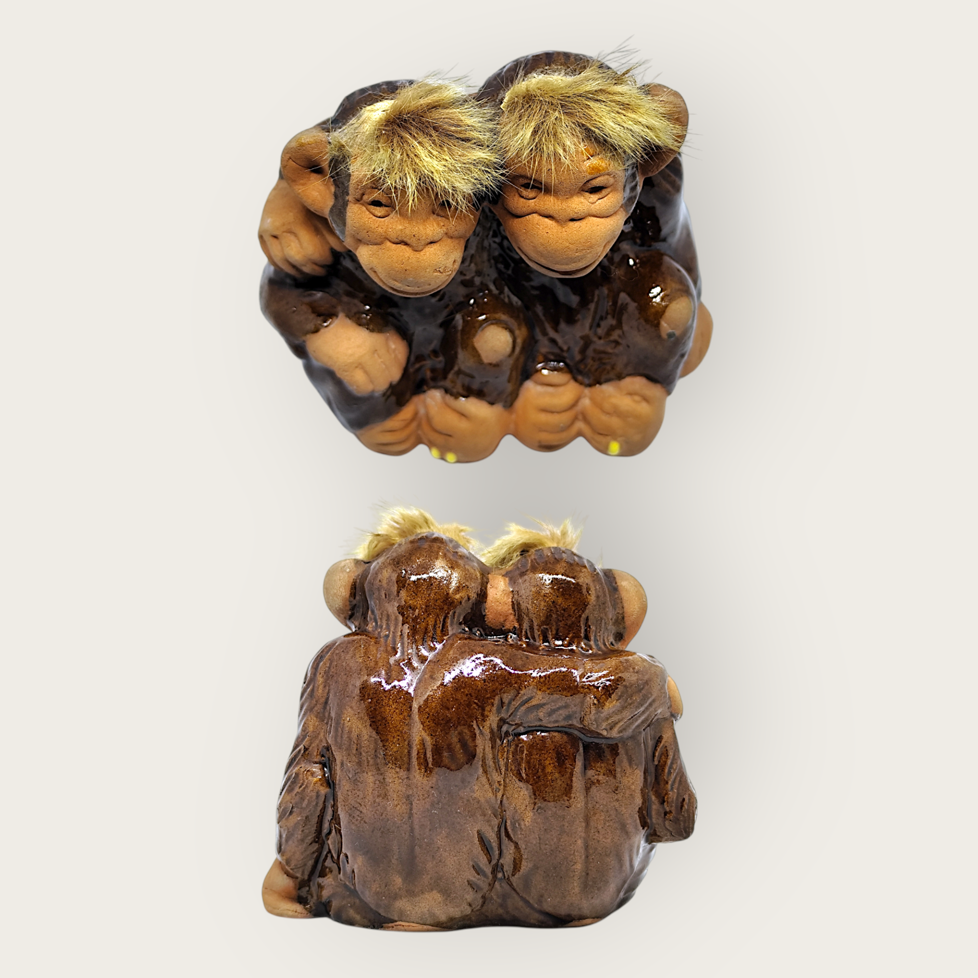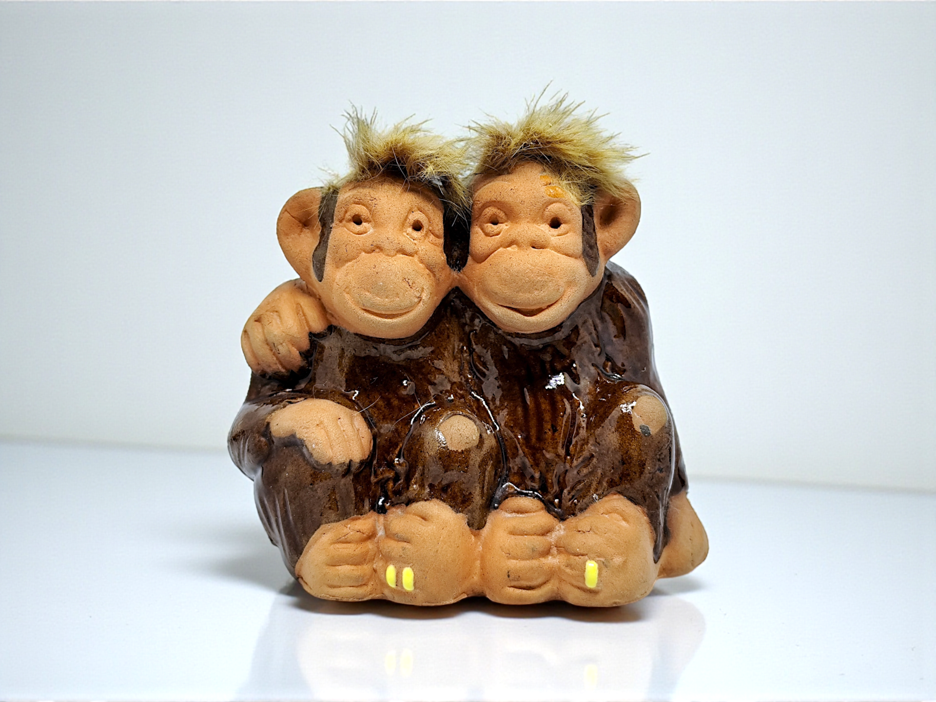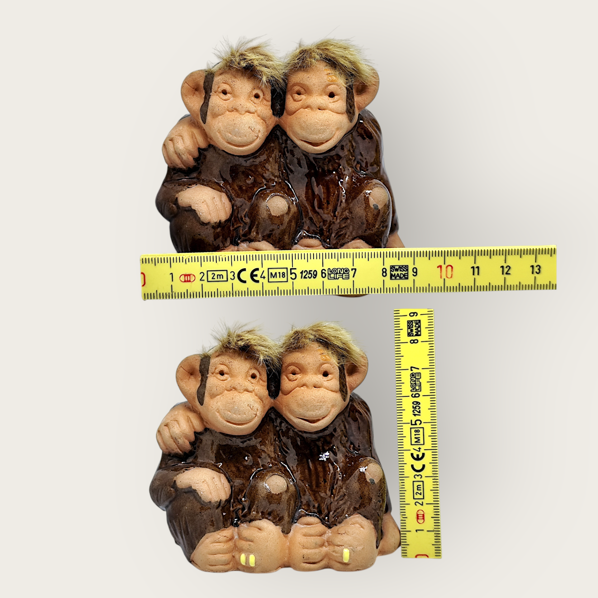A glazed ceramic figurine. The figurine depicts two monkeys, made by Tebe Keramik, founded by Tore Borg. The figurines are signed "TB". At the bottom.
