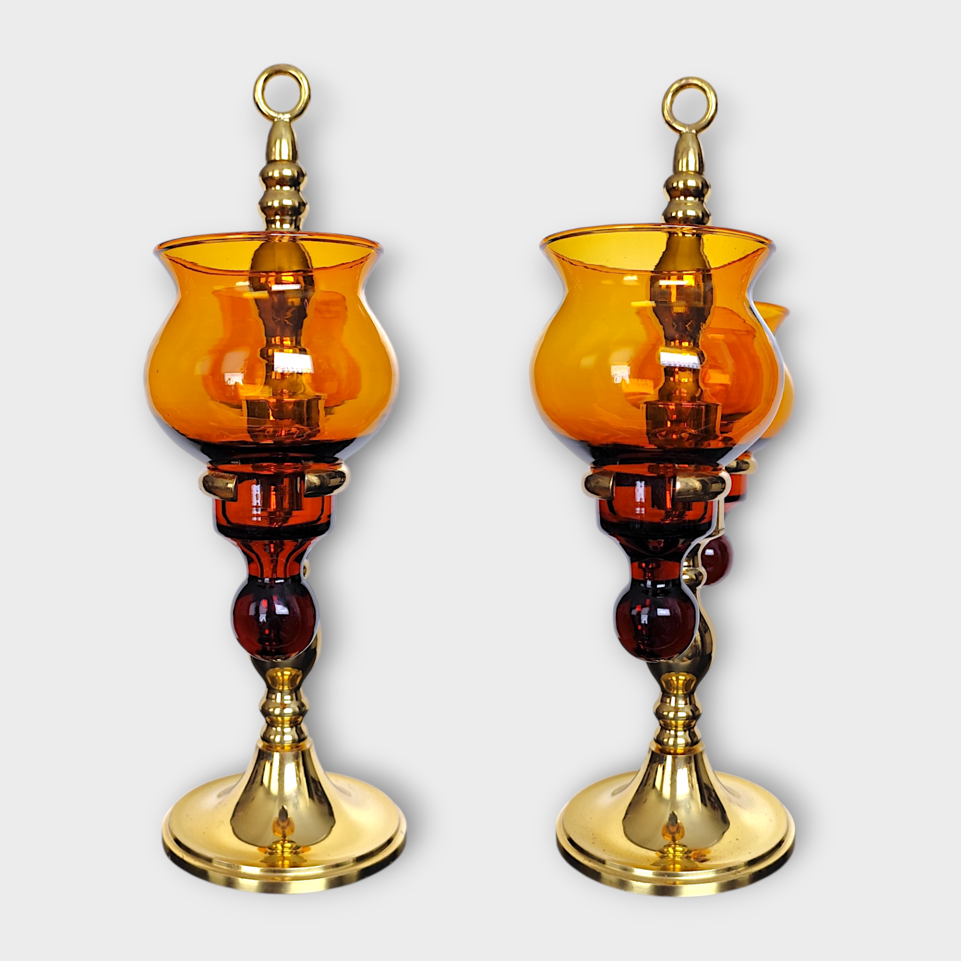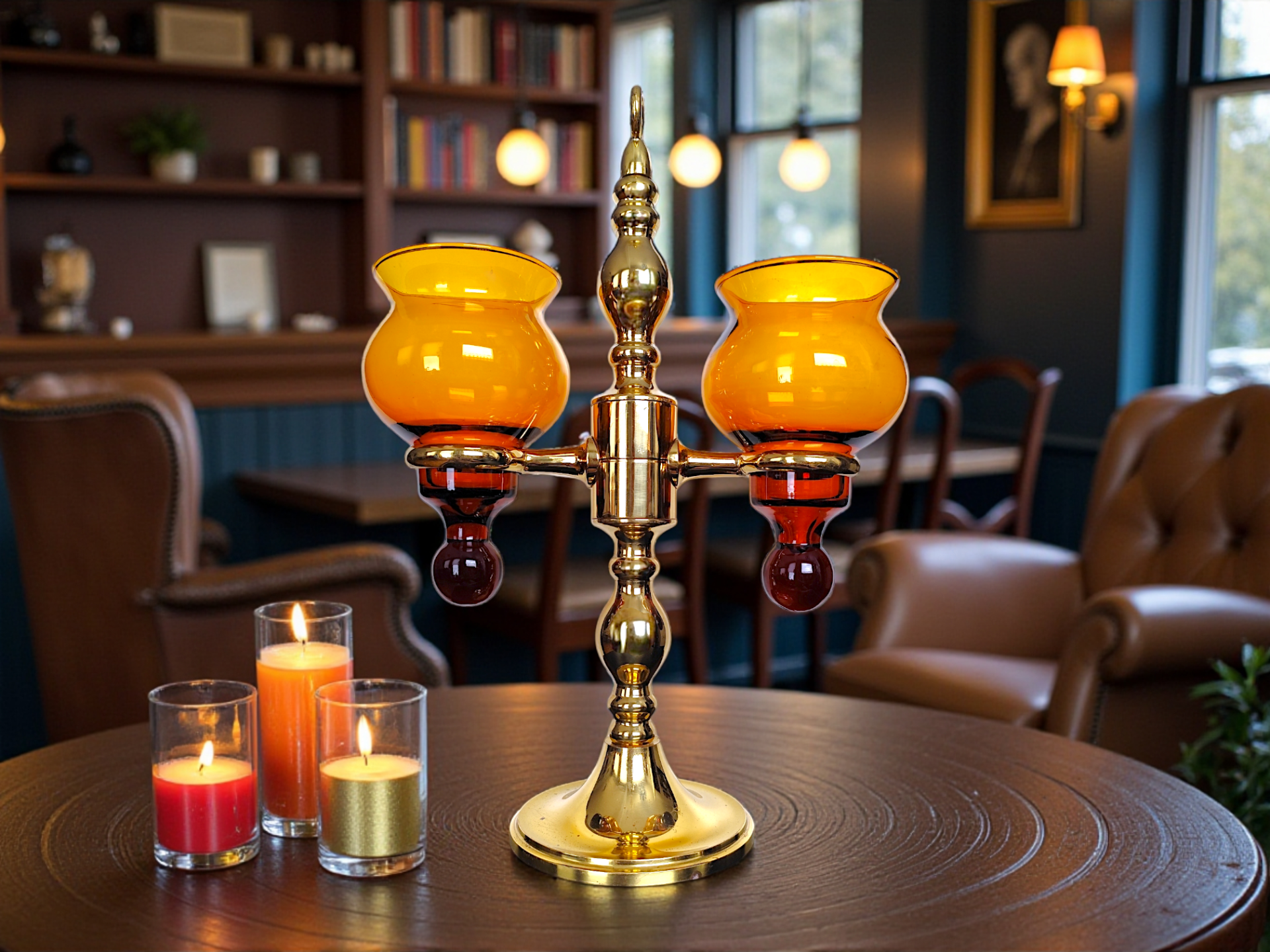 A vintage two-arm brass candlestick with orange glass shades. Similar lamps are often found in brass and glass, and the two-burner design was an early attempt to improve artificial lighting in the 19th century. The base and structure are in polished brass. Unknown maker and year.