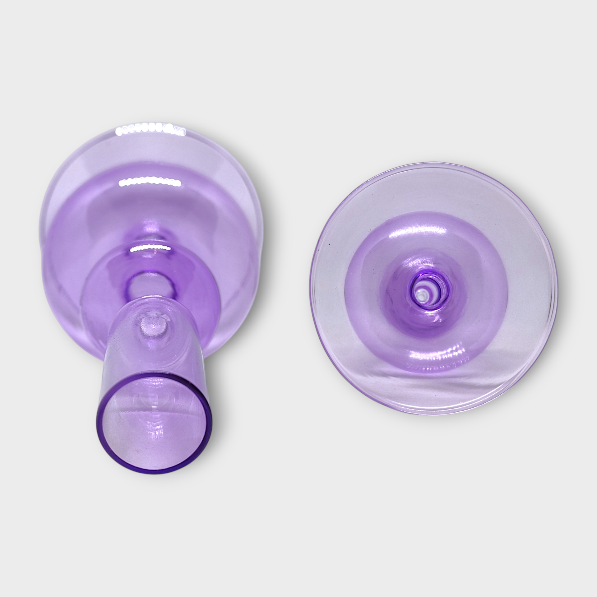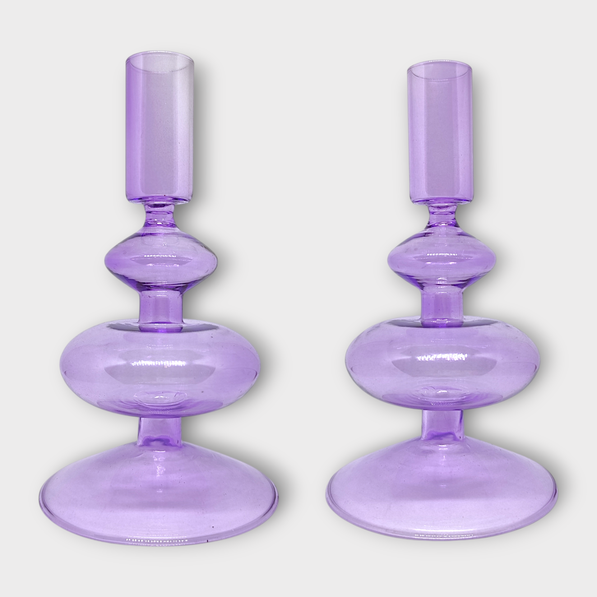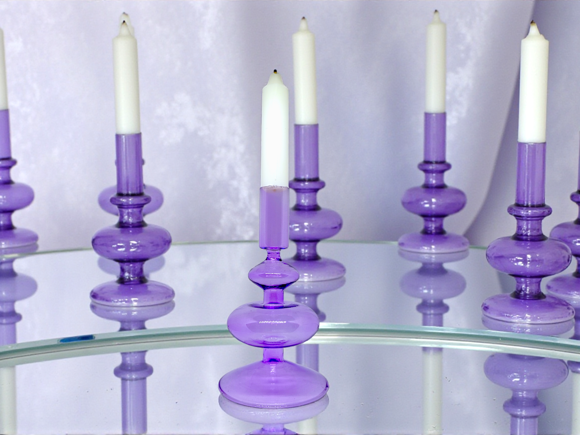 A candle holder in purple glass. Beautiful bubbly design that spreads a nice light when the candle is lit.