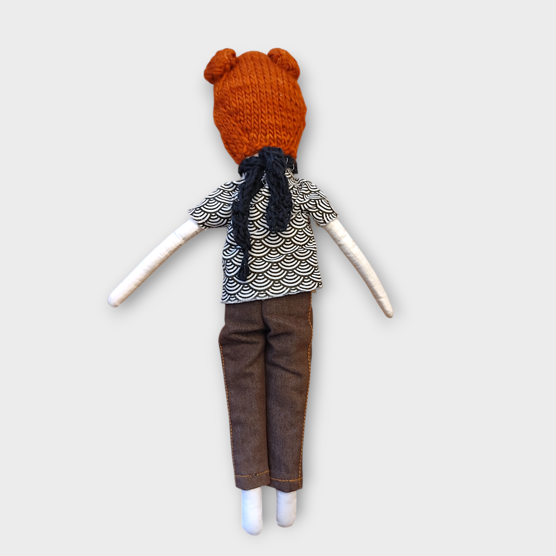 Details: Body 100% organic cotton, pre-washed, hand-knitted hair 100% Argentinian merino wool, eco-friendly eyes 100% recycled from recycled bottles. Stuffing 80% recycled polyester. Outfit 100% cotton and hand-knitted scarf.