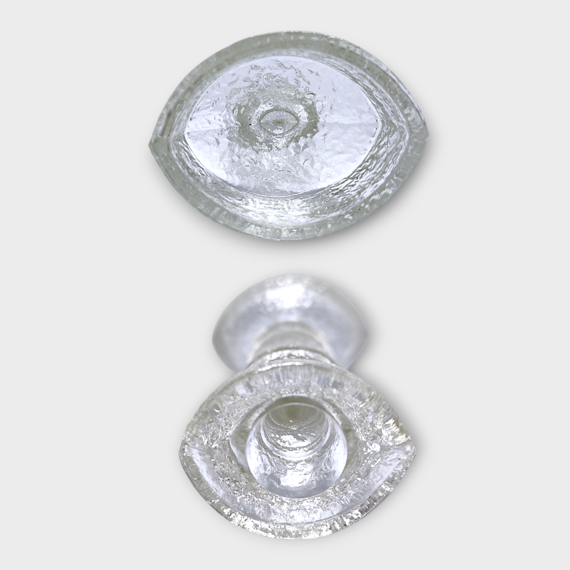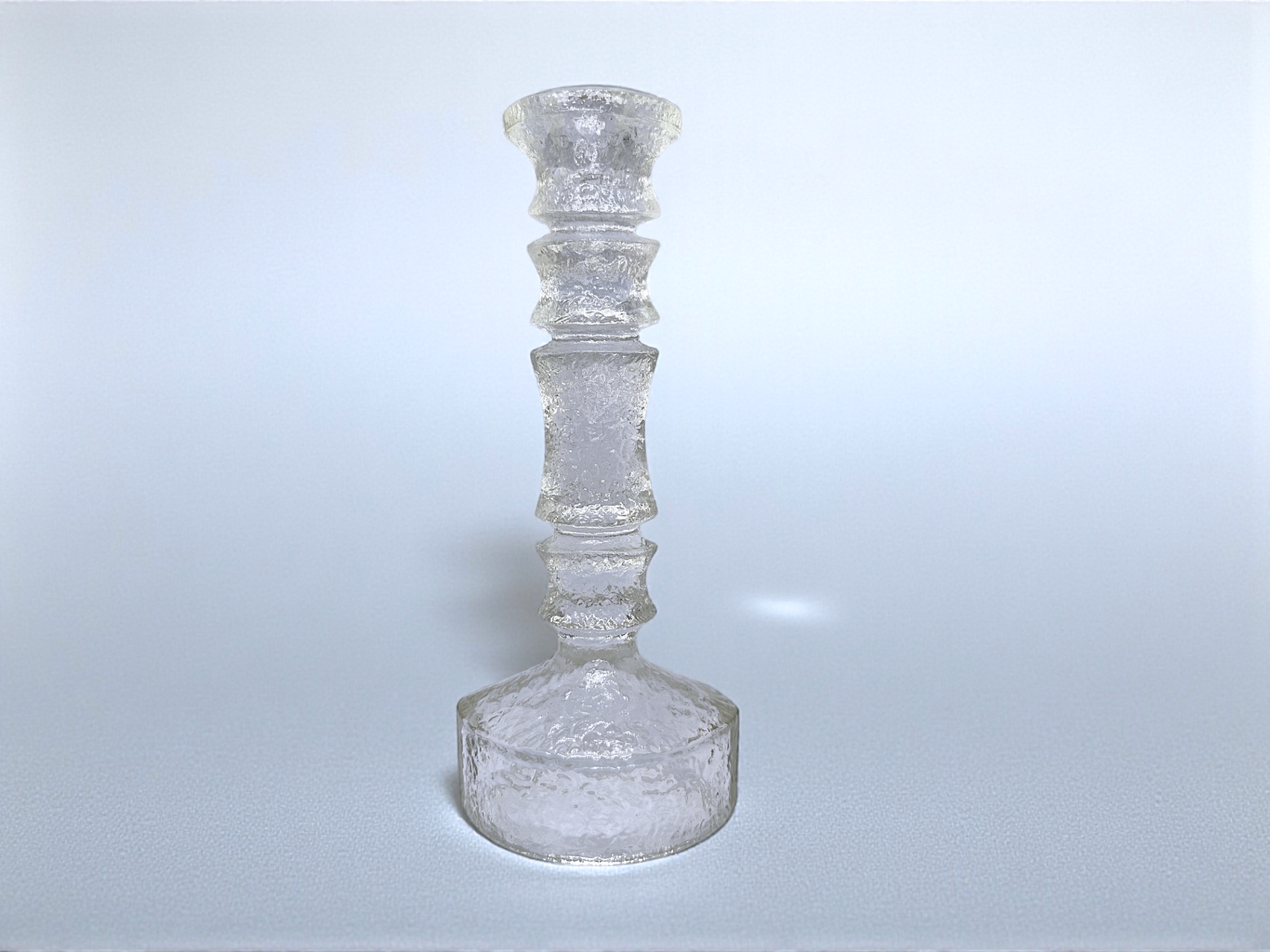 A pressed glass candlestick. It resembles Iittala, Festivo candlesticks but is not. The manufacturer and year of this candlestick are unknown.
