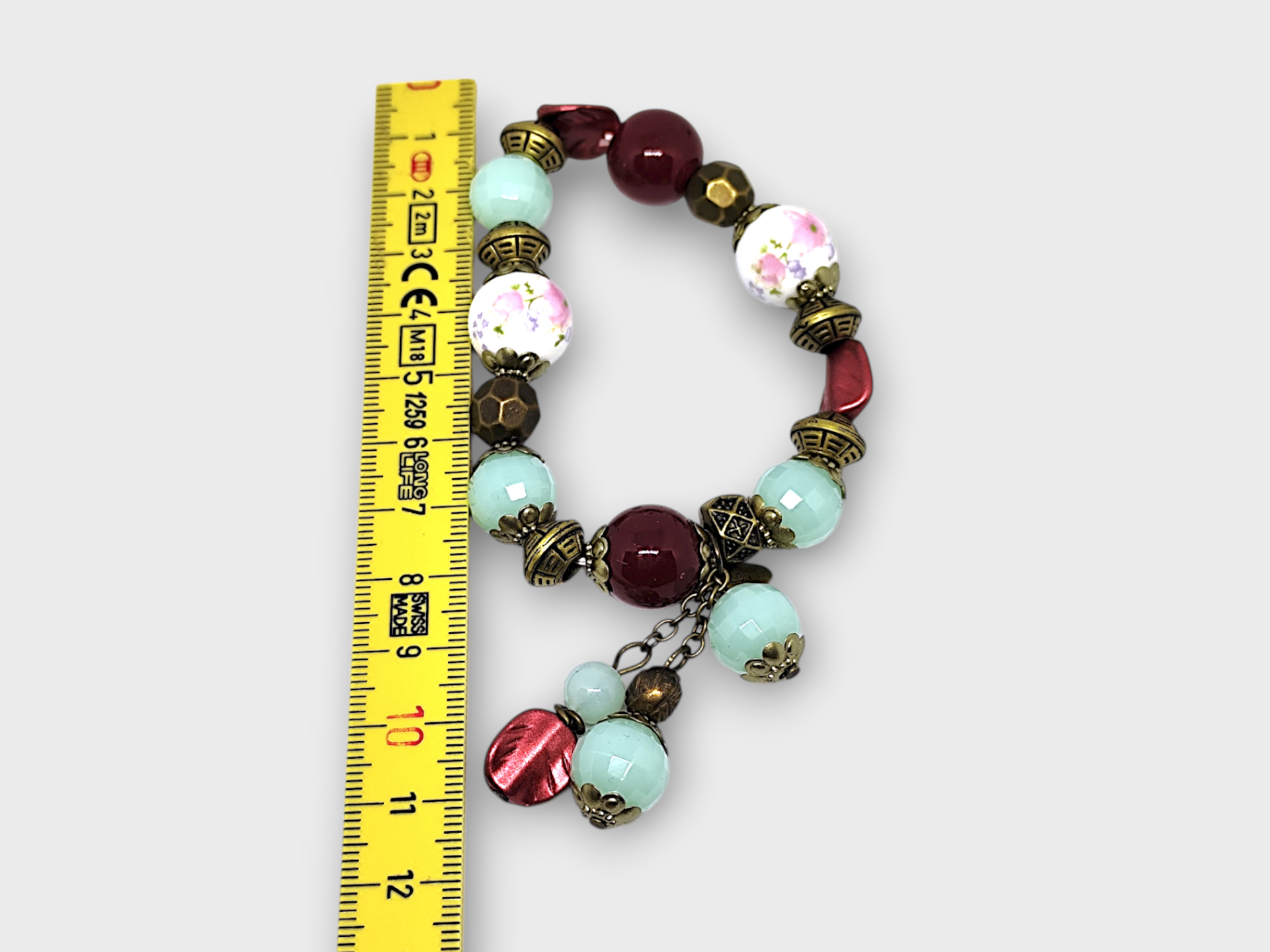 A beaded bracelet with a mix of colors and shapes. The bracelet has beads in red, white, light blue and bronze-colored details. It also has decorative pendants that give a unique touch. Made of plastic and some kind of metal.