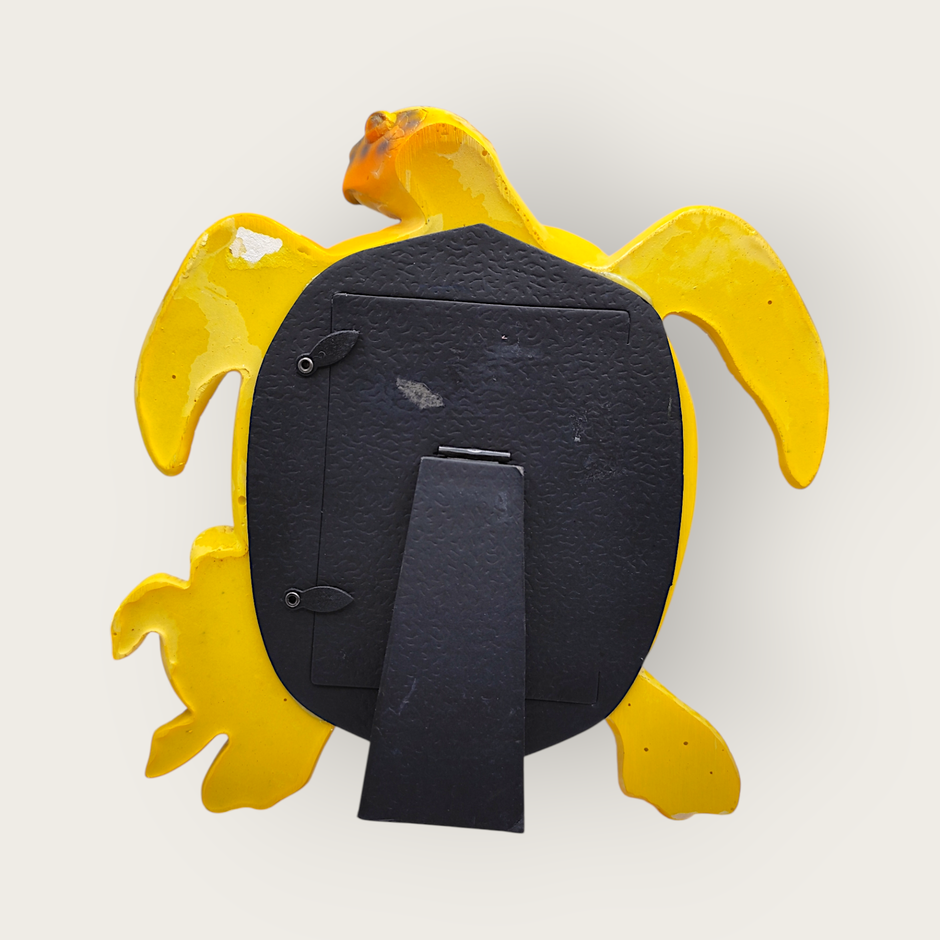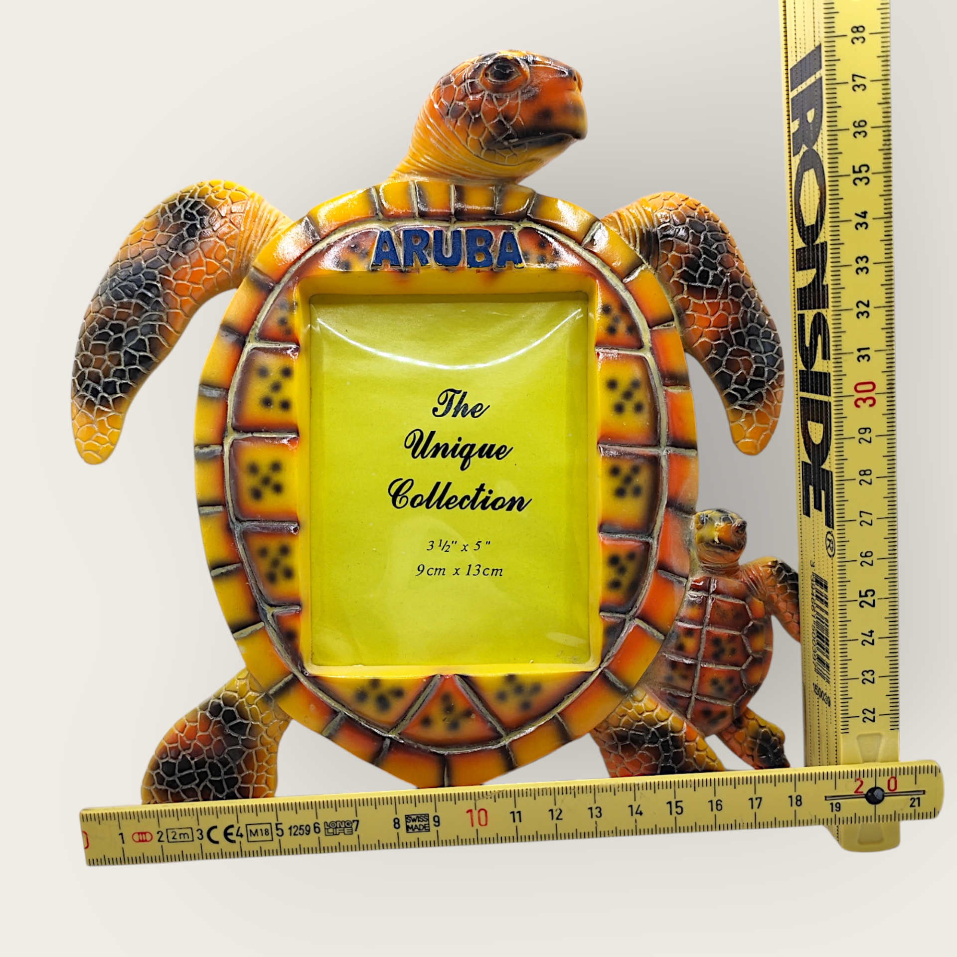 A photo frame with a sea turtle motif from "Aruba. From Aruba The Unique Collection. Made of polyresin or similar material. The frame for the photograph is made of plastic and not glass which makes it perfect for a child's room.