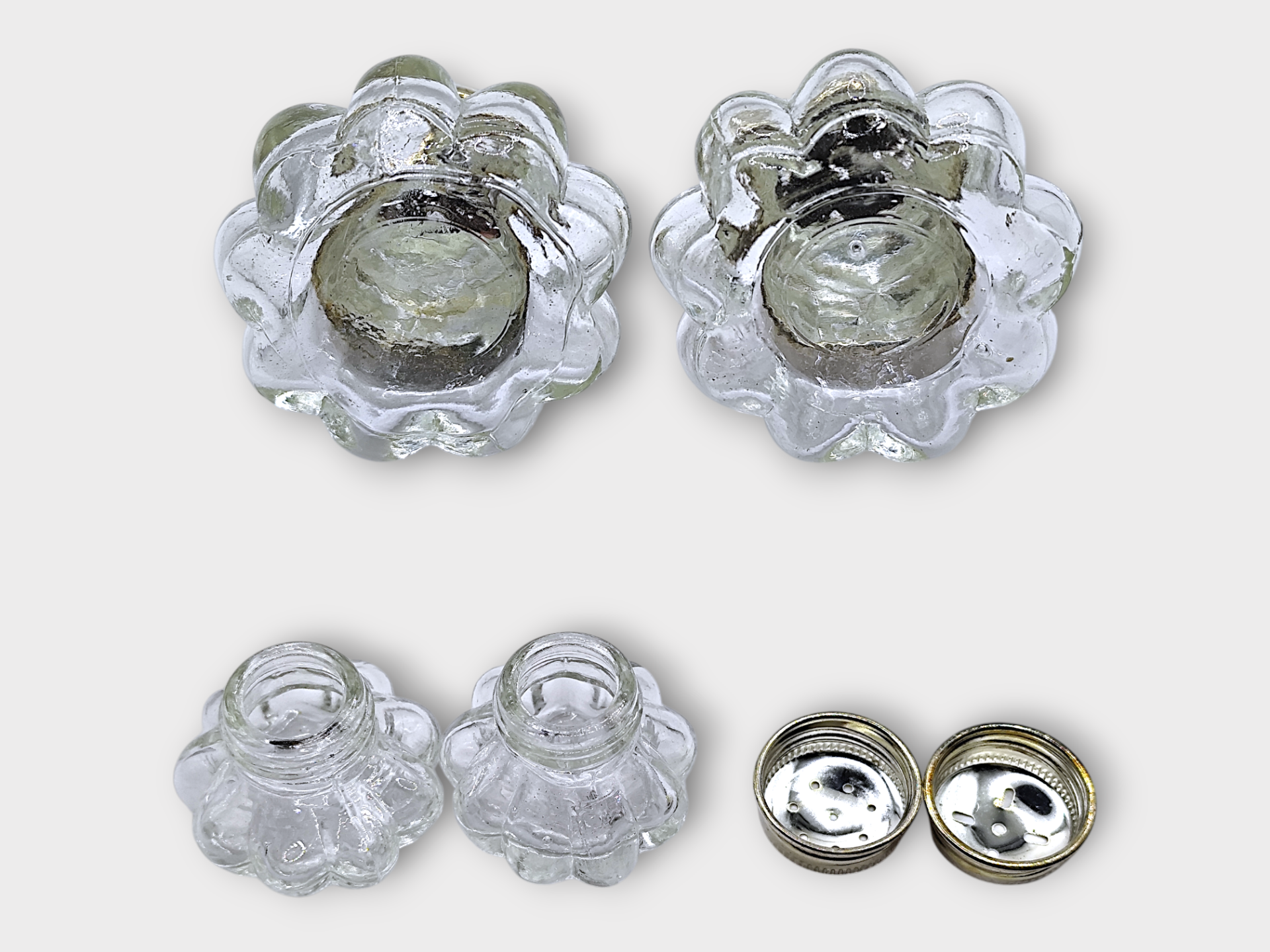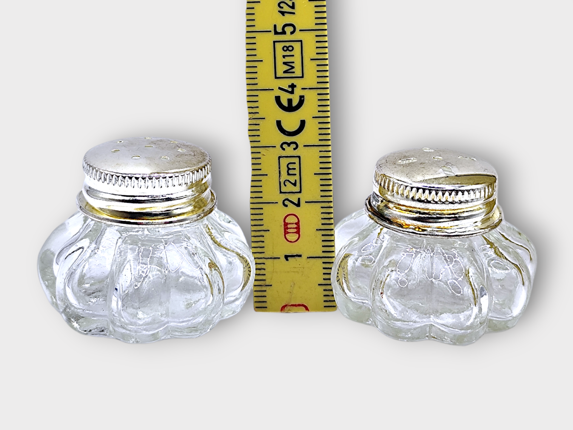 A vintage set consisting of 1 Salt and 1 Pepper Shaker. Made in England in 1950-1959. Made of glass with silver plated lids.