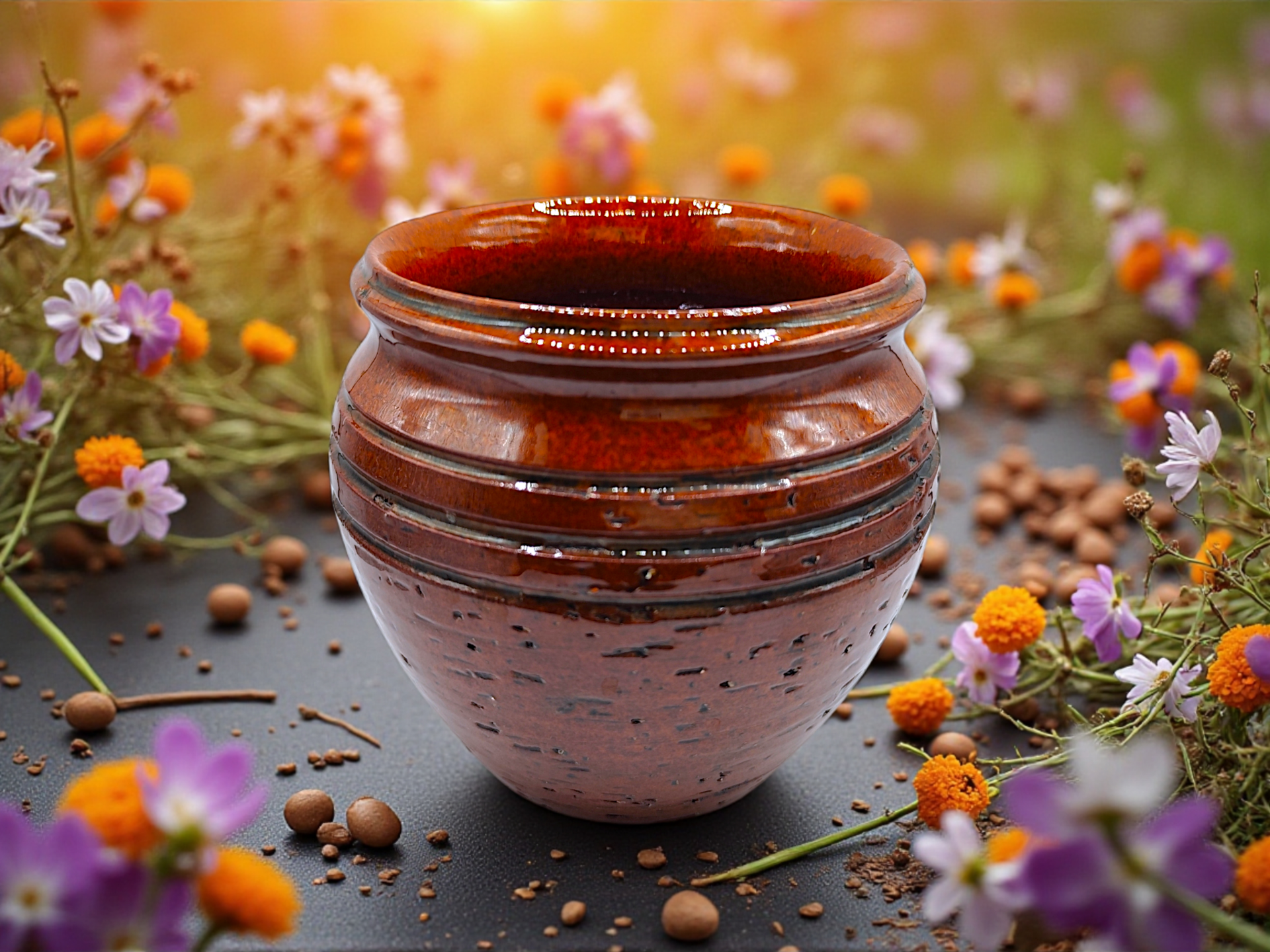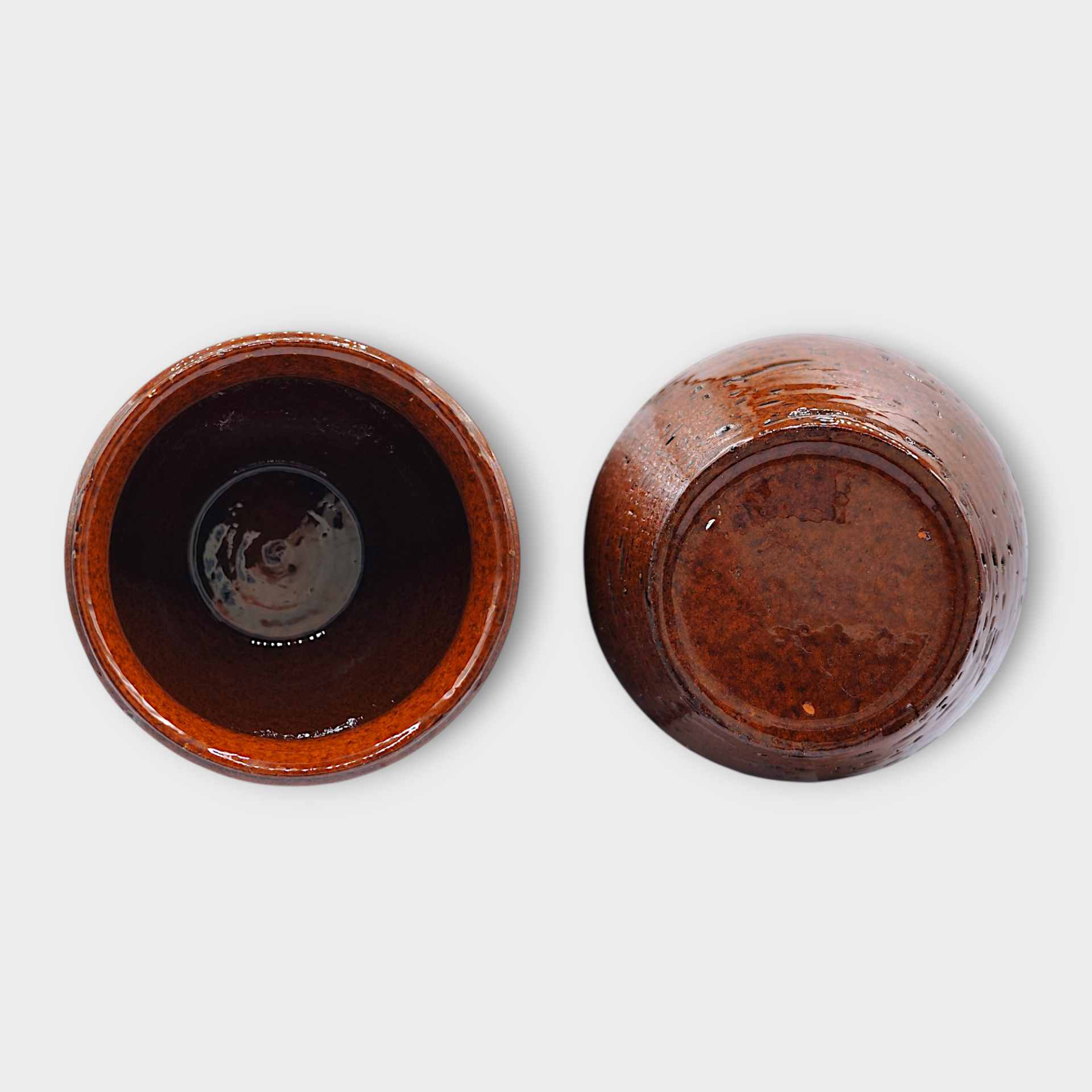 This is a small brown glazed pot or jug from Steninge Lergods, a Swedish pottery manufacturer. Made of earthenware with a brown glaze. Rounded shape with fluted bands around the middle and a textured surface underneath.