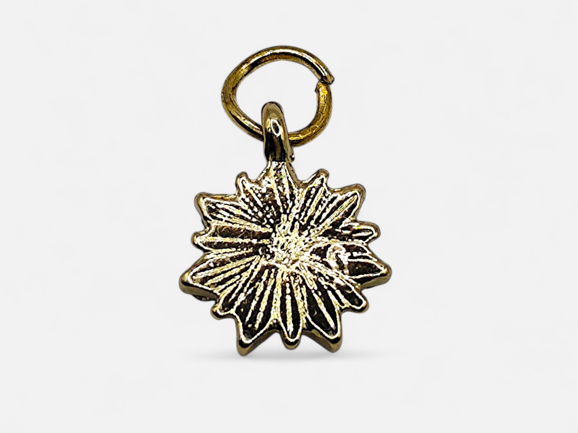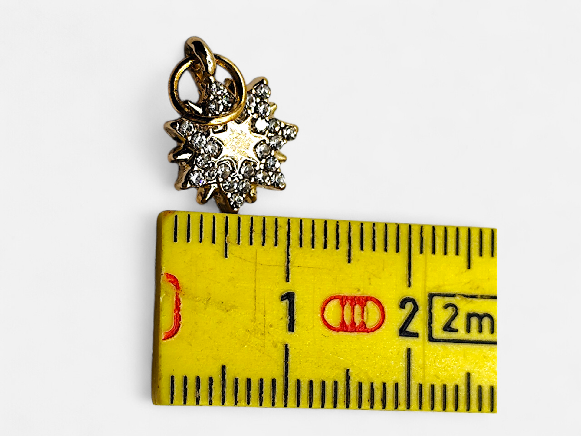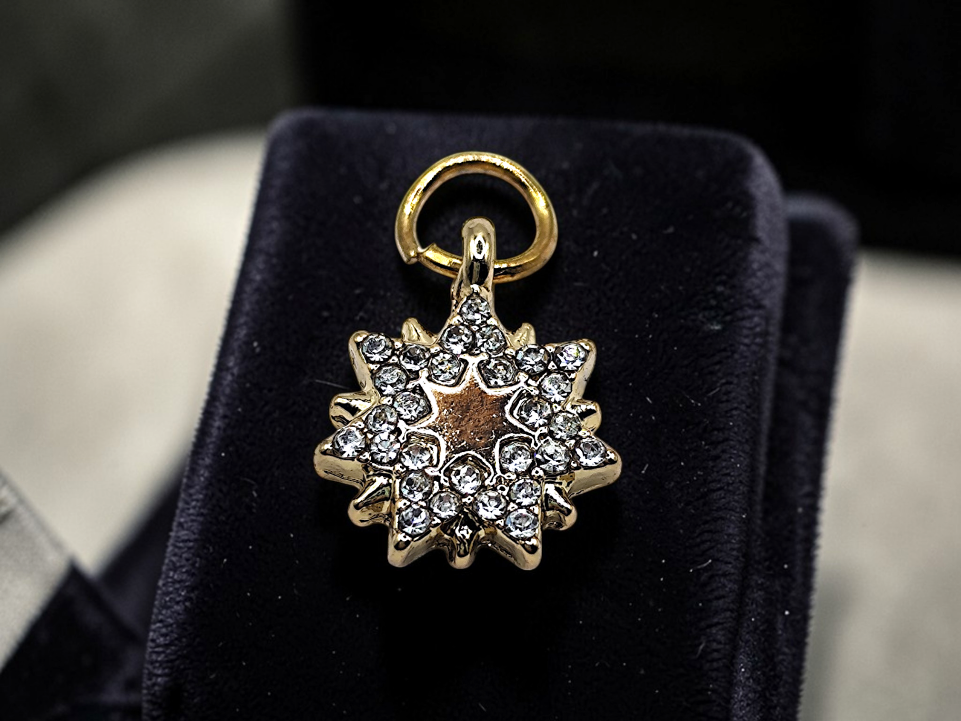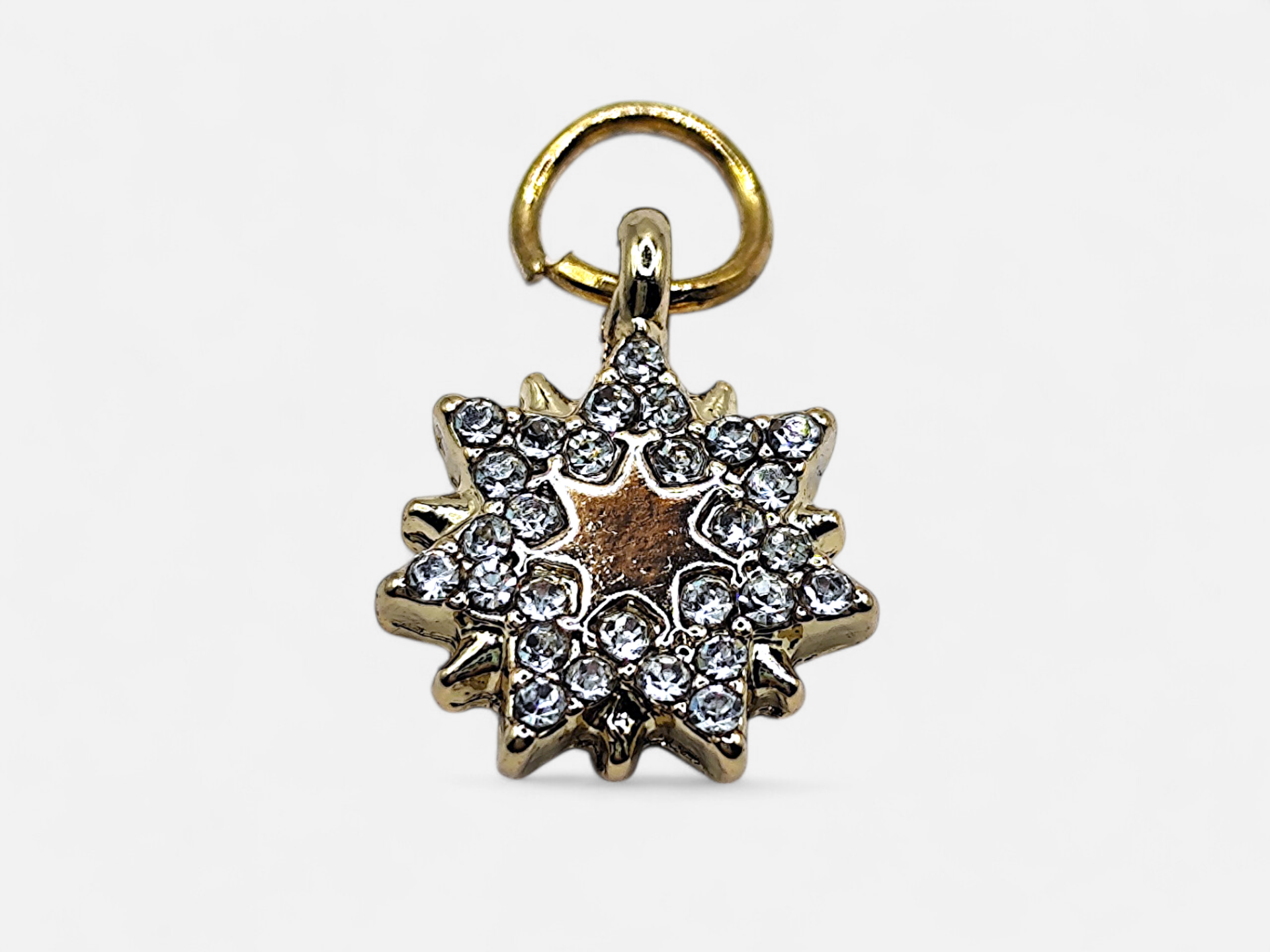A beautiful pendant in gold color, depicting a star surrounded by shimmering stones.
