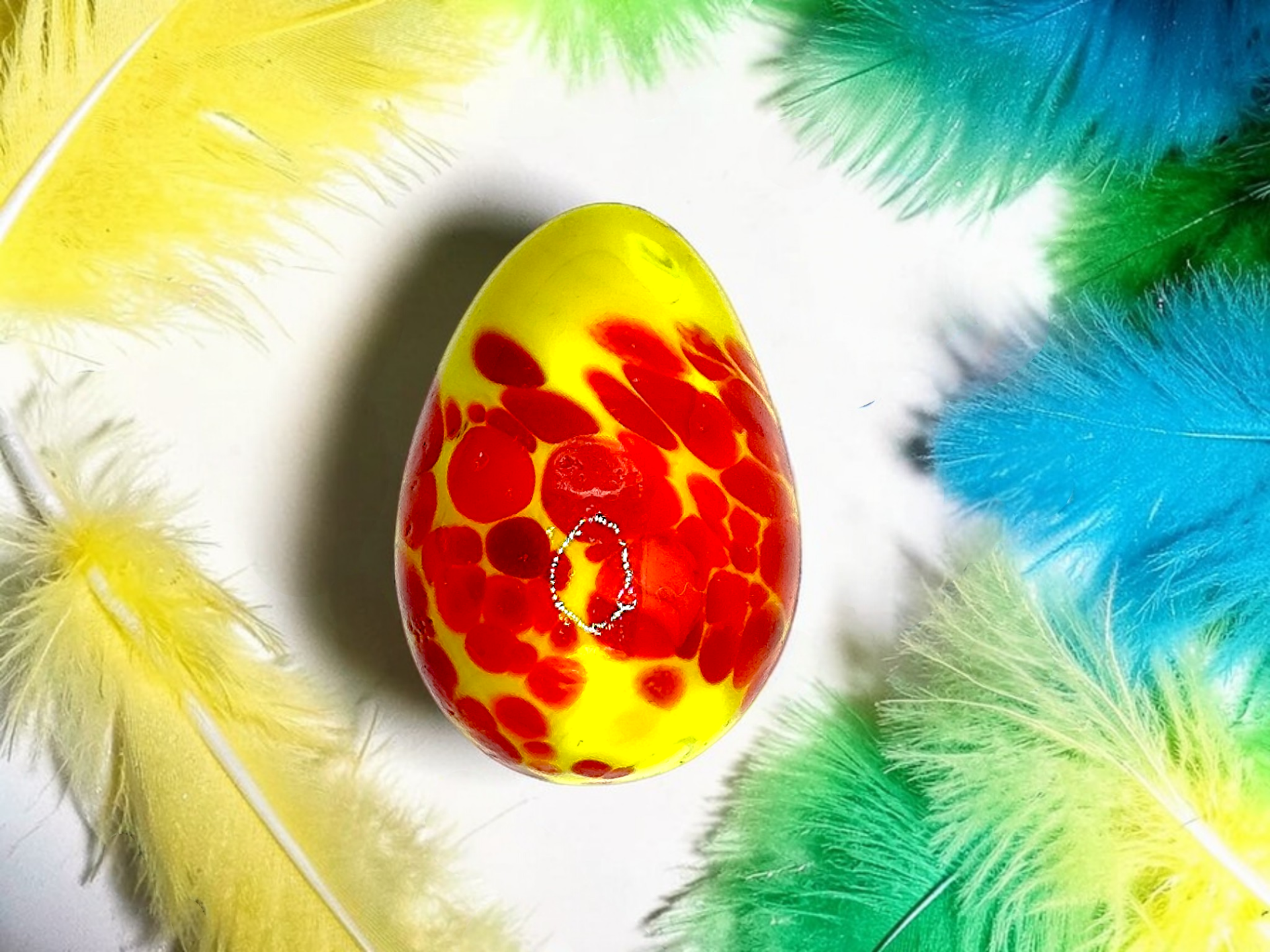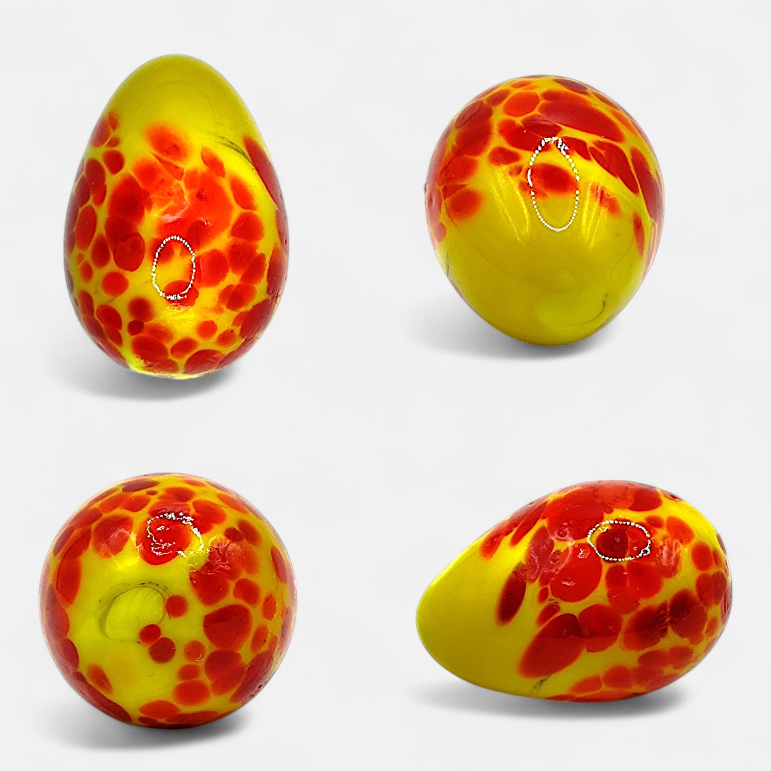 A yellow/red handmade miniature glass egg. Made in Italy by the company Land of Marbles.