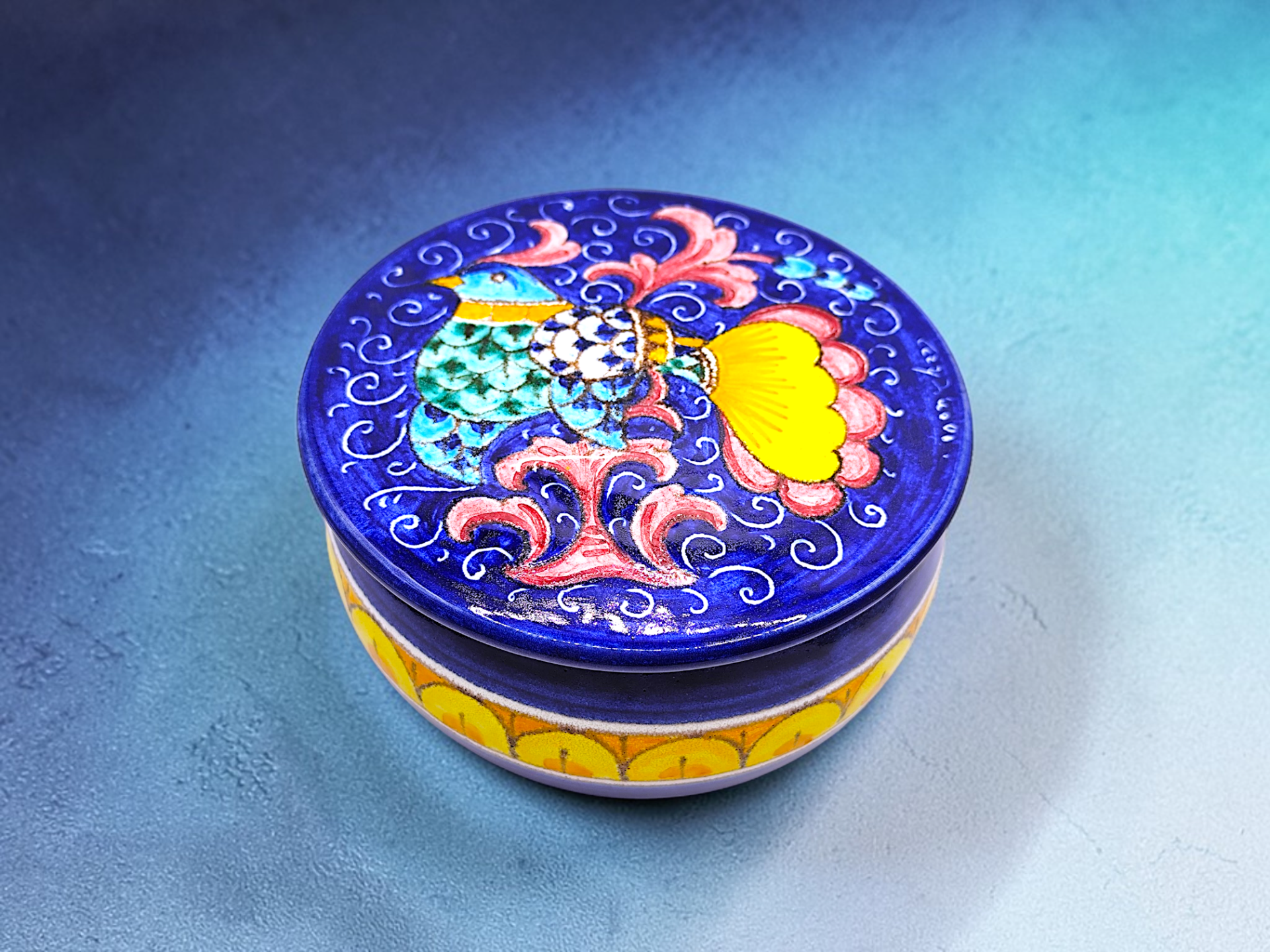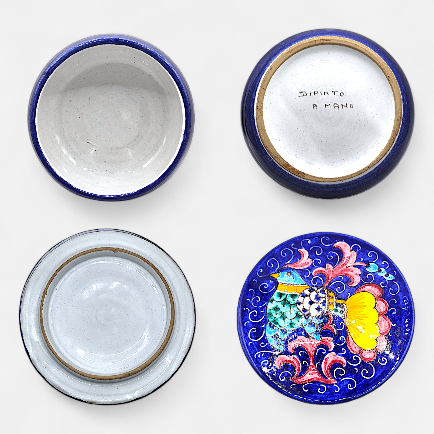 Use: Decorative object or for storing small items. The jar is marked "DIPINTO A MANO" on the underside of the lid.