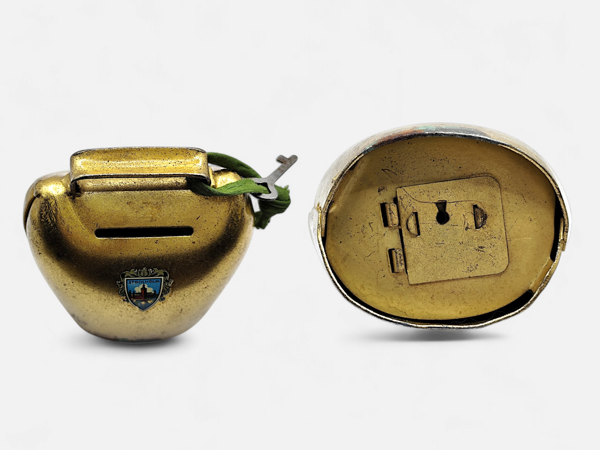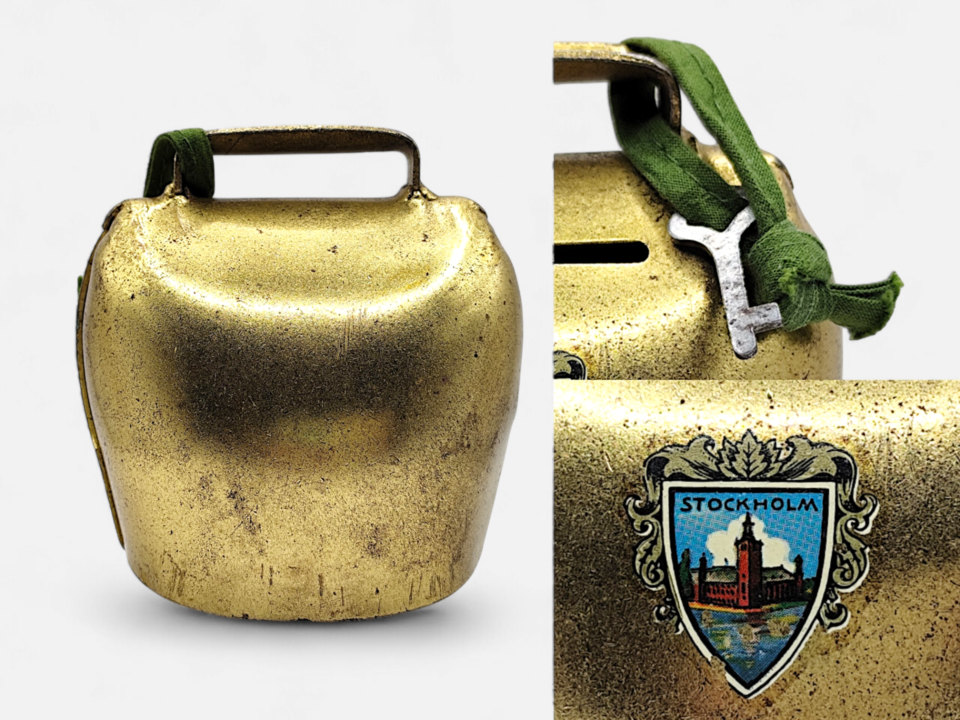 A vintage brass cowbell money box. Comes with a key. On the front of the money box is a picture of Stockholm's famous building, the City Hall, with the three gilded crowns that crown its tower.