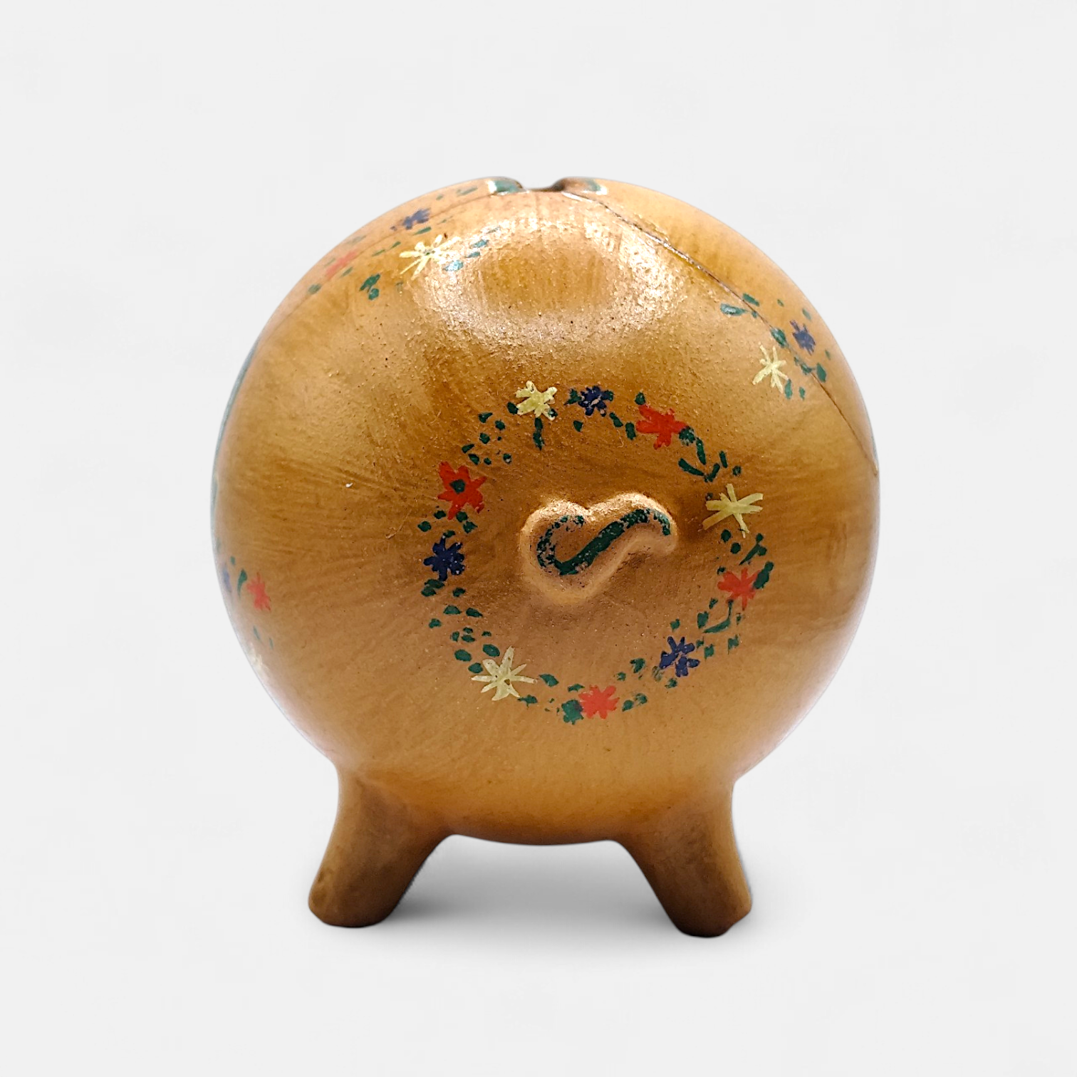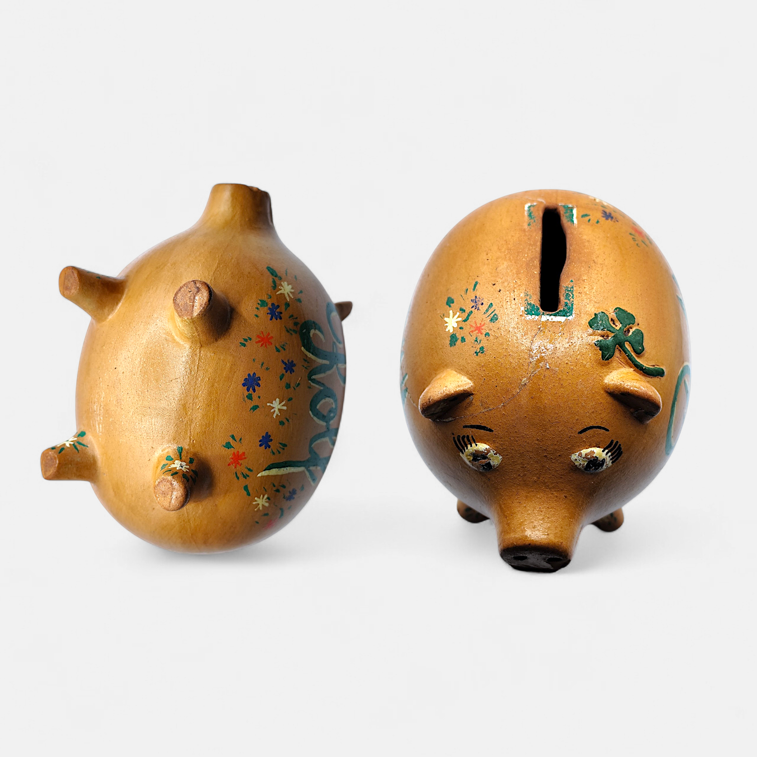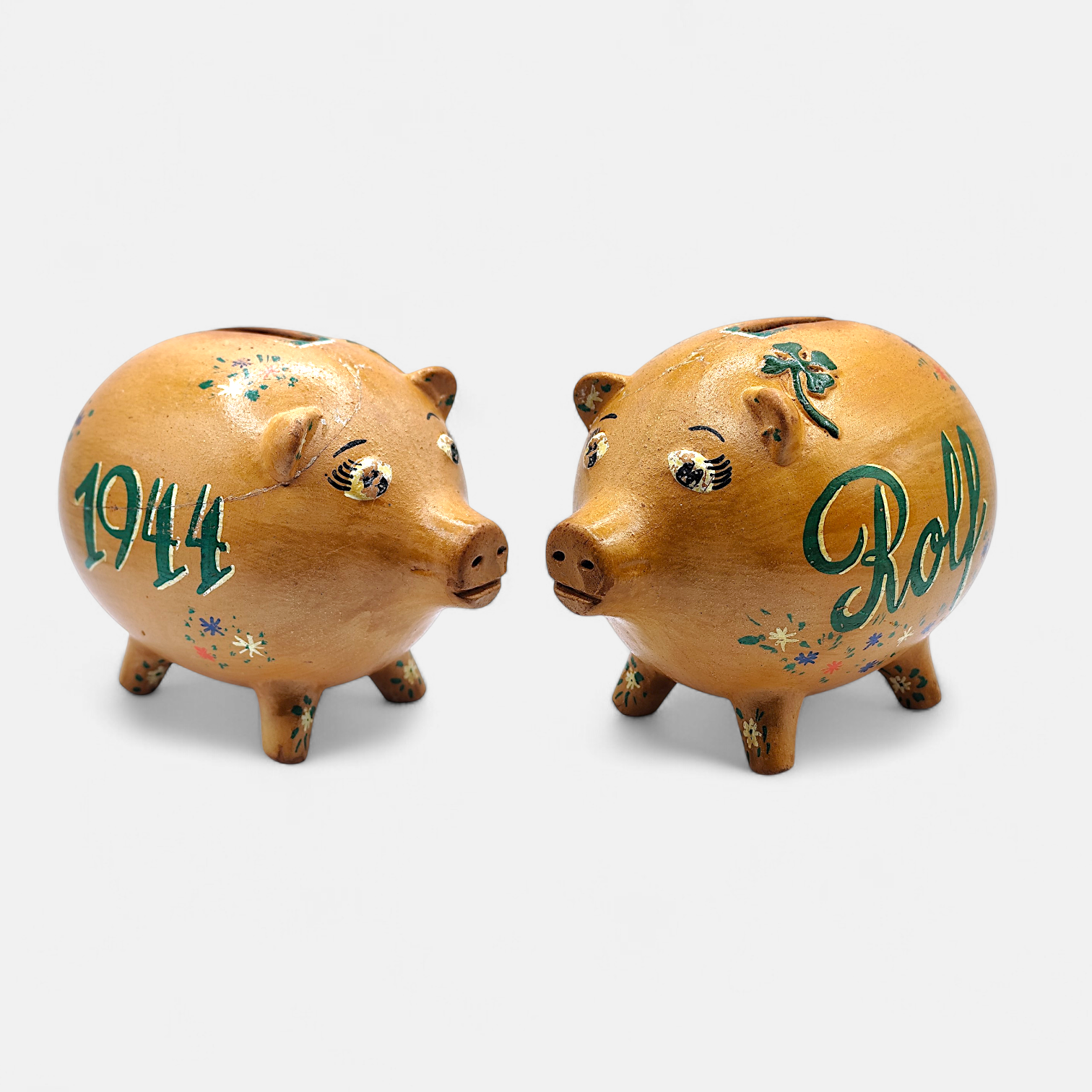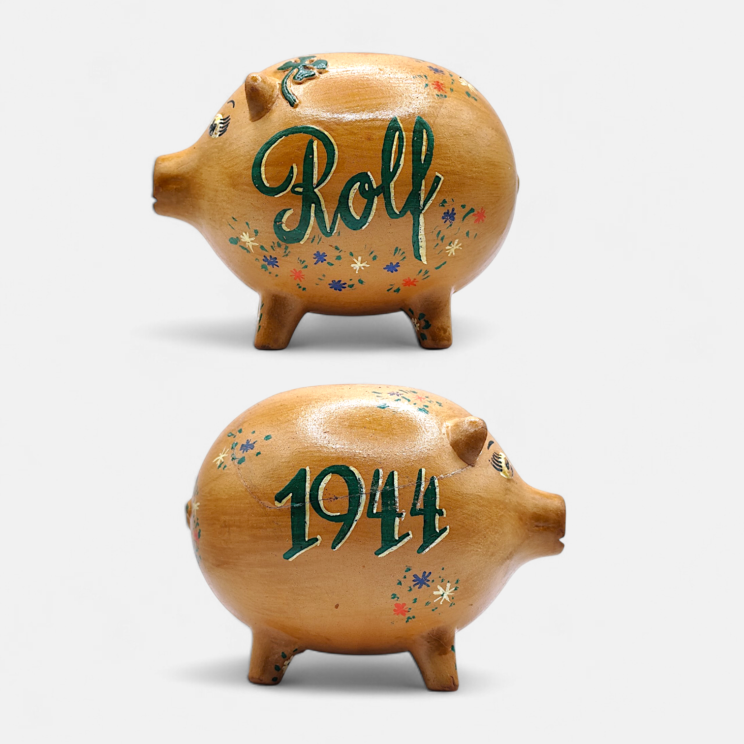 A vintage hand-painted ceramic piggy bank, decorated with the text Rolf 1944 and small flowers and four-leaf clovers (a symbol of good luck). It is a collector's item and decoration rather than a modern money box for children.