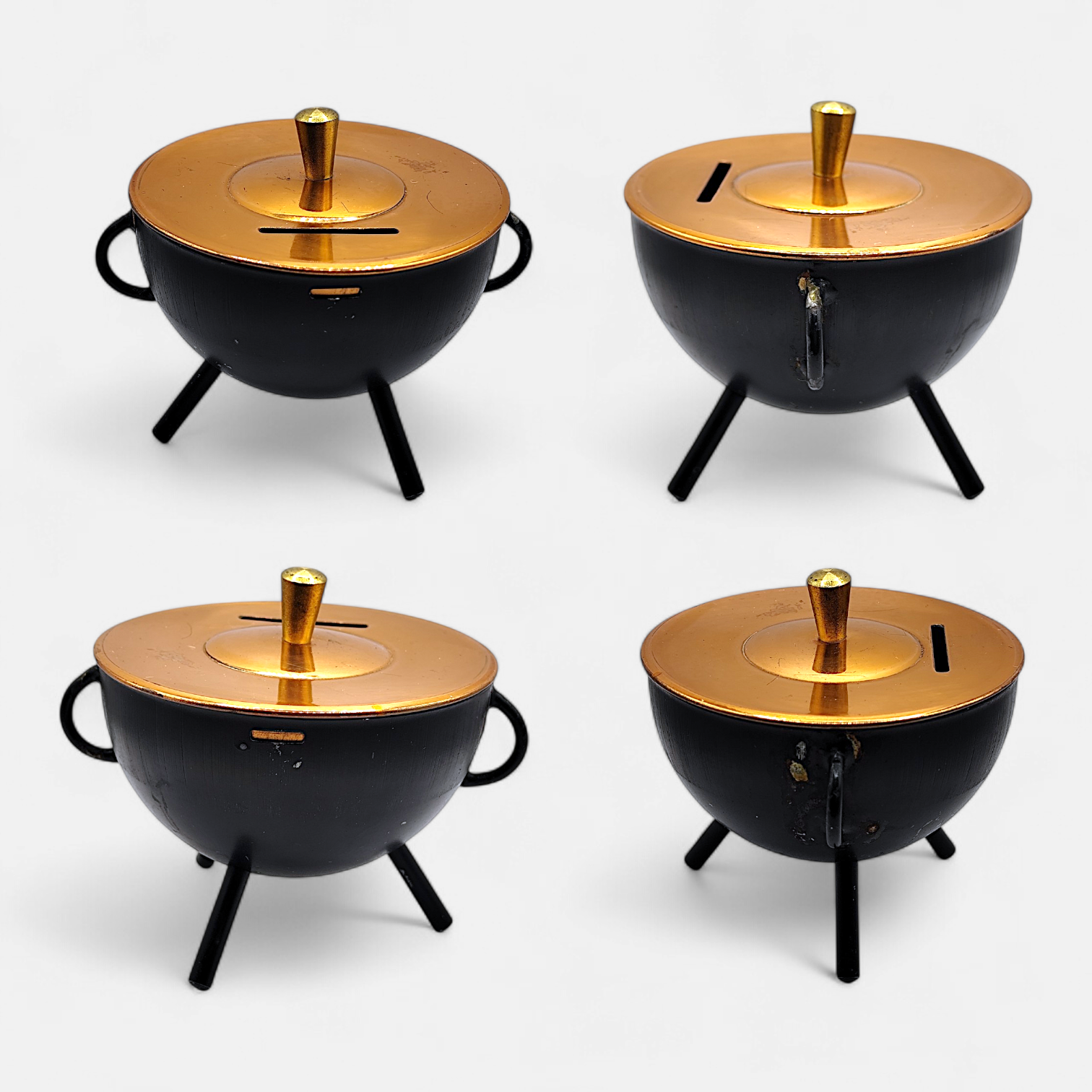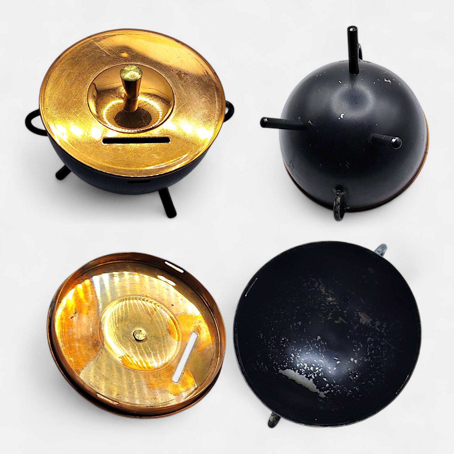 A vintage metal money box with a brass lid. These money boxes were also called kittel (which means cauldrons in Swedish), just because they looked like that. They were popular in the 50s and 60s.