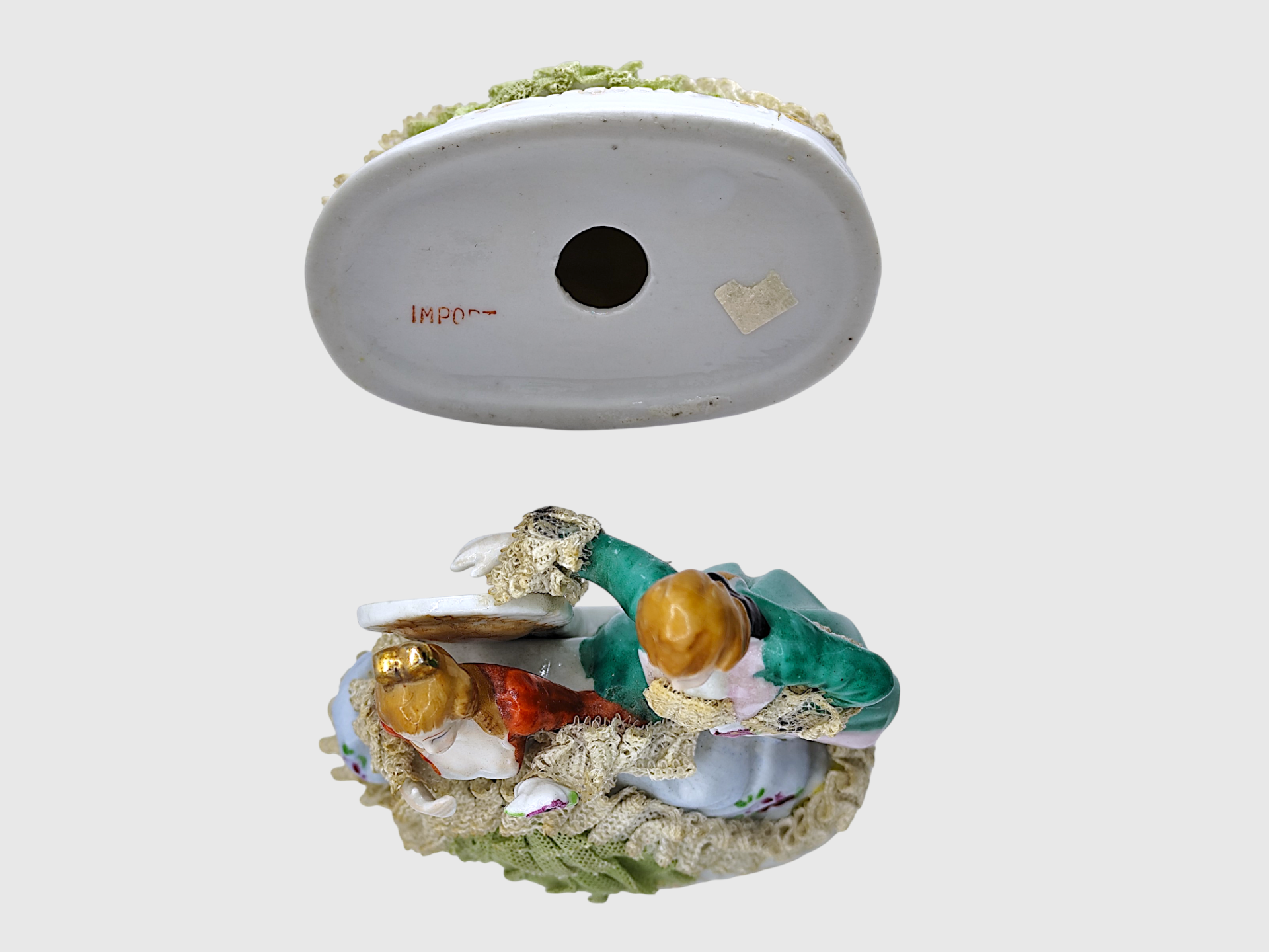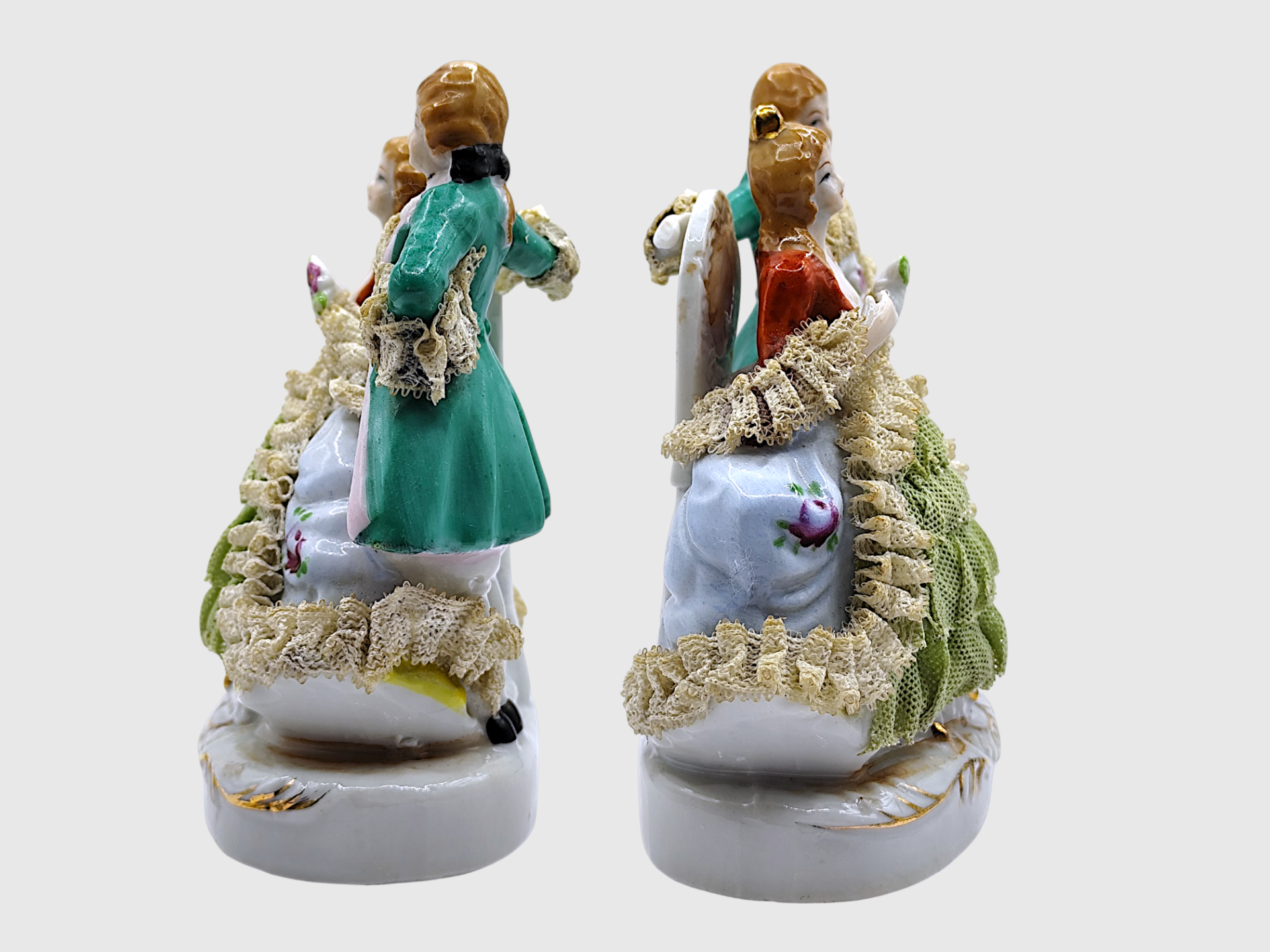 Porcelain figurine depicting a couple in beautiful lace clothing. Made of porcelain and has details in lace-like material. The colors are mainly green, white, red and gold.