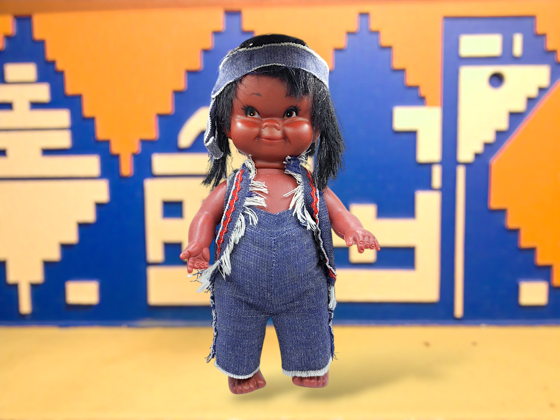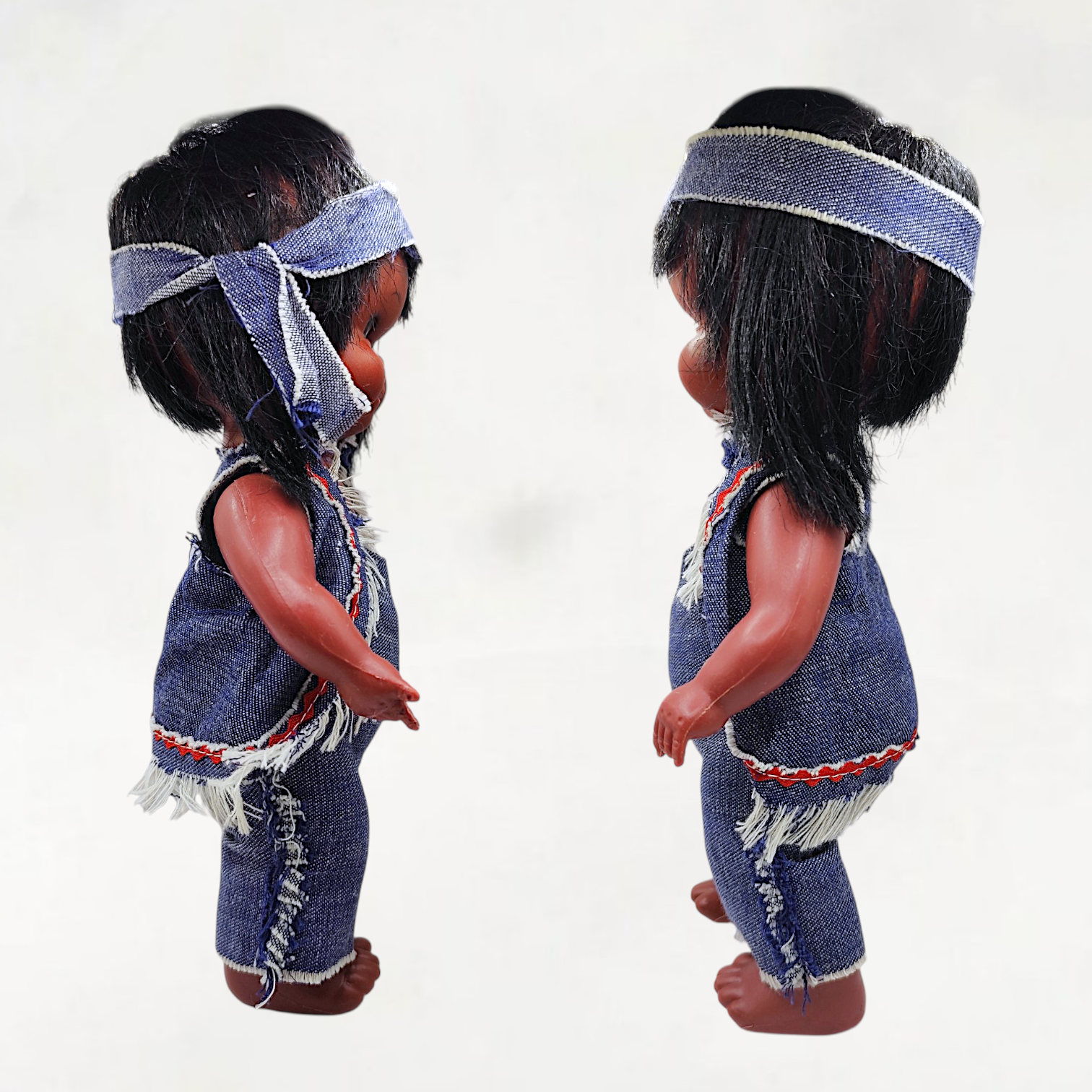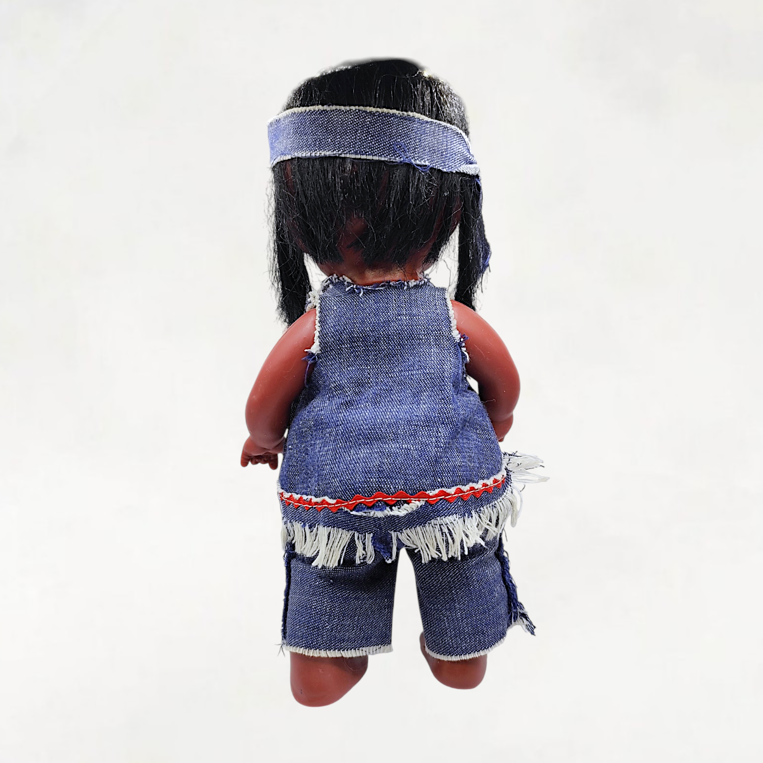 A vintage American Indian Boy doll from the 70s. Made of plastic. Marked on the back Hong Kong. Doll is reminiscent of the Regal dolls that were released in the 60s-70s.