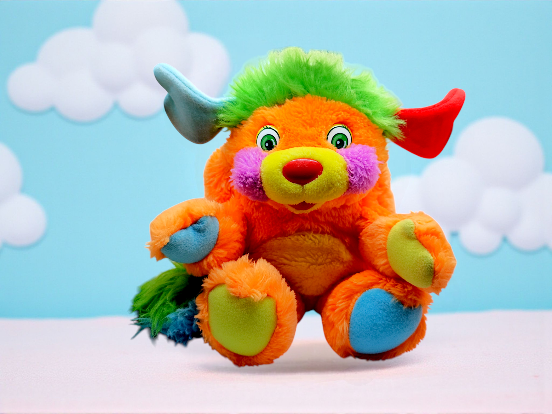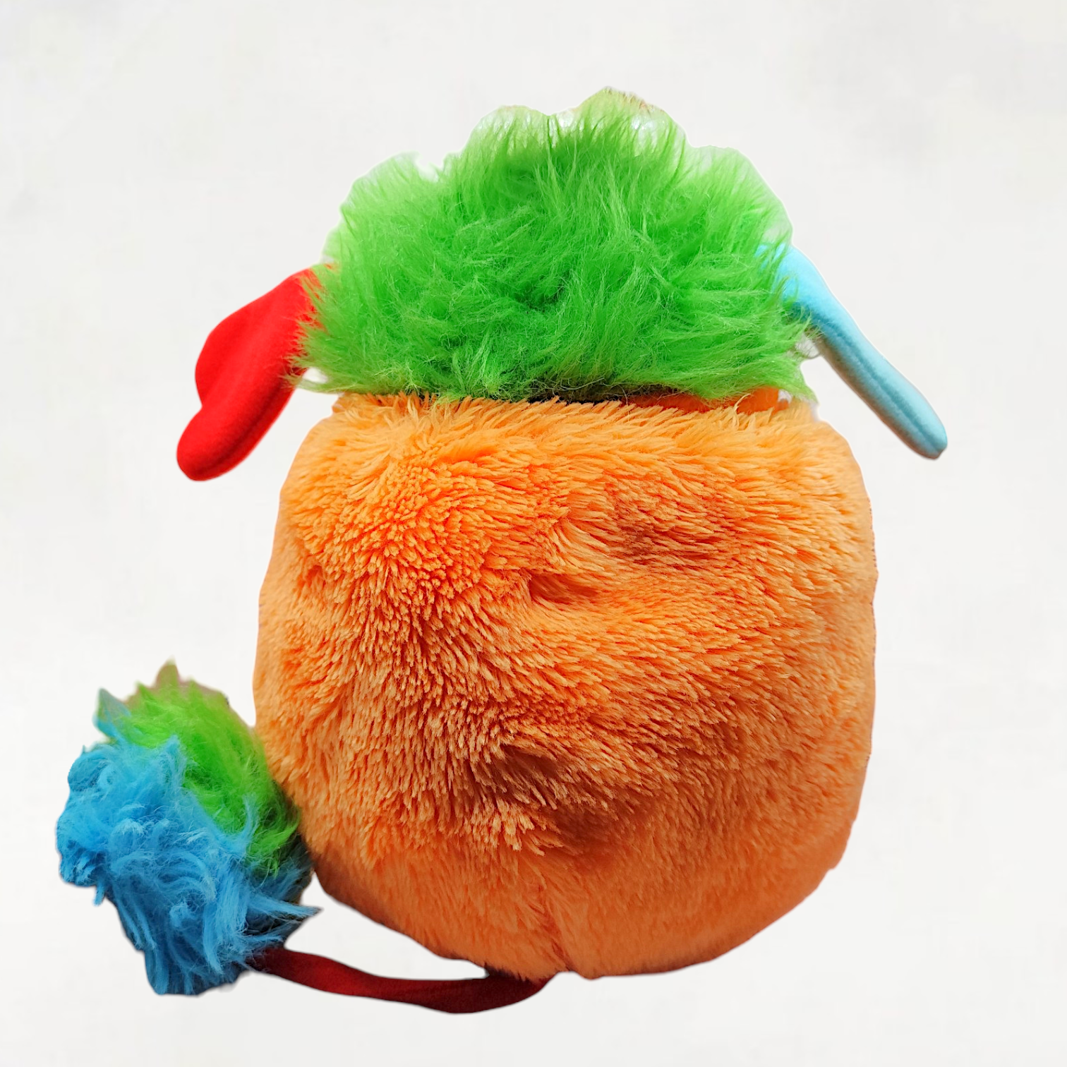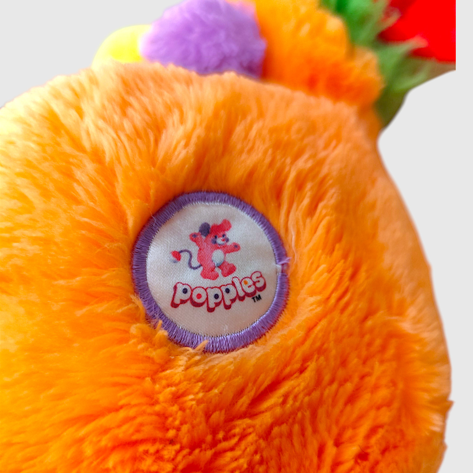 A 80s vintage Popples stuffed animal in orange with green hair. The stuffed animal has blue and red ears, and a green and blue tail. The brand "Popples" is on a label on the side of the stuffed animal. It is a popular toy line originally launched and created by American Greetings, and the brand is now owned by Hasbro.
