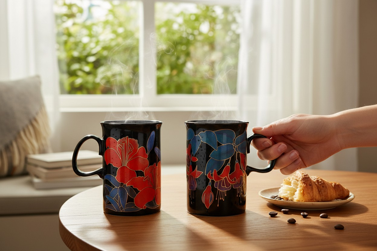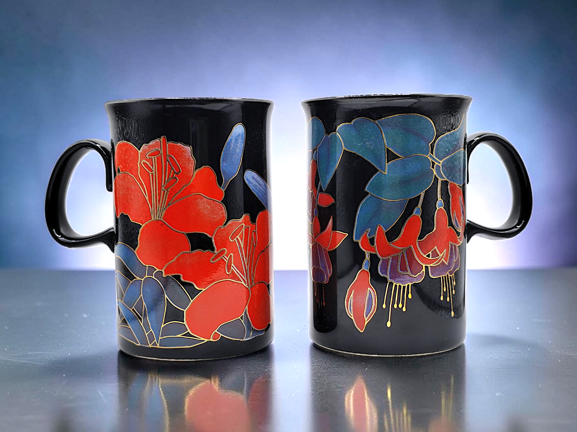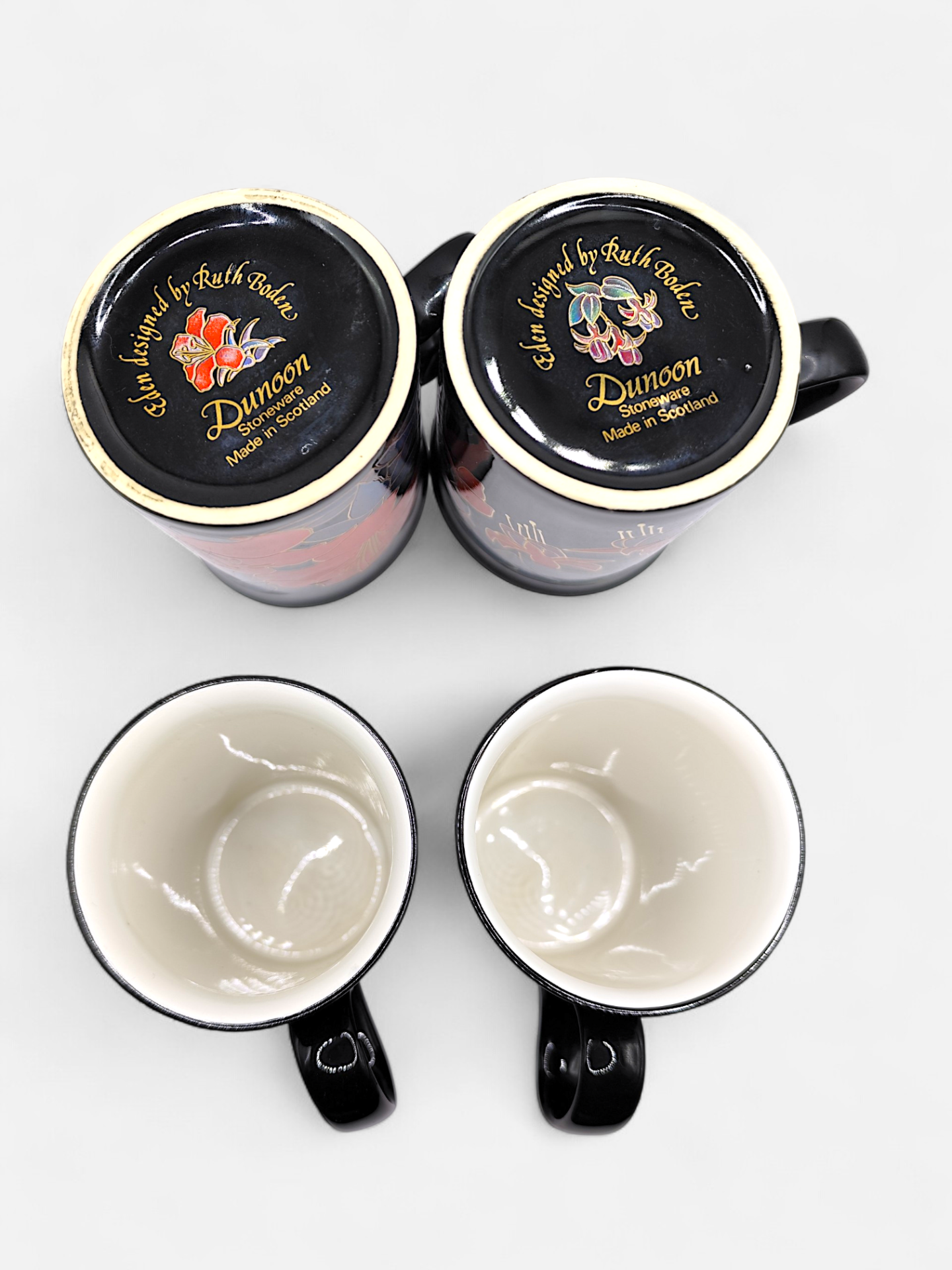 Two vintage 80s beautiful coffee mugs with a stunning floral design. Marked on the bottom Eden designed by Ruth Boden Dunoon stoneware made in Scotland. Fantastic mugs to add to your collection.