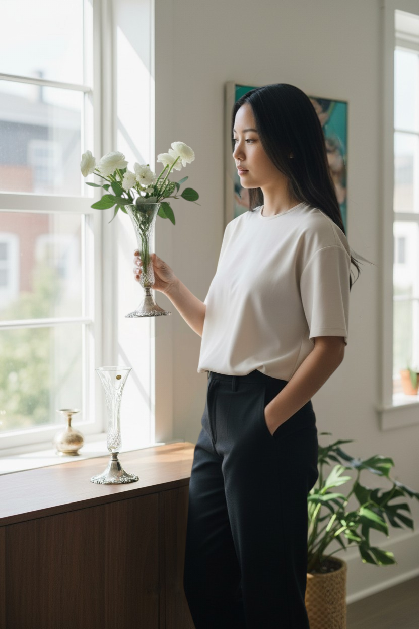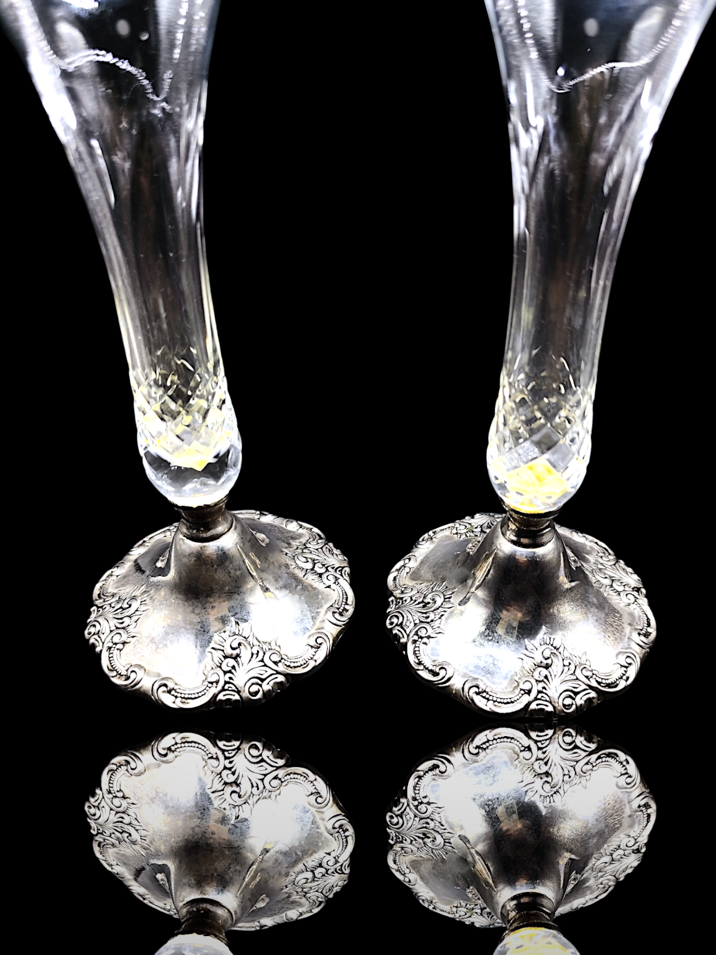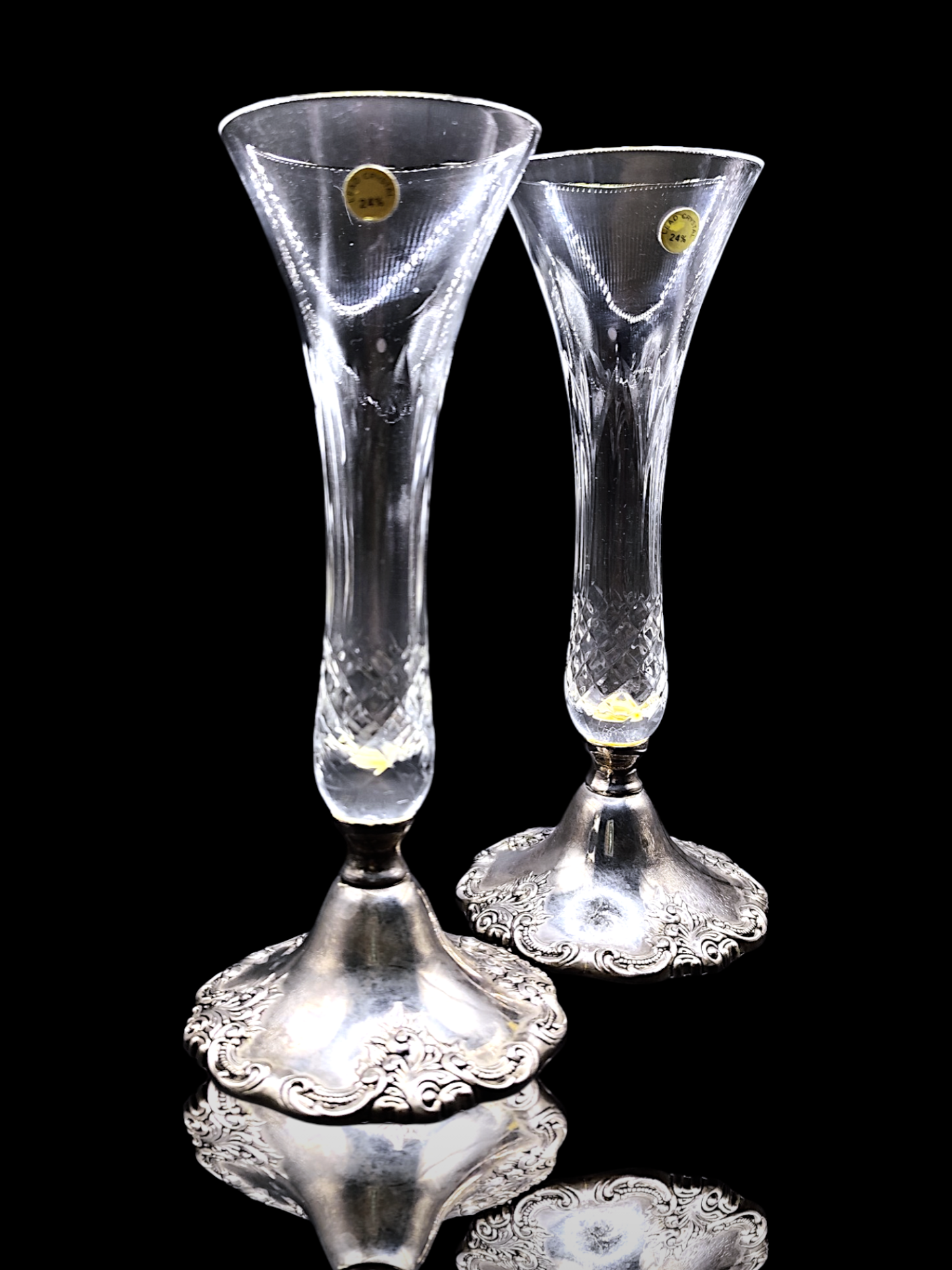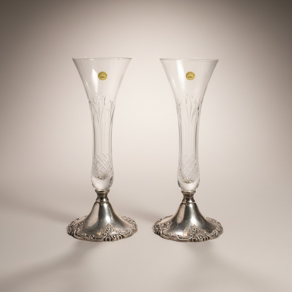 Two vases with a combination of crystal and silver-plated metal. The crystal vases have an elegant shape and are attached to a silver-plated base with detailed patterns. The base is provided with green felt underneath. Made in the 20th century.