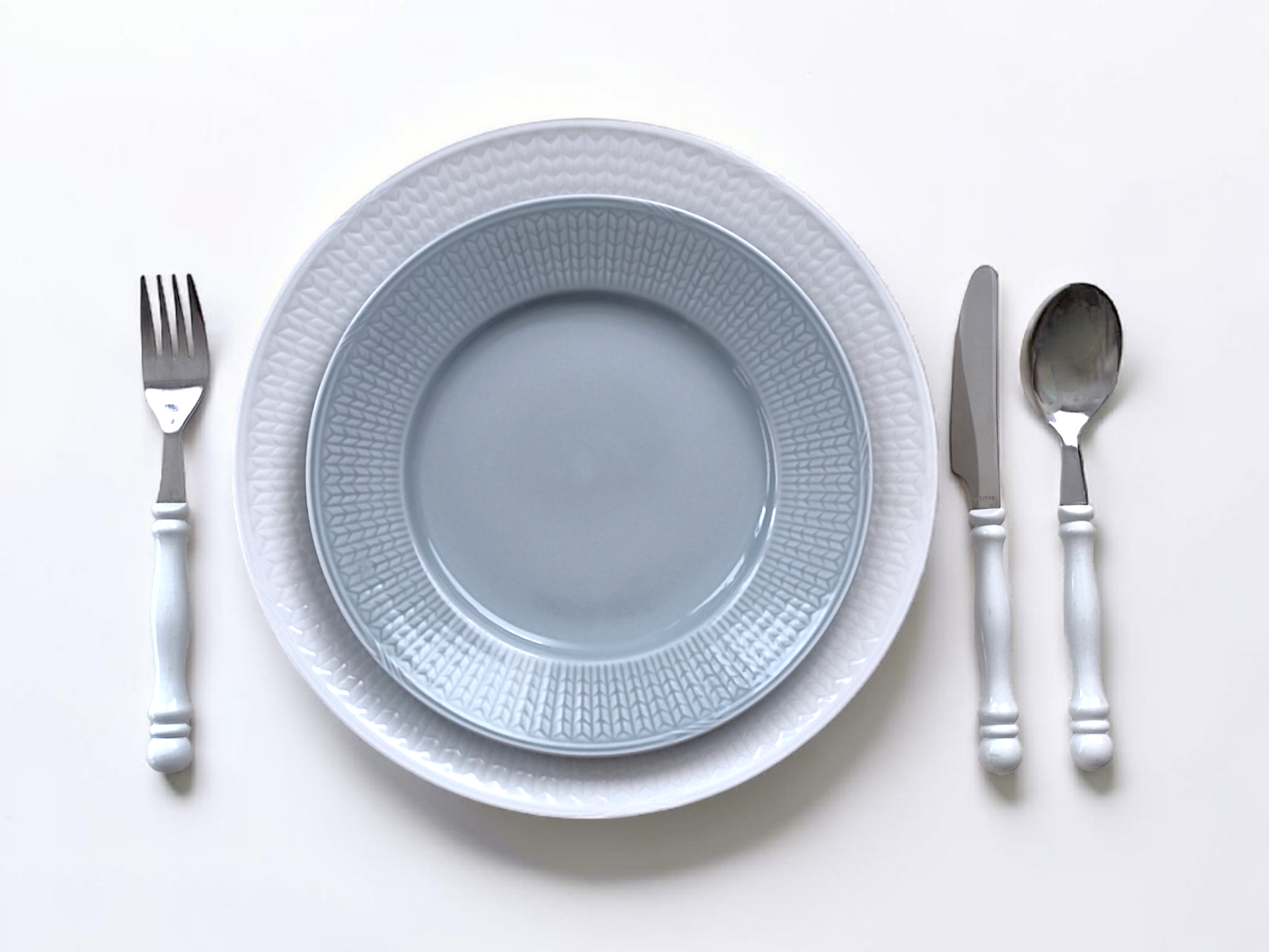 The cutlery has white handles made of plastic and is marked with "ROSTFREI" on the blades.