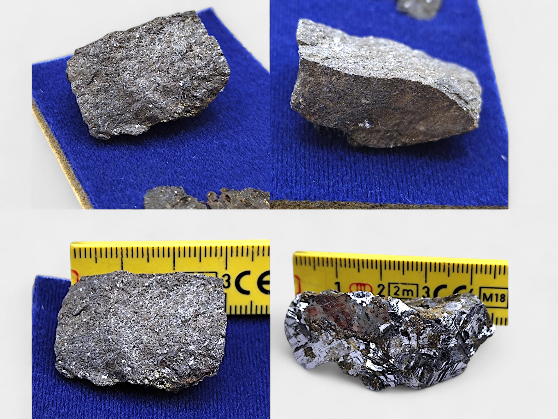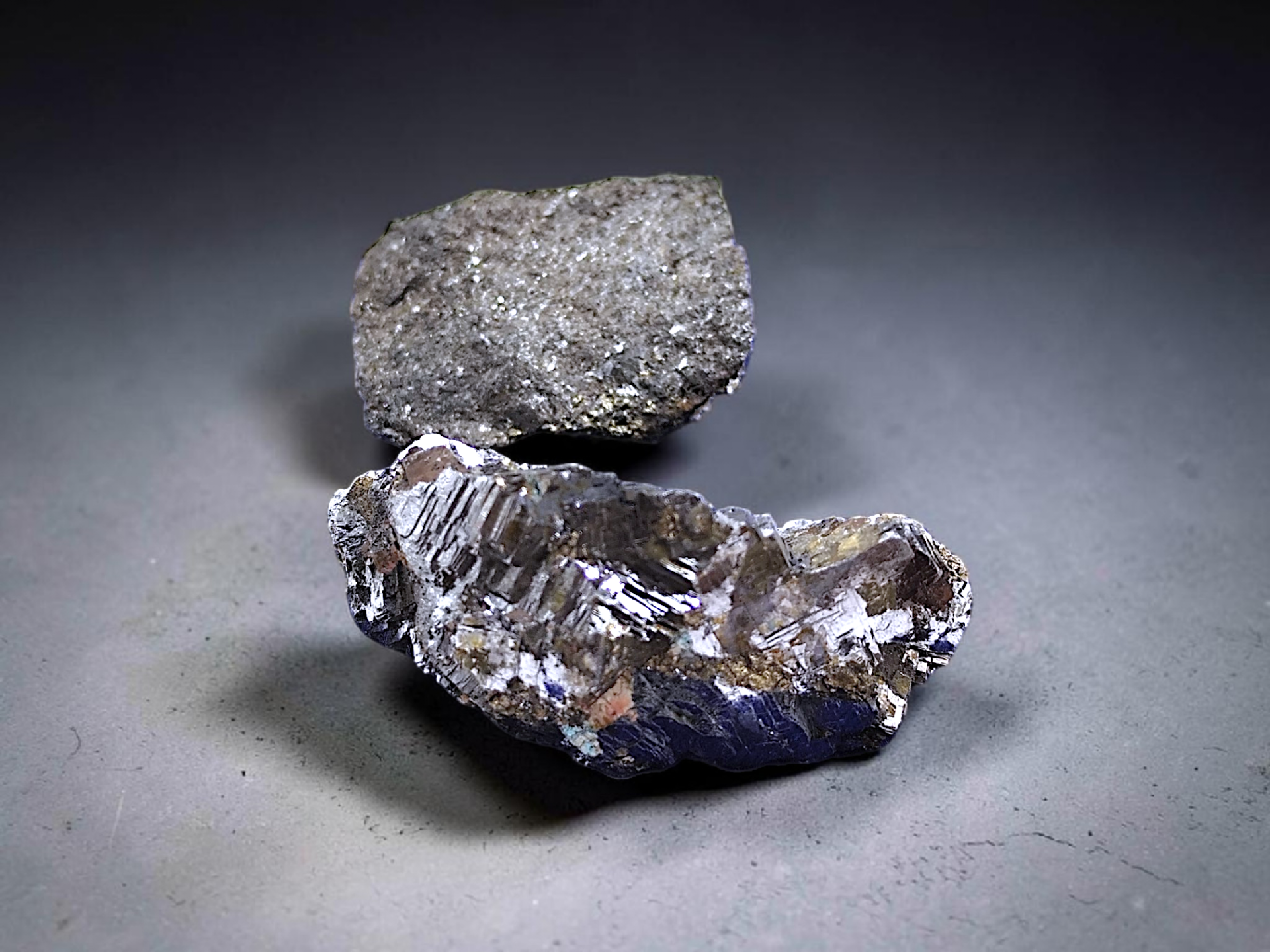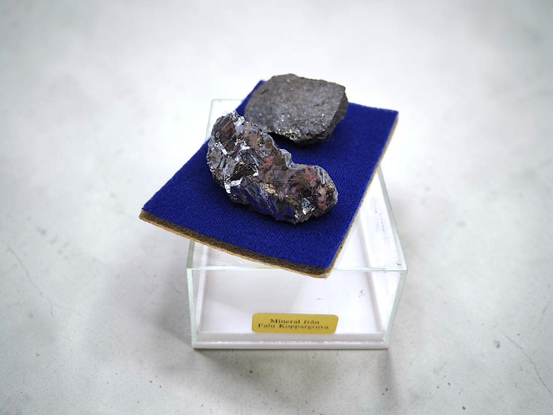 Mineral stones from Falu Copper Mine. One stone is not attached to the blue piece of cloth. The other stone is attached to the piece of cloth. The stones come in a transparent box.