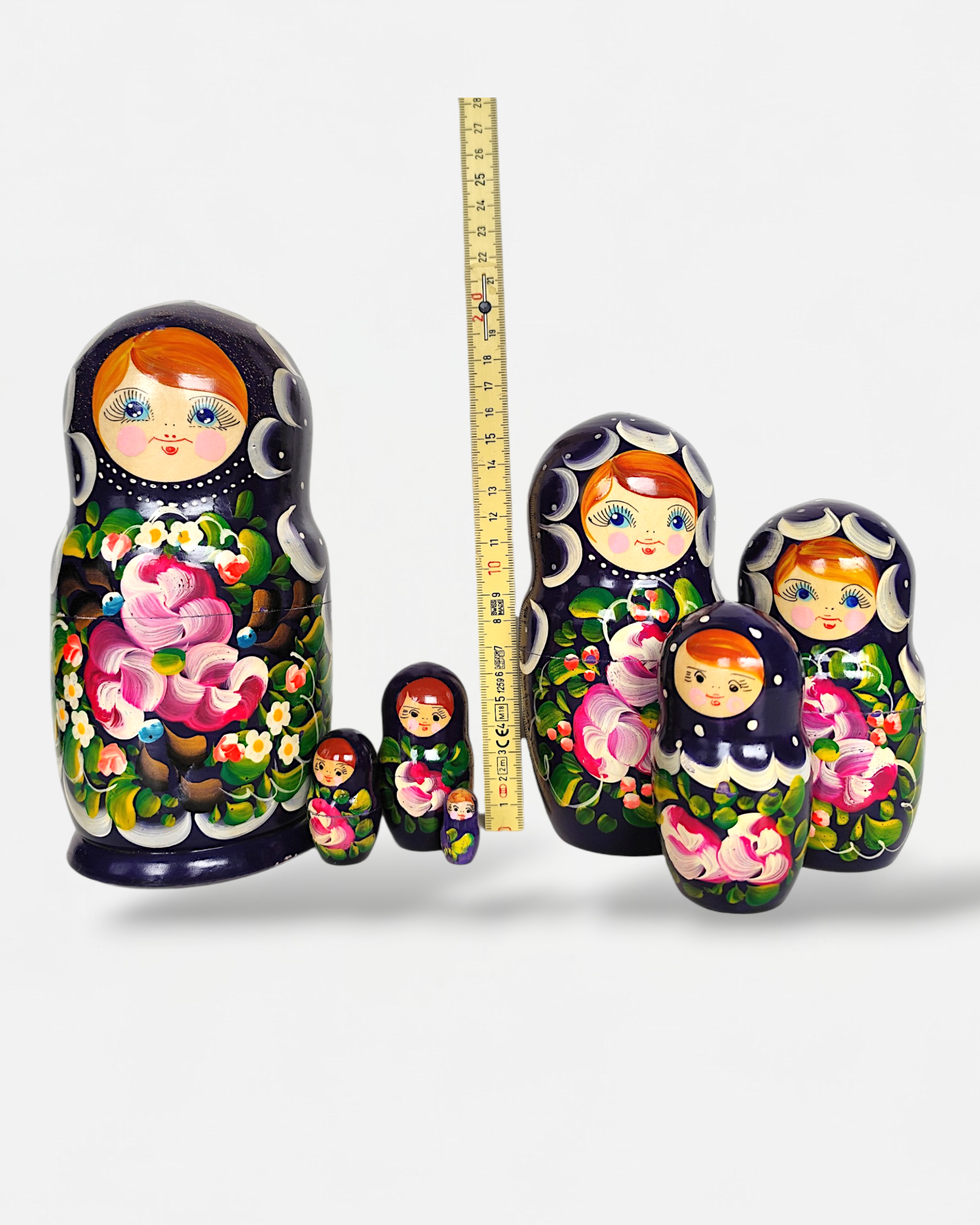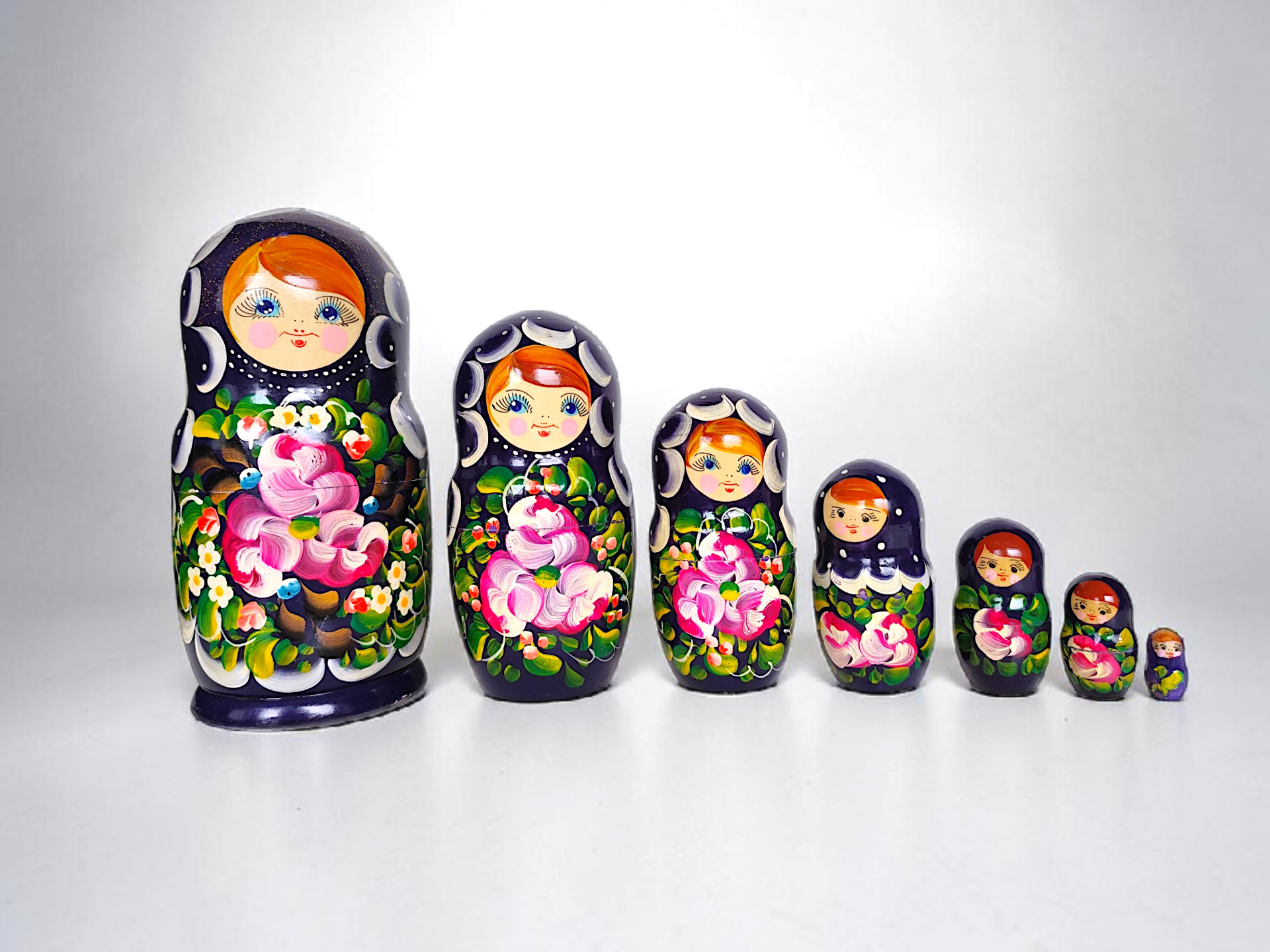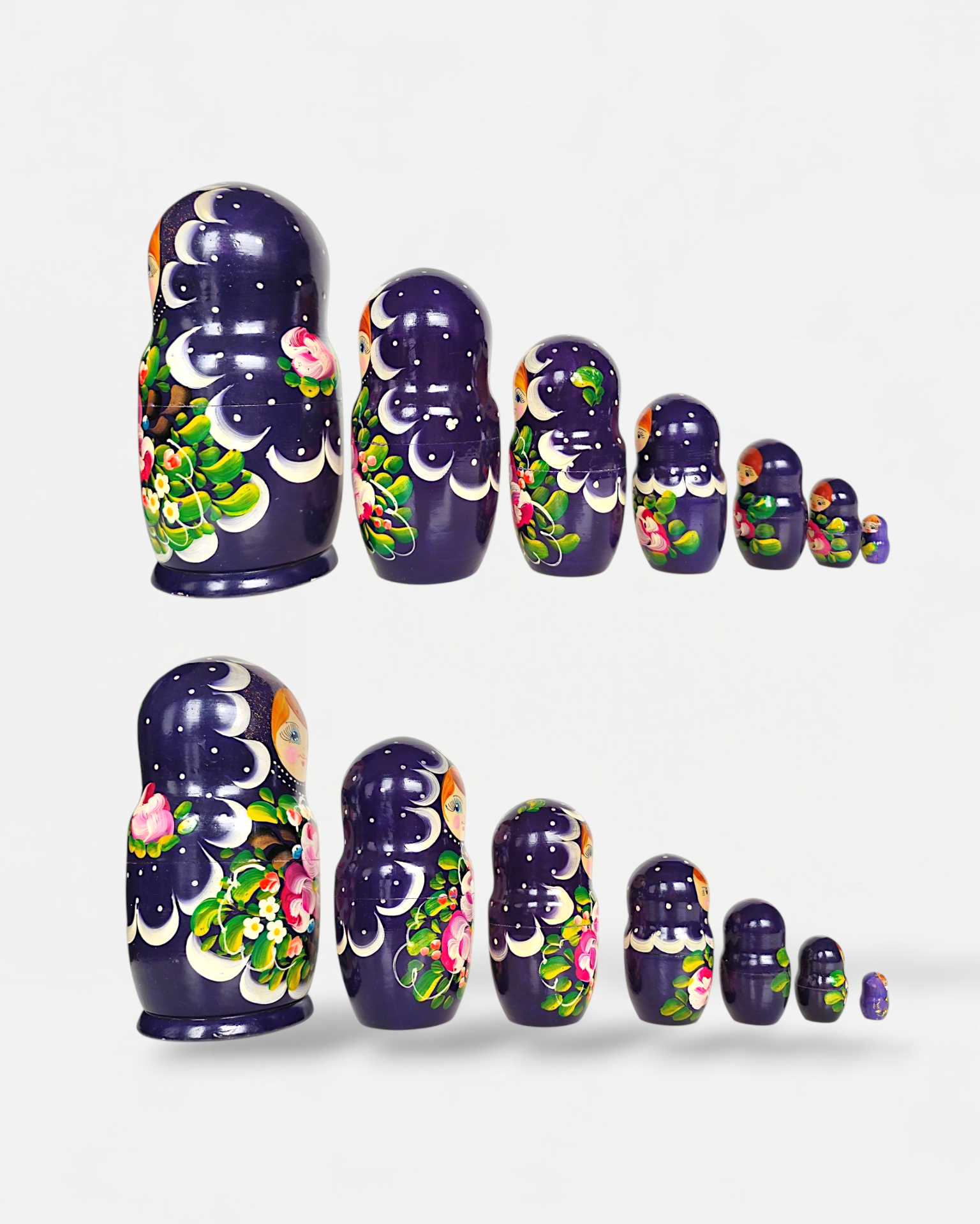 A doll consisting of 7 dolls in total. The Russian (Matryoshka, Babushka) dolls are made of wood and hand-painted in purple, pink, green and white. The patterns on the dolls depict motifs of flowers.