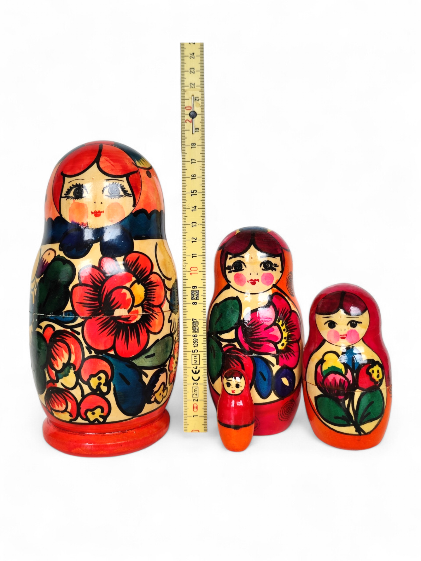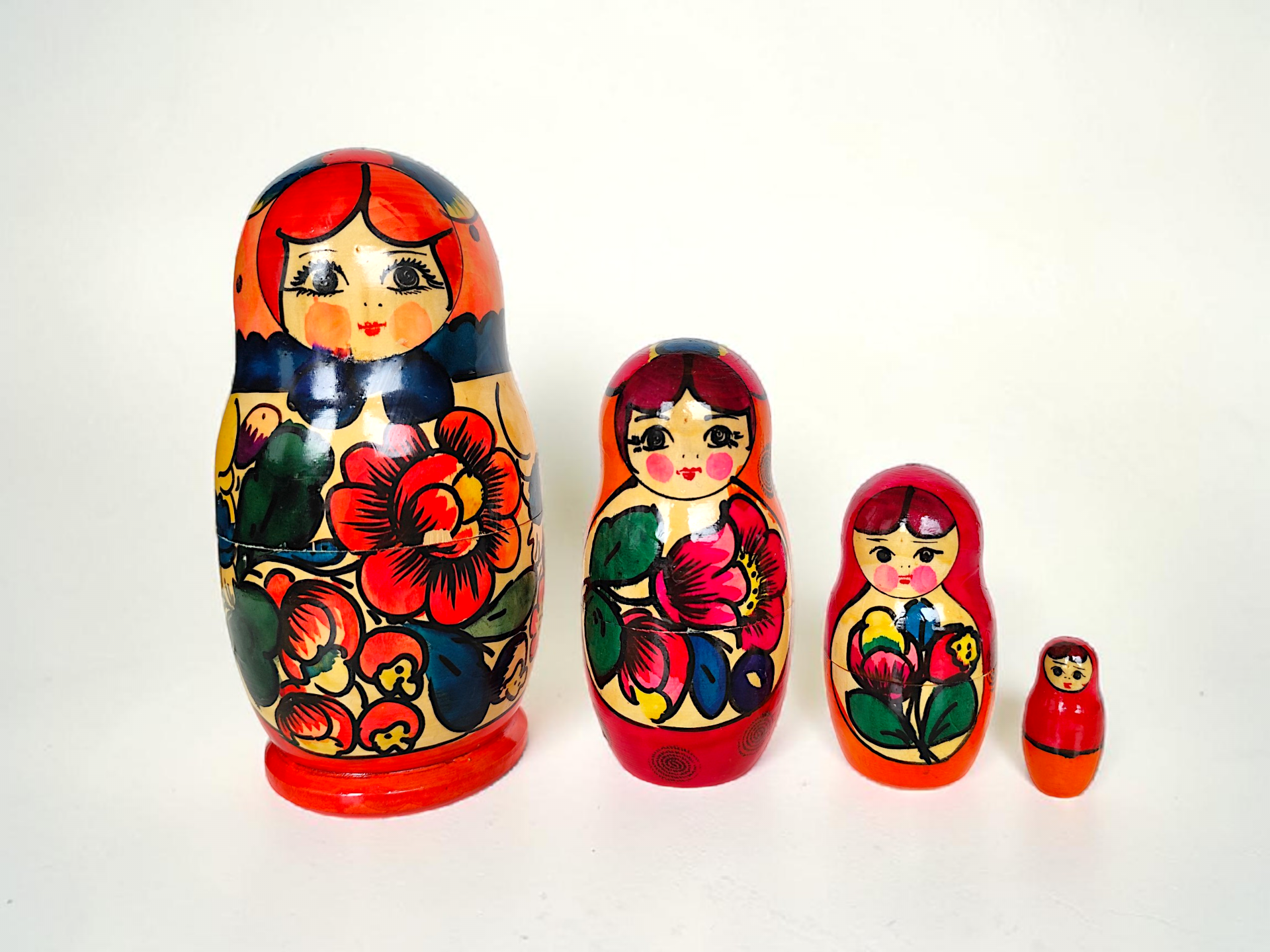 A doll consisting of 4 dolls in total. The Russian (Matryoshka, Babushka) dolls are made of wood and hand-painted in pink, red, and black. The patterns on the dolls depict motifs of flowers.