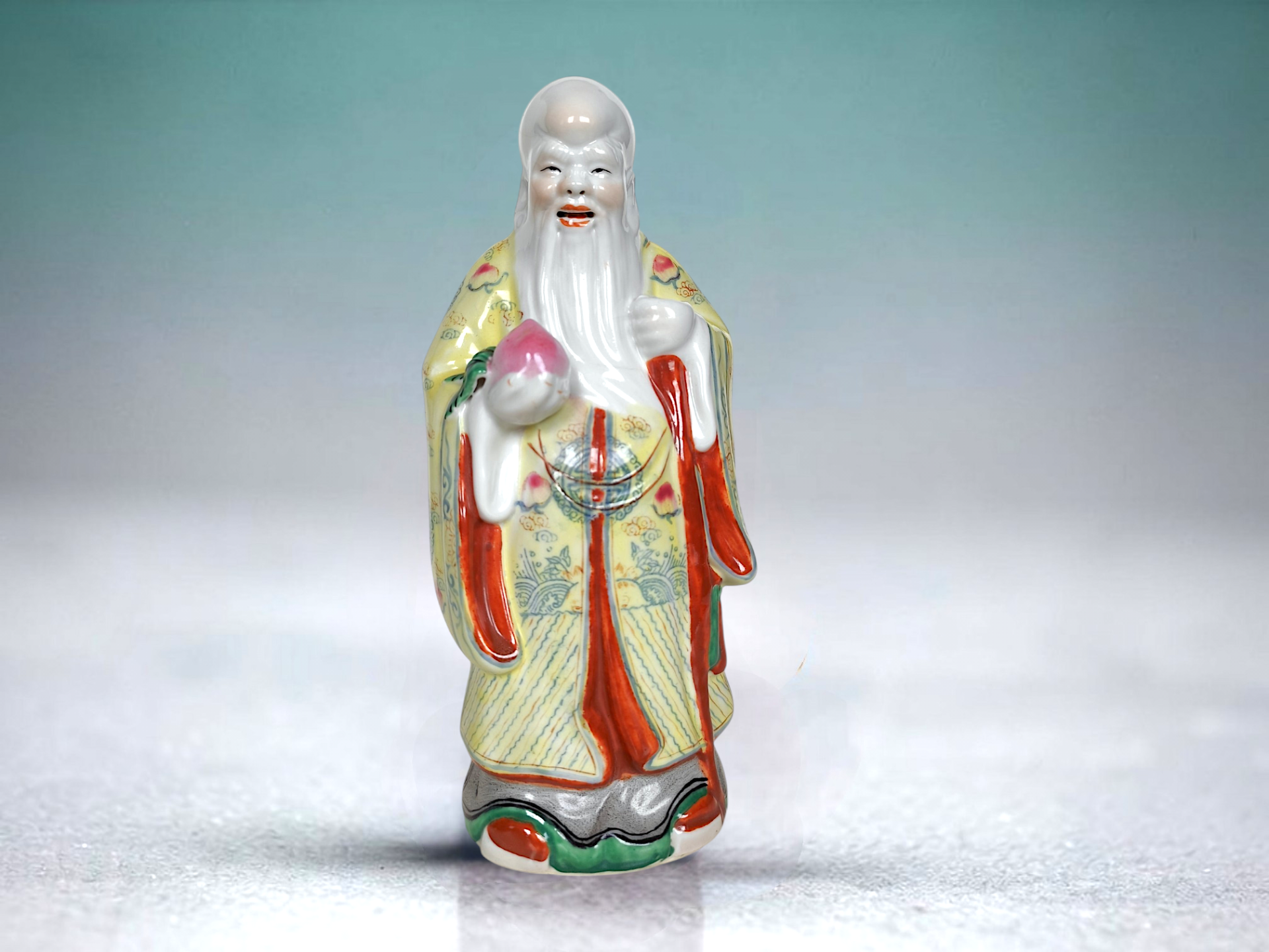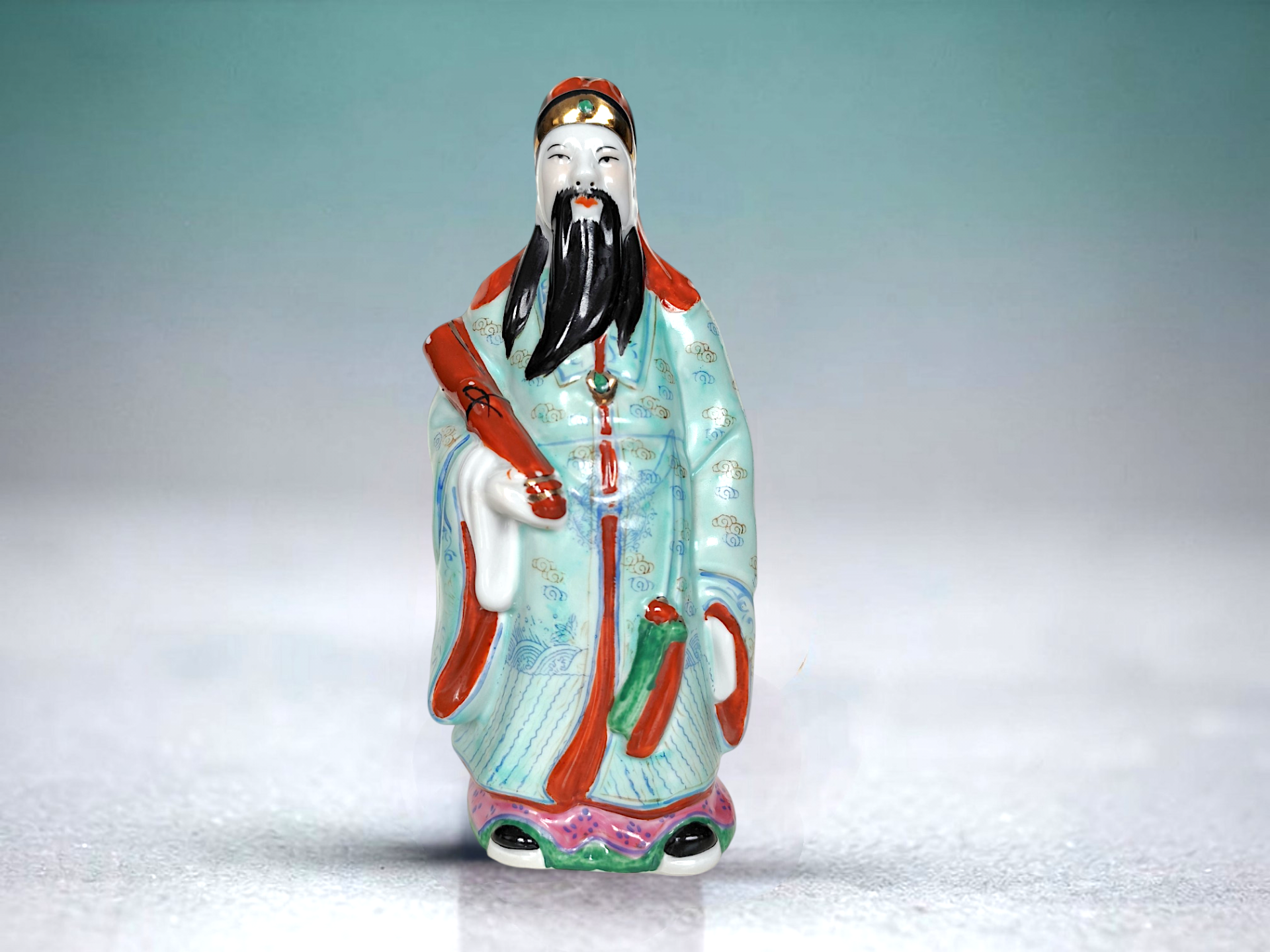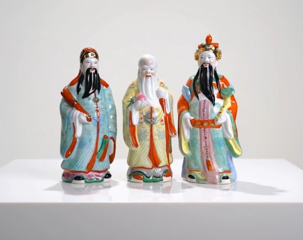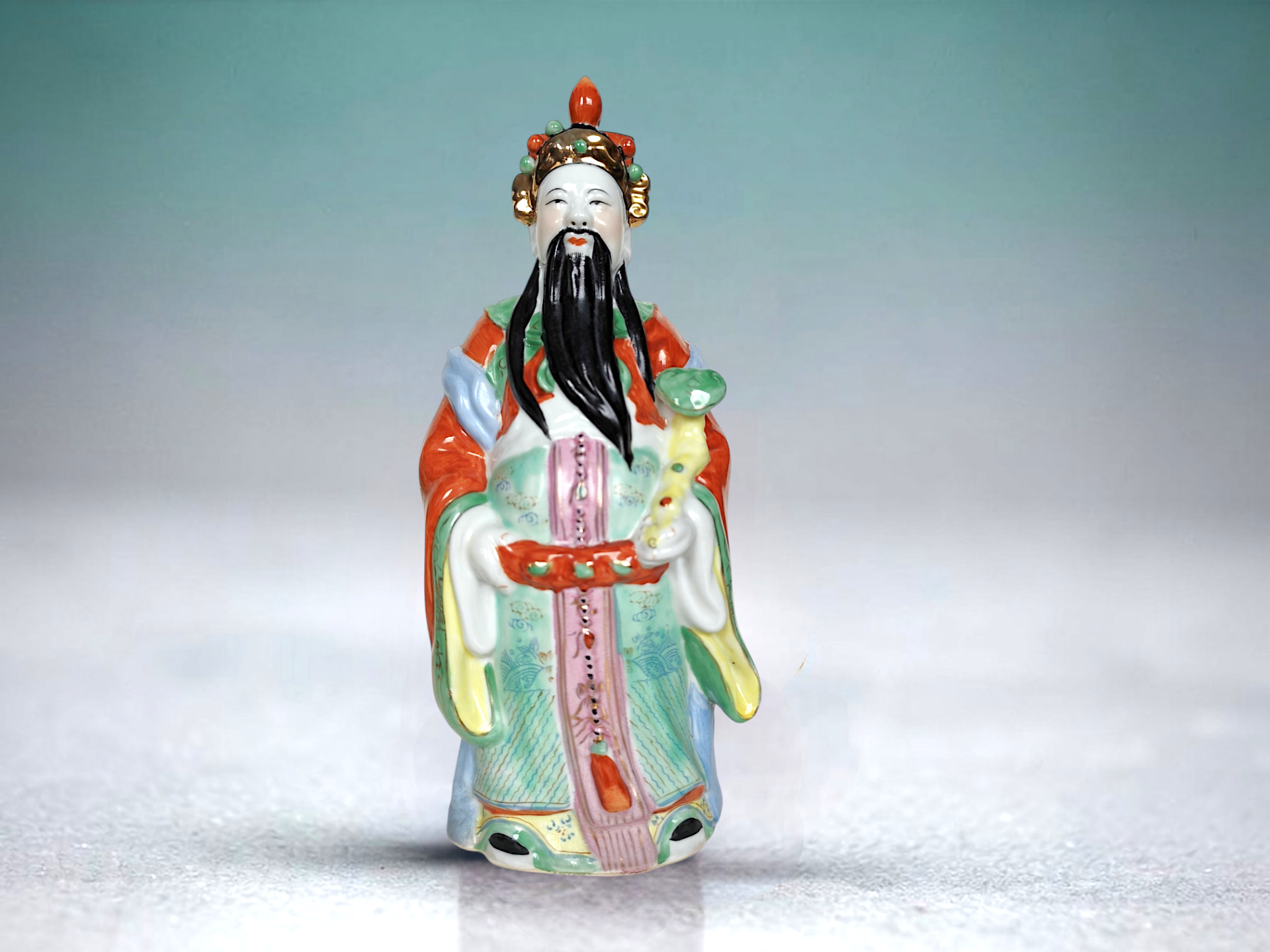 Three porcelain figurines depicting the mythological stargods of China and Japan. These Sanxing figurines depict Fu, Shou and Lu