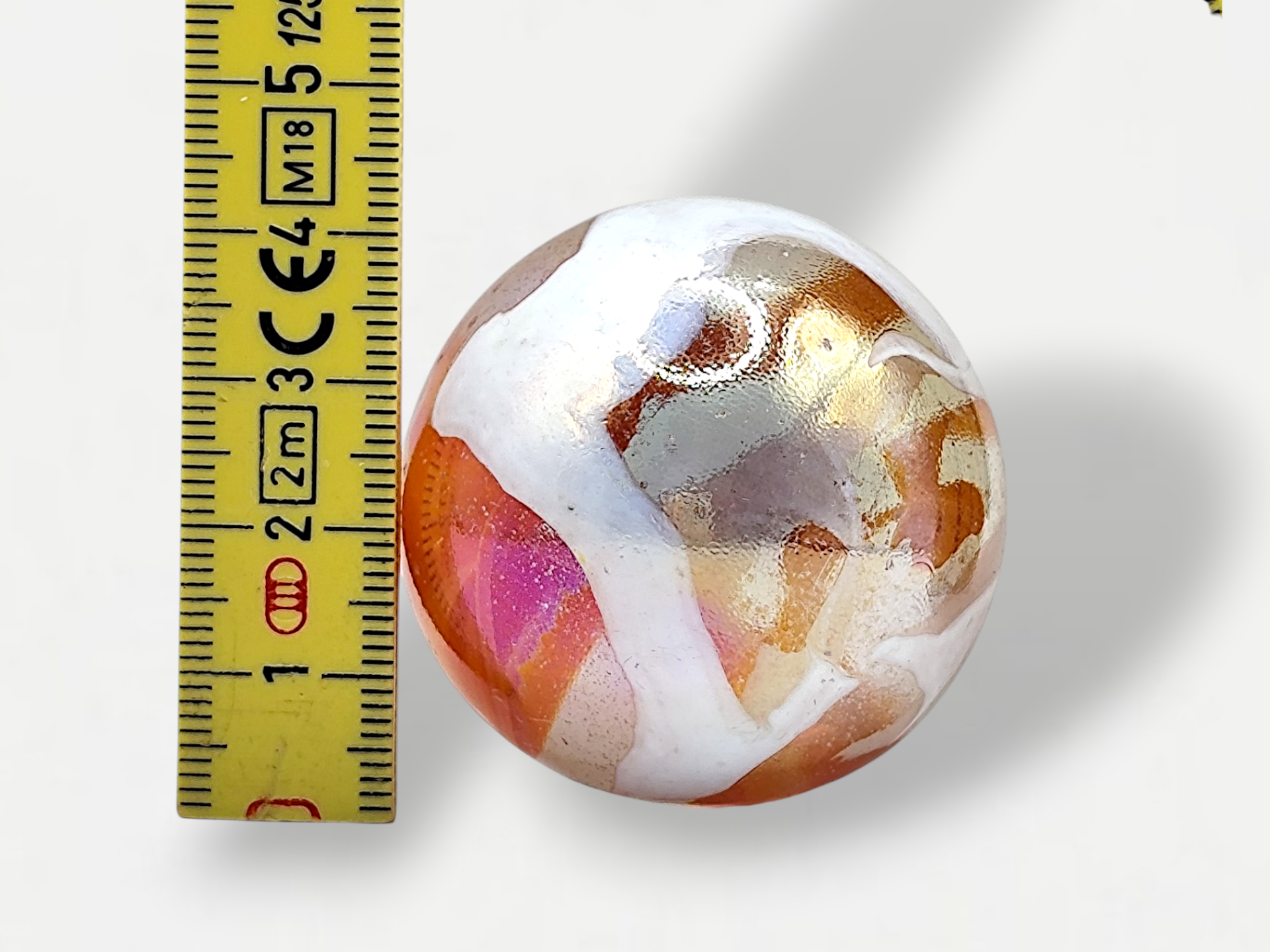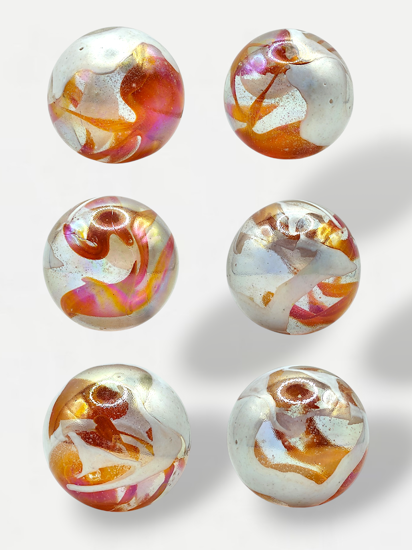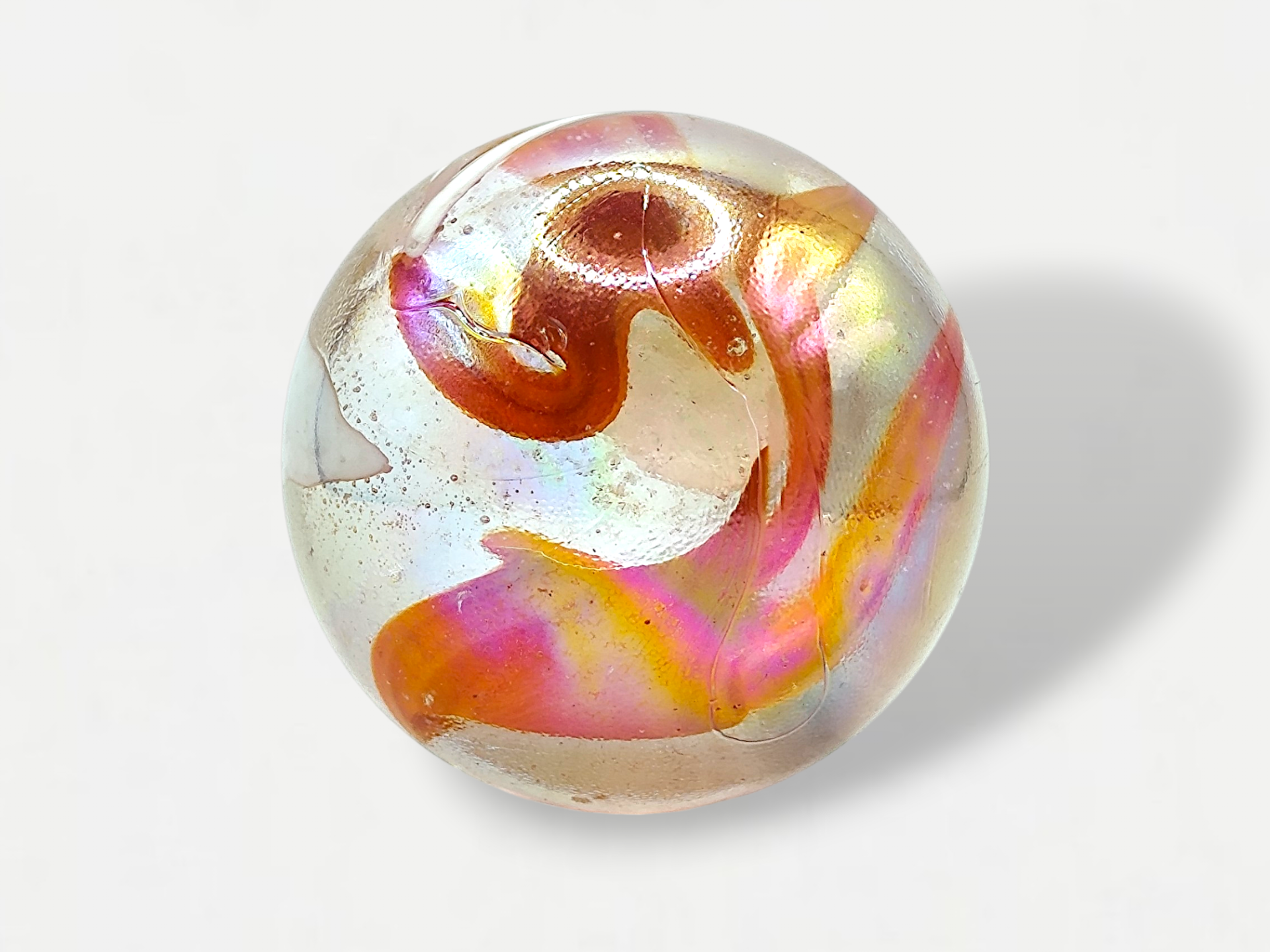 Design: It is made of clear, often iridescent glass with swirls of orange, red, and white.