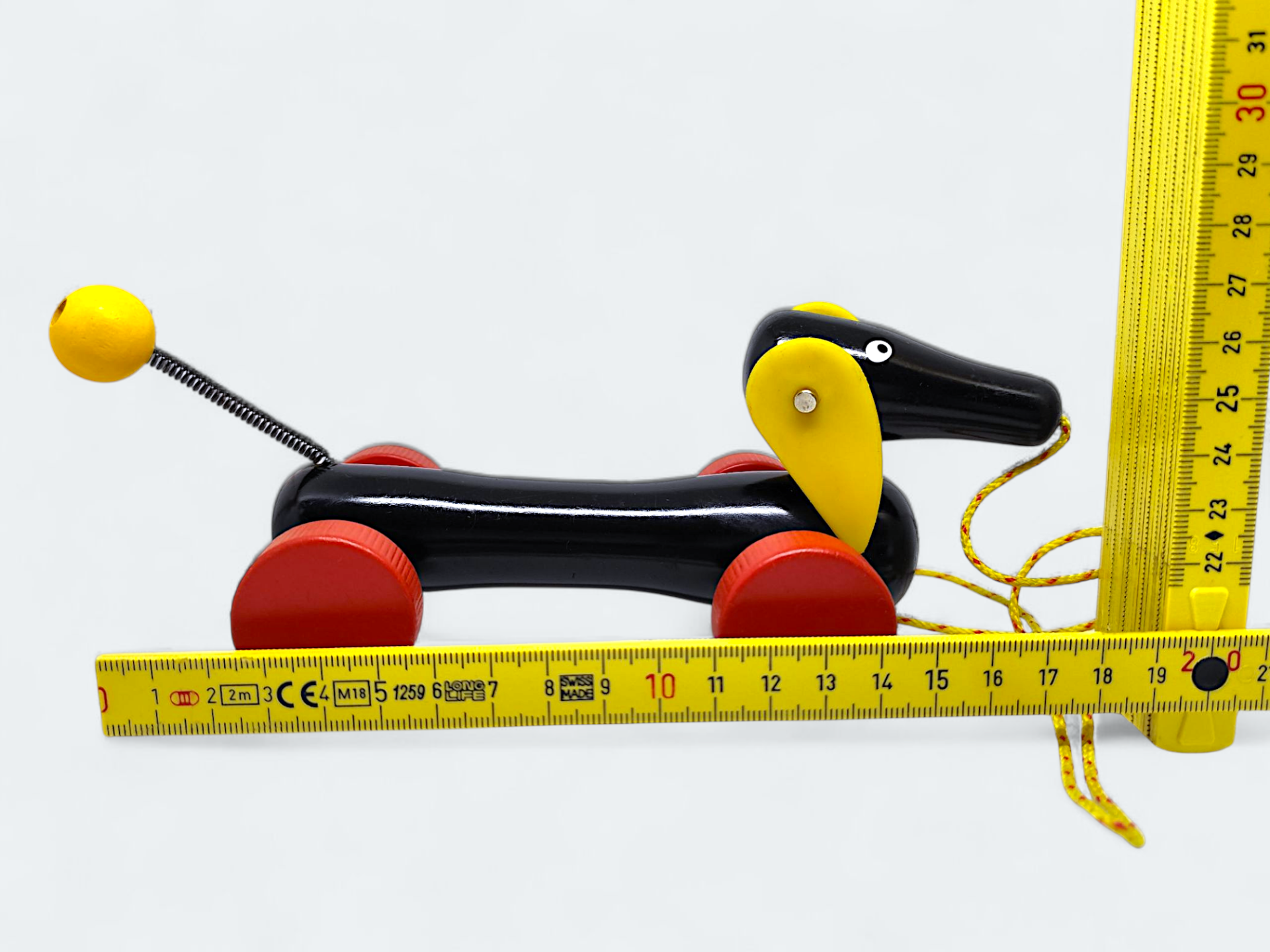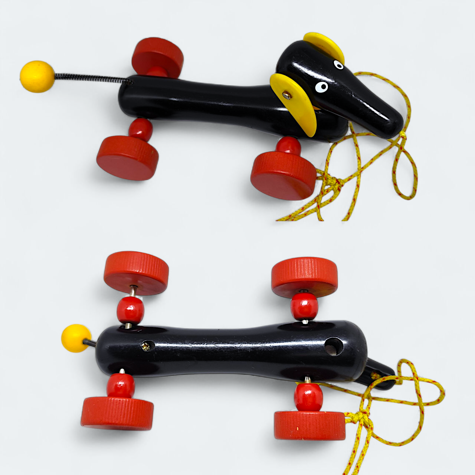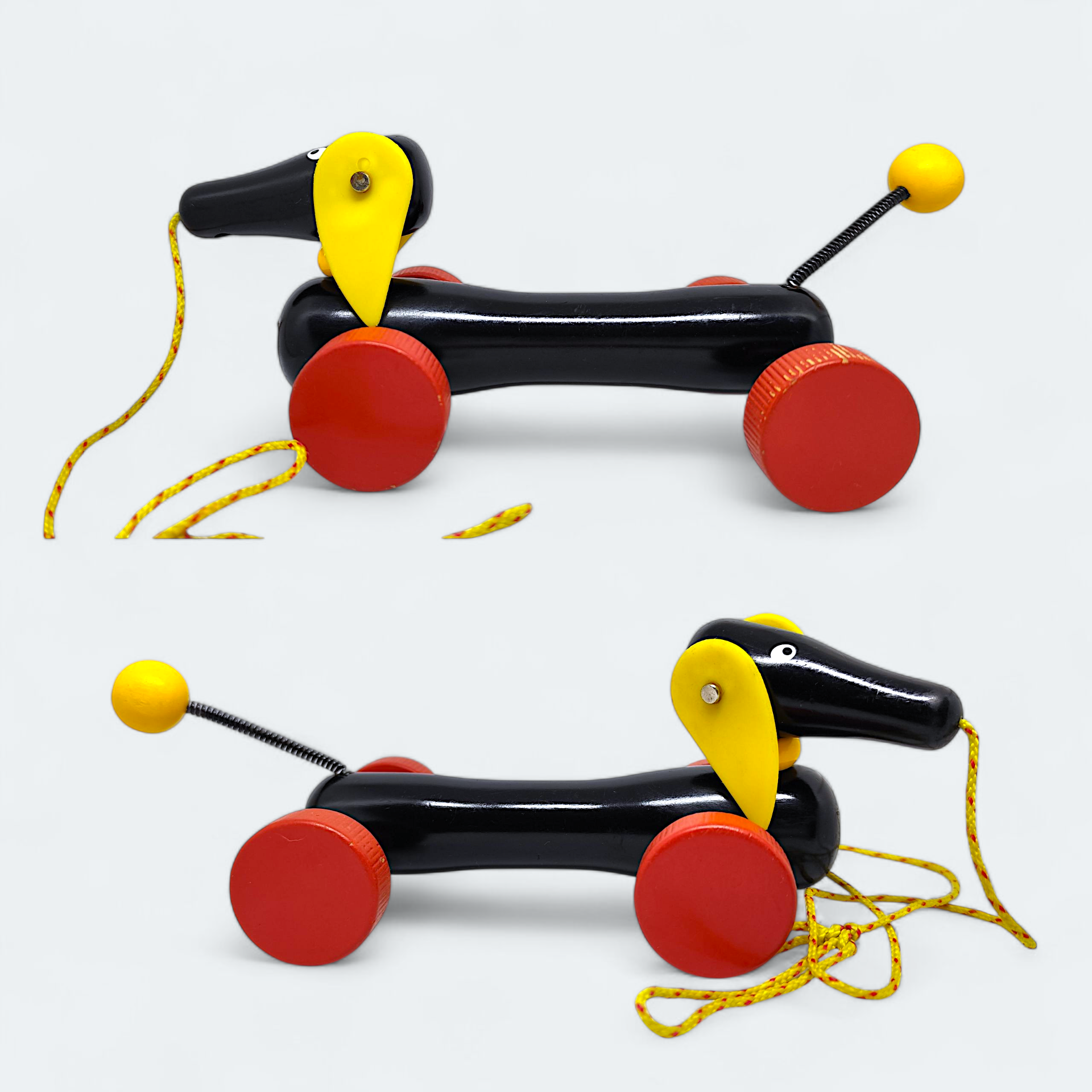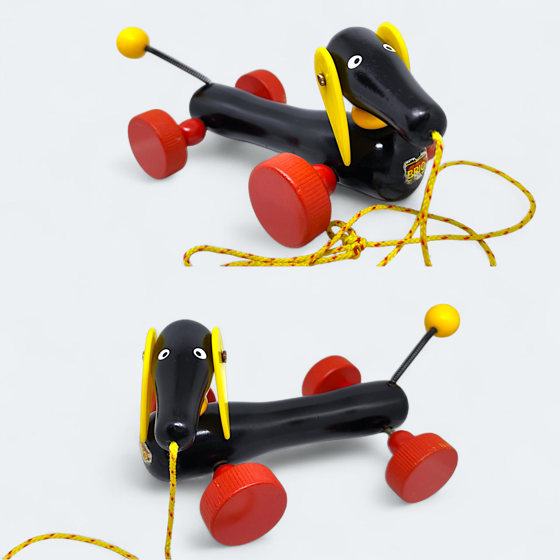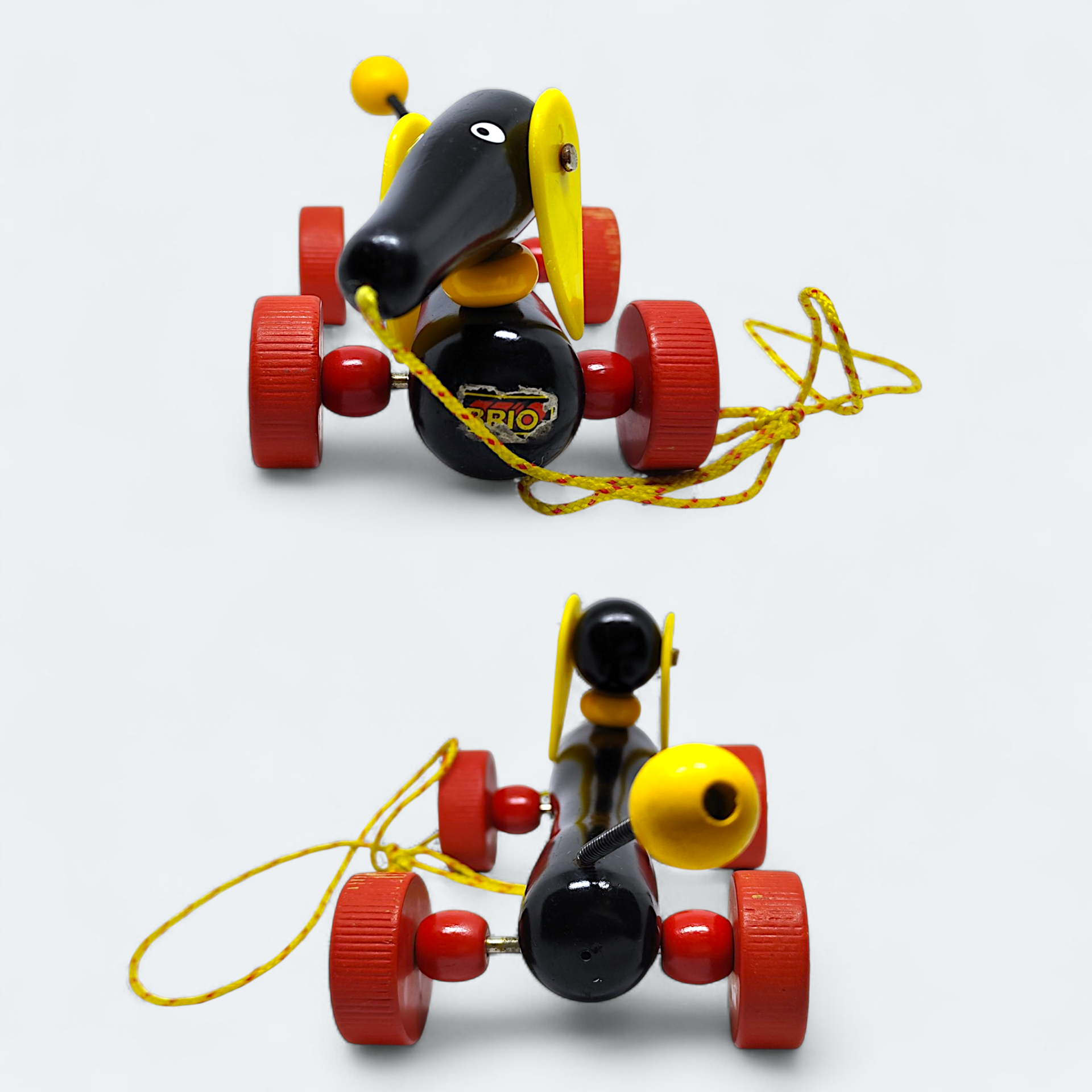 A Classic BRIO wooden dog pull toy with asymmetrical wheels and a swinging tail, head and ears. Suitable for children from 12 months.