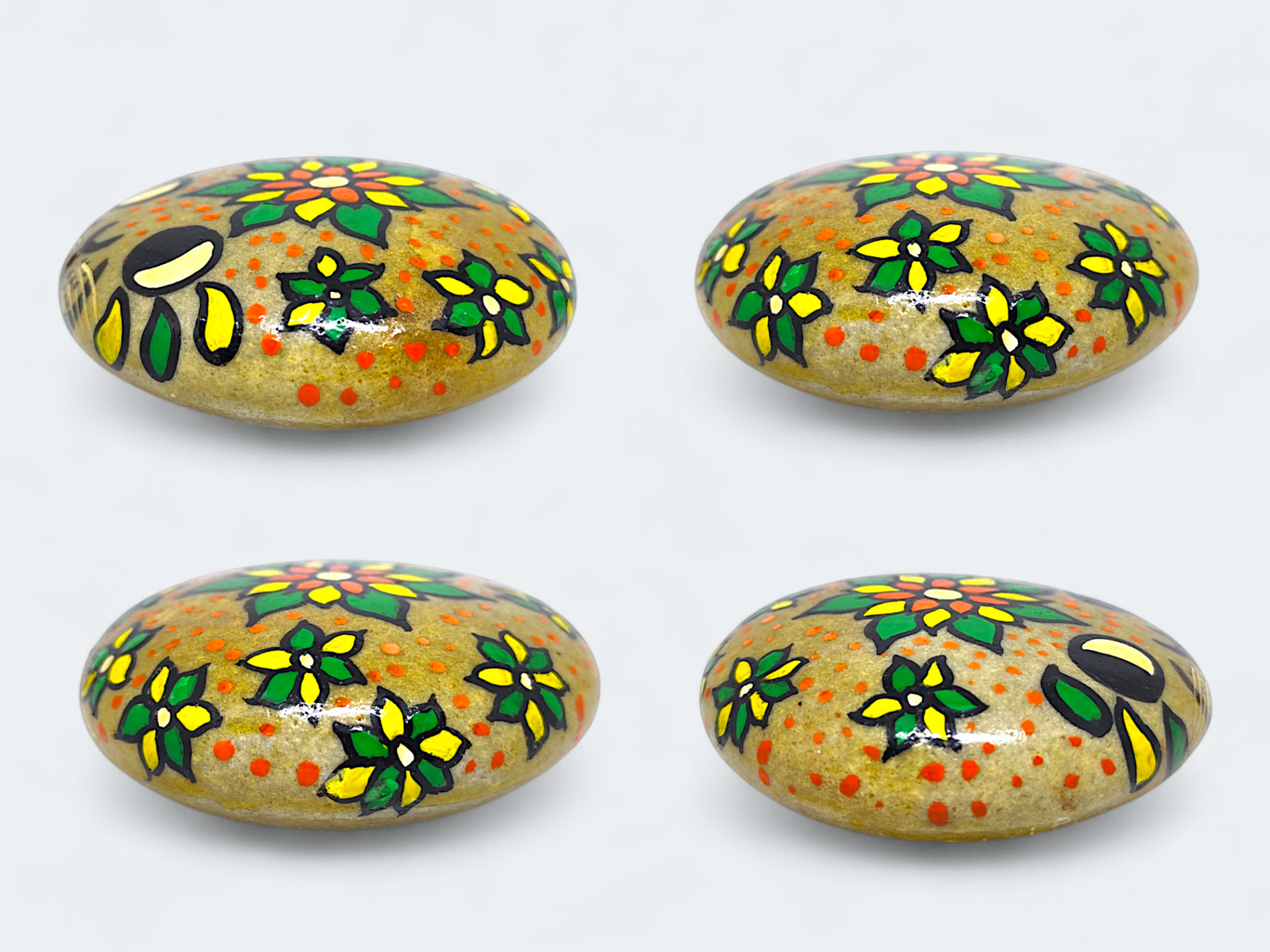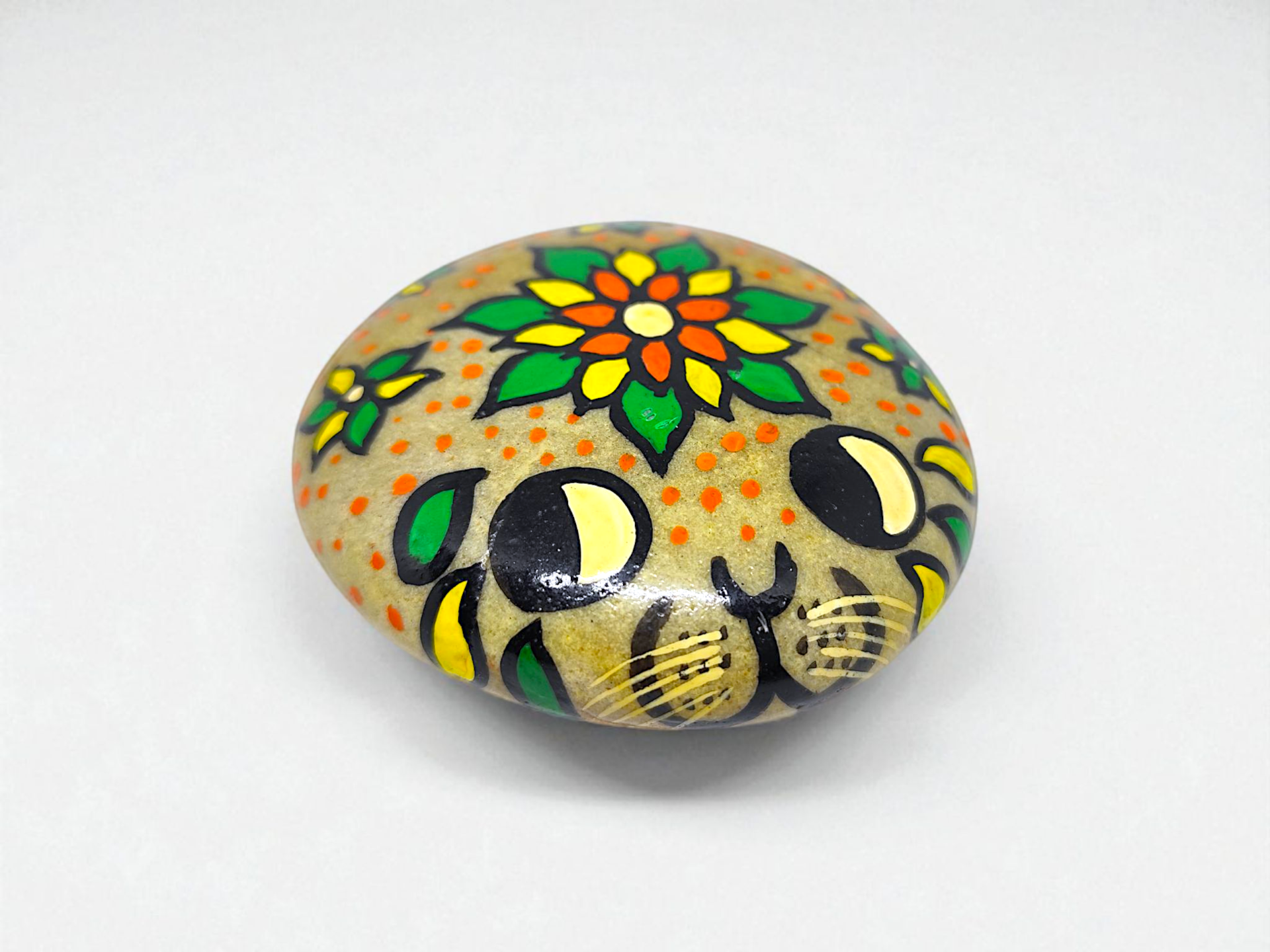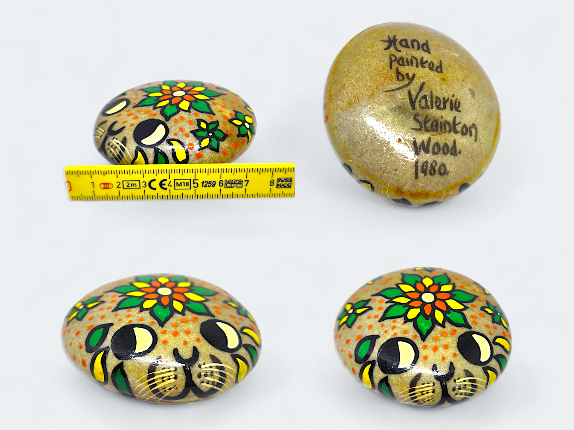 A hand-painted stone that is a work of art created by Valerie Stainton Wood in 1980. The stone depicts a seal swimming to the surface. Signed at the bottom.
