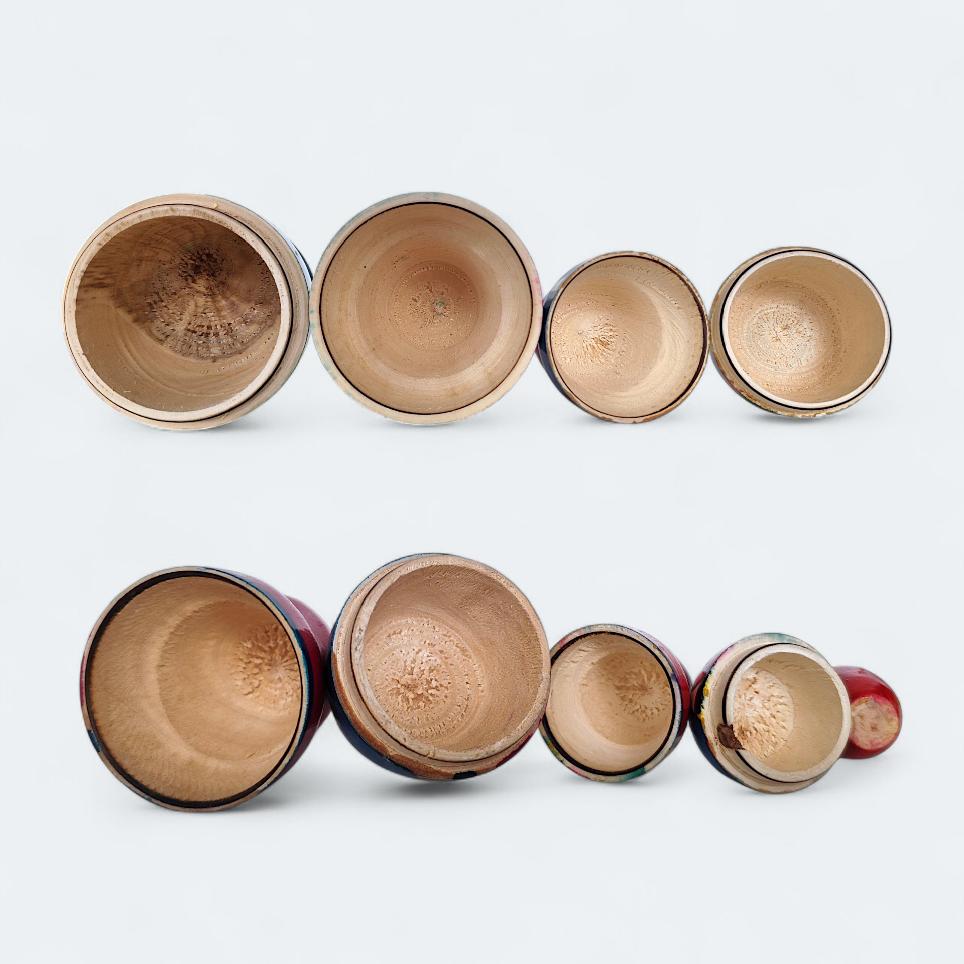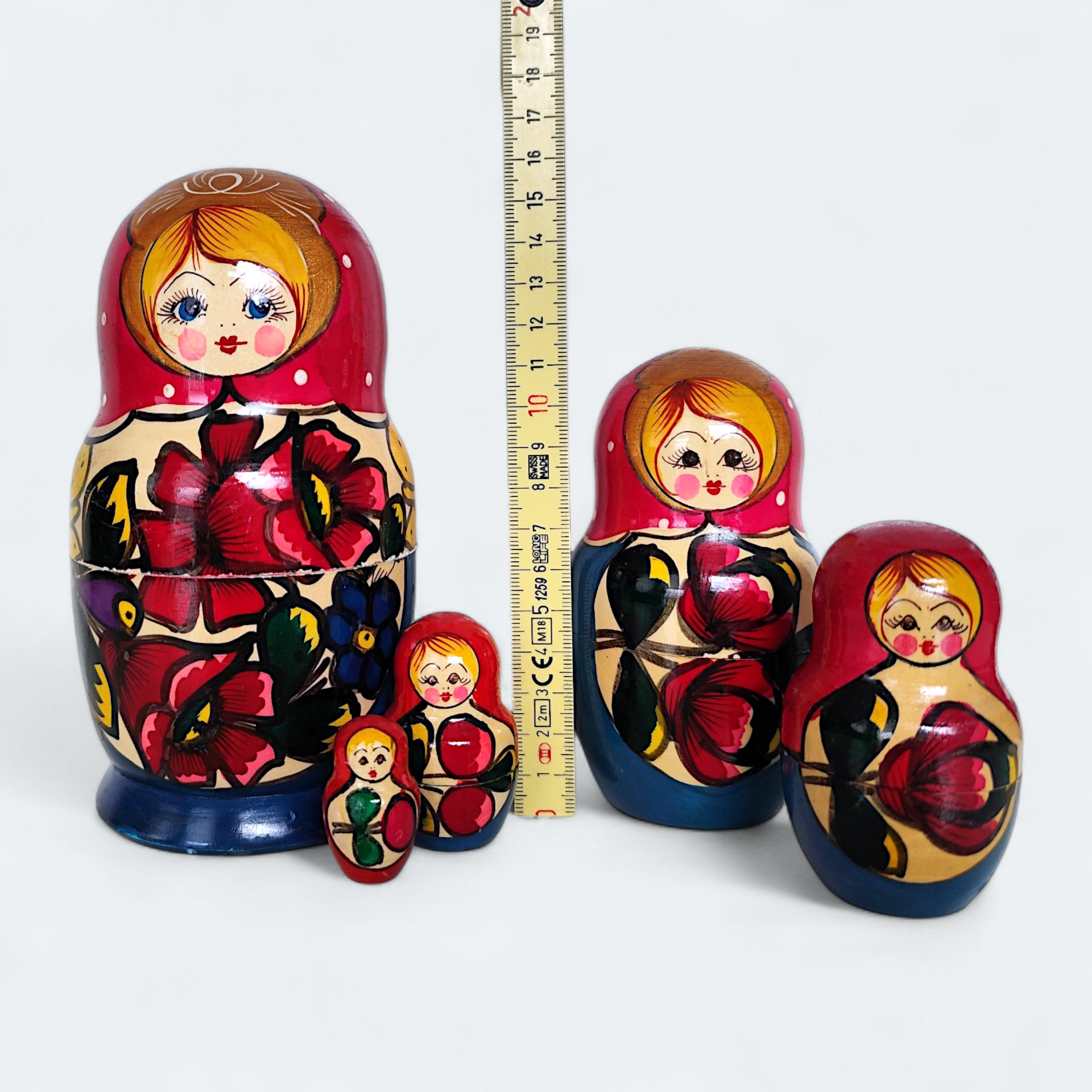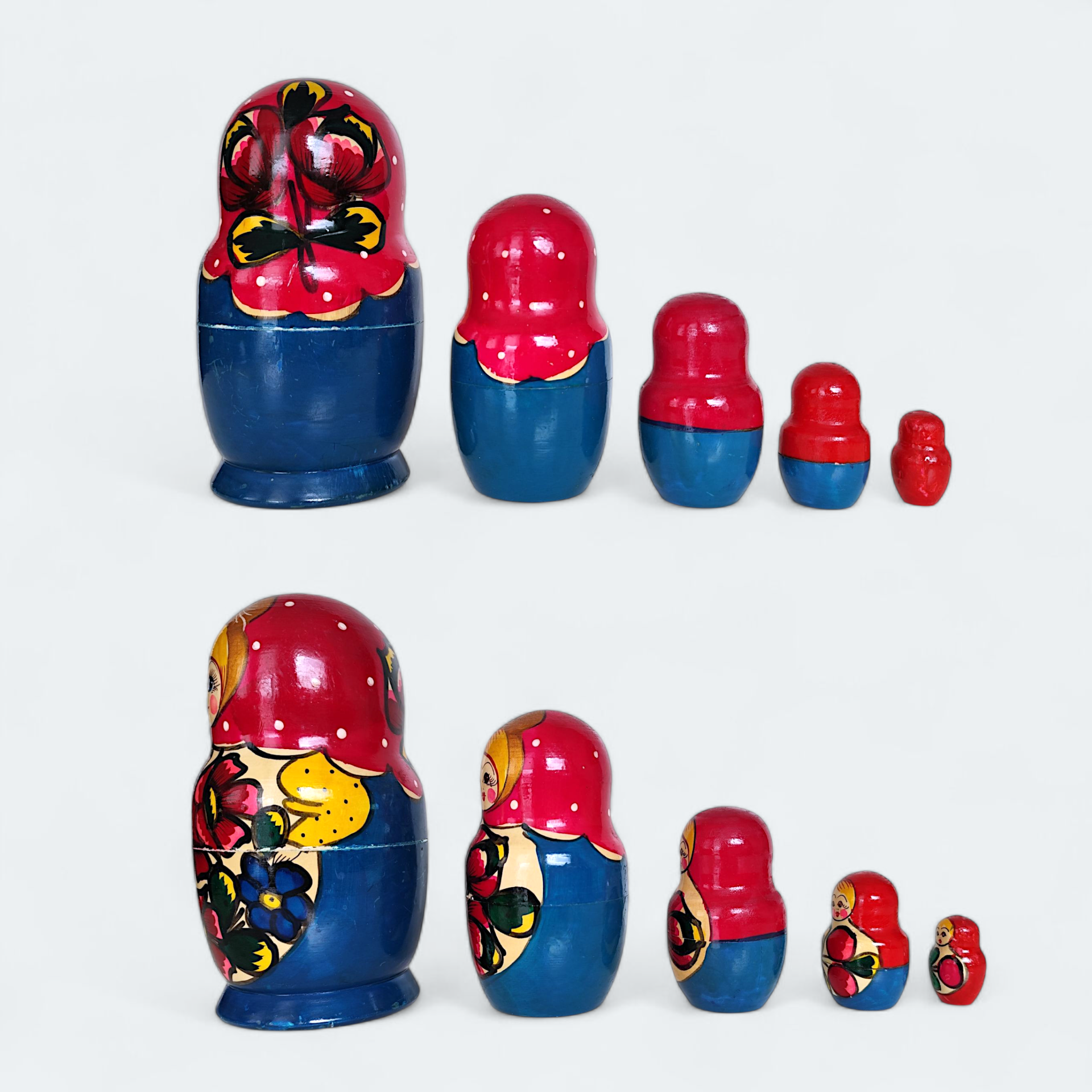 Stackable handmade wooden Russian doll consisting of a total of 5 dolls that stack inside each other. Also known as matryoshka/babushka.