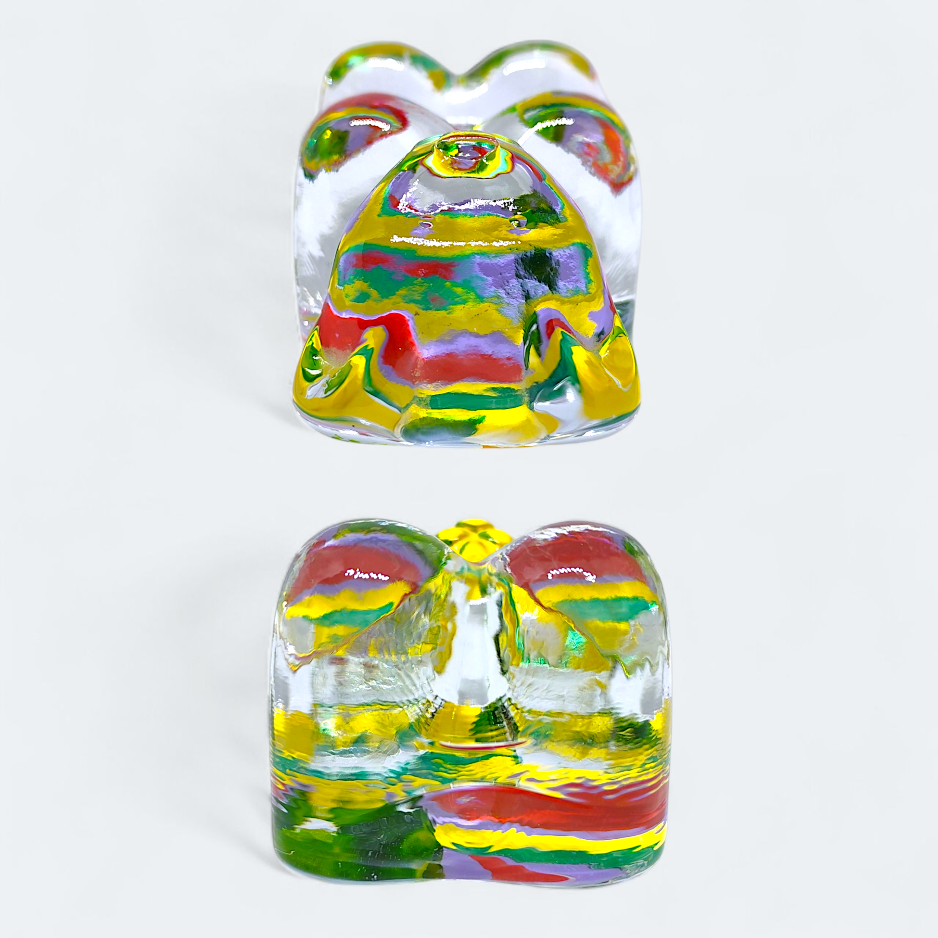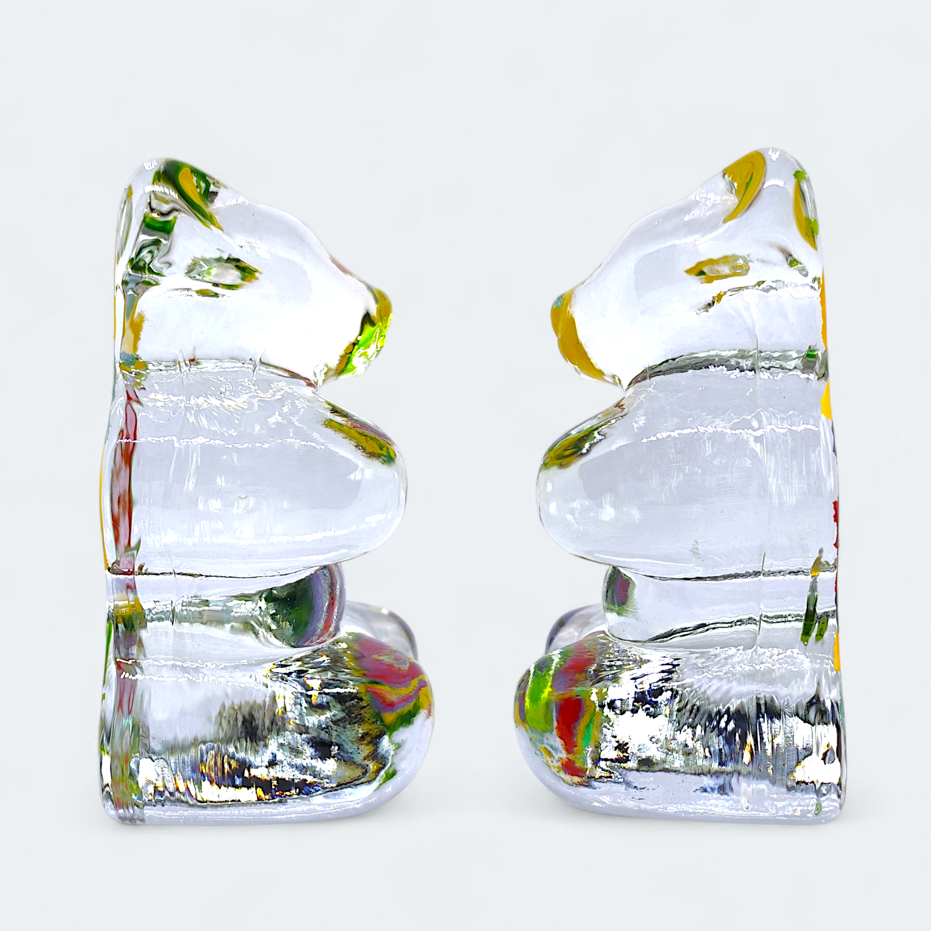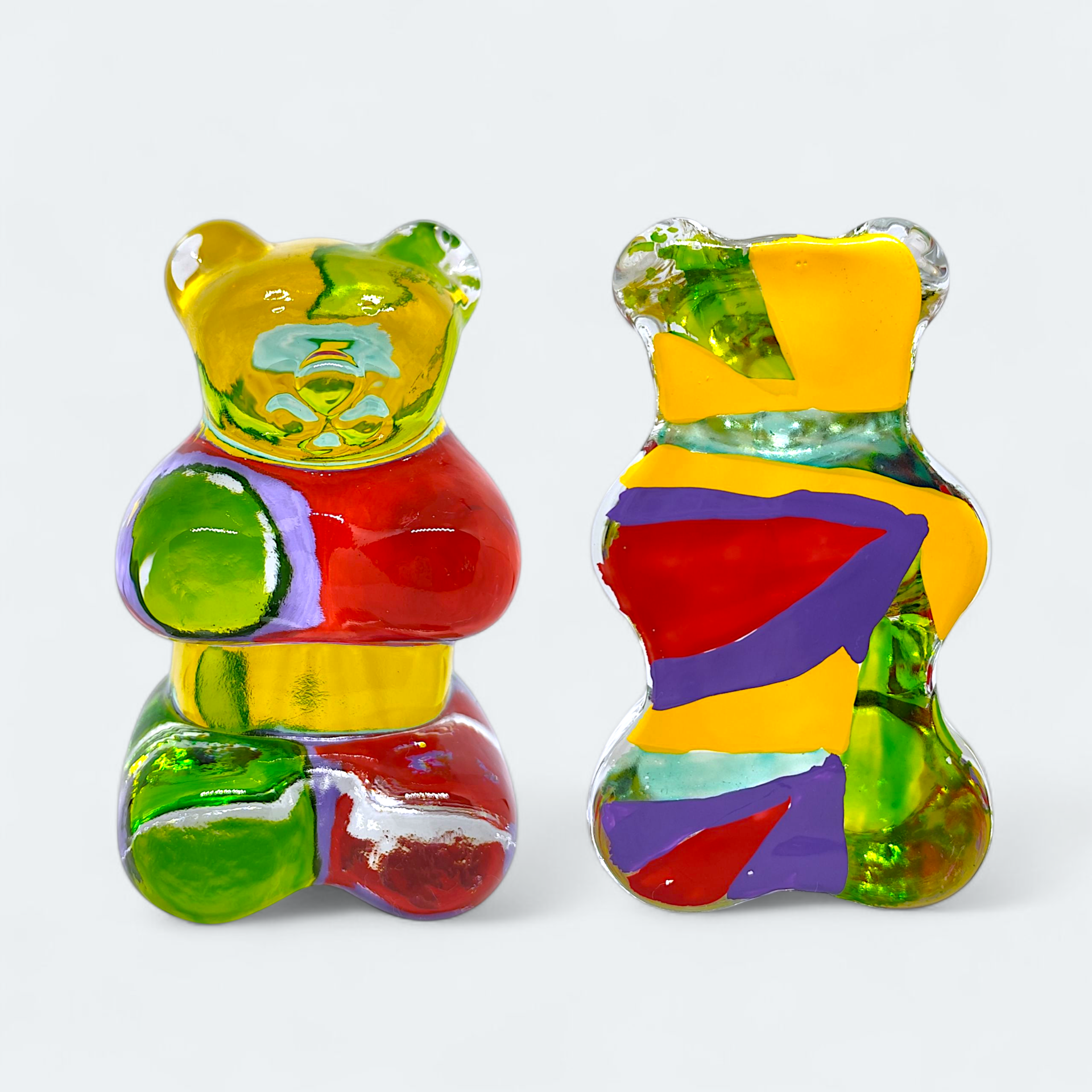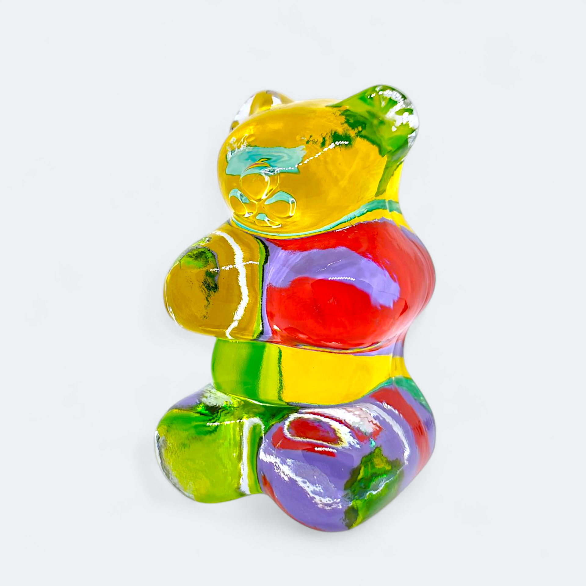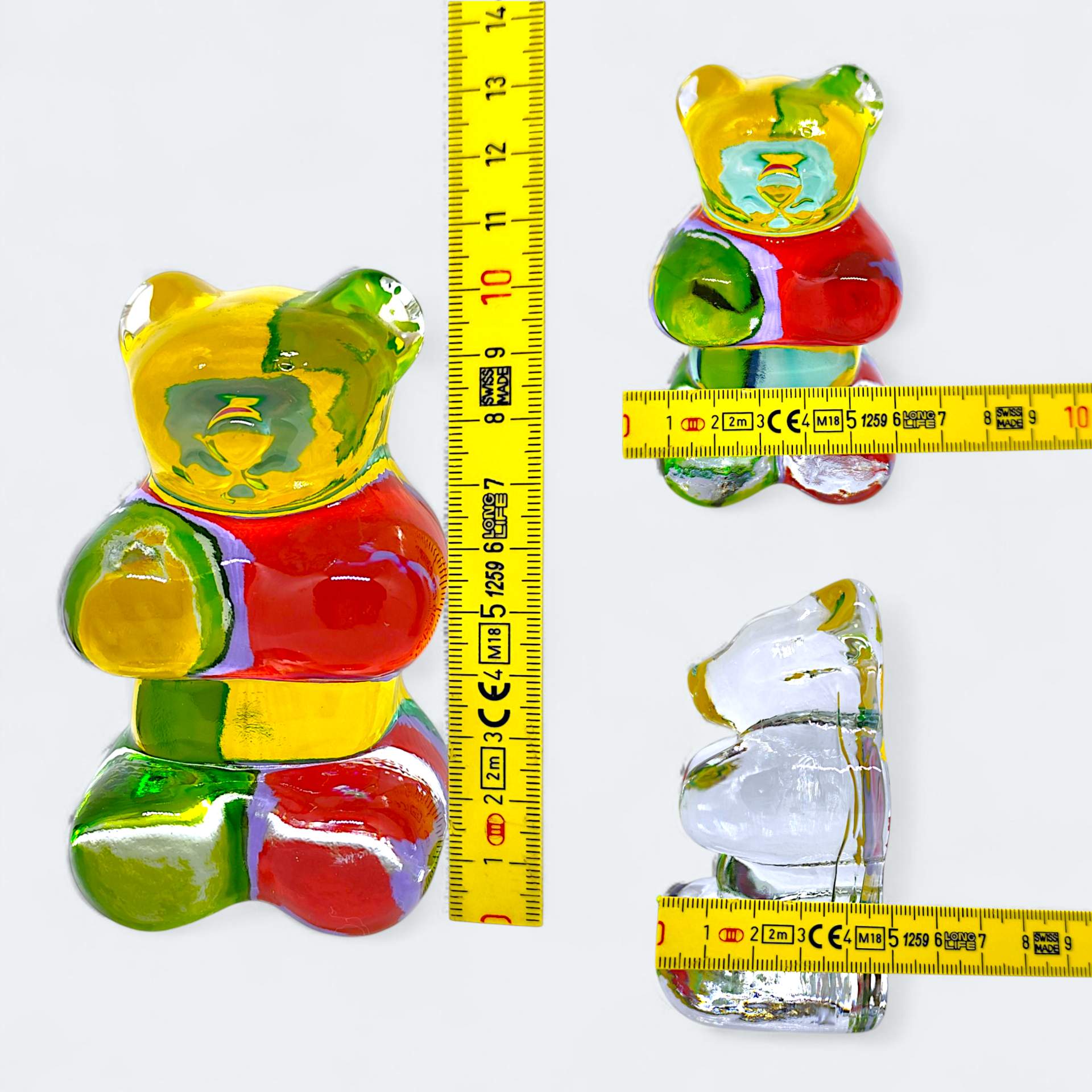 A vintage 90s glass bear depicting a candy gummy bear. Made of Leonardo glass. Hand painted in different colors on the back. This makes you feel that the bear changes color depending on how it is facing the sun/light.